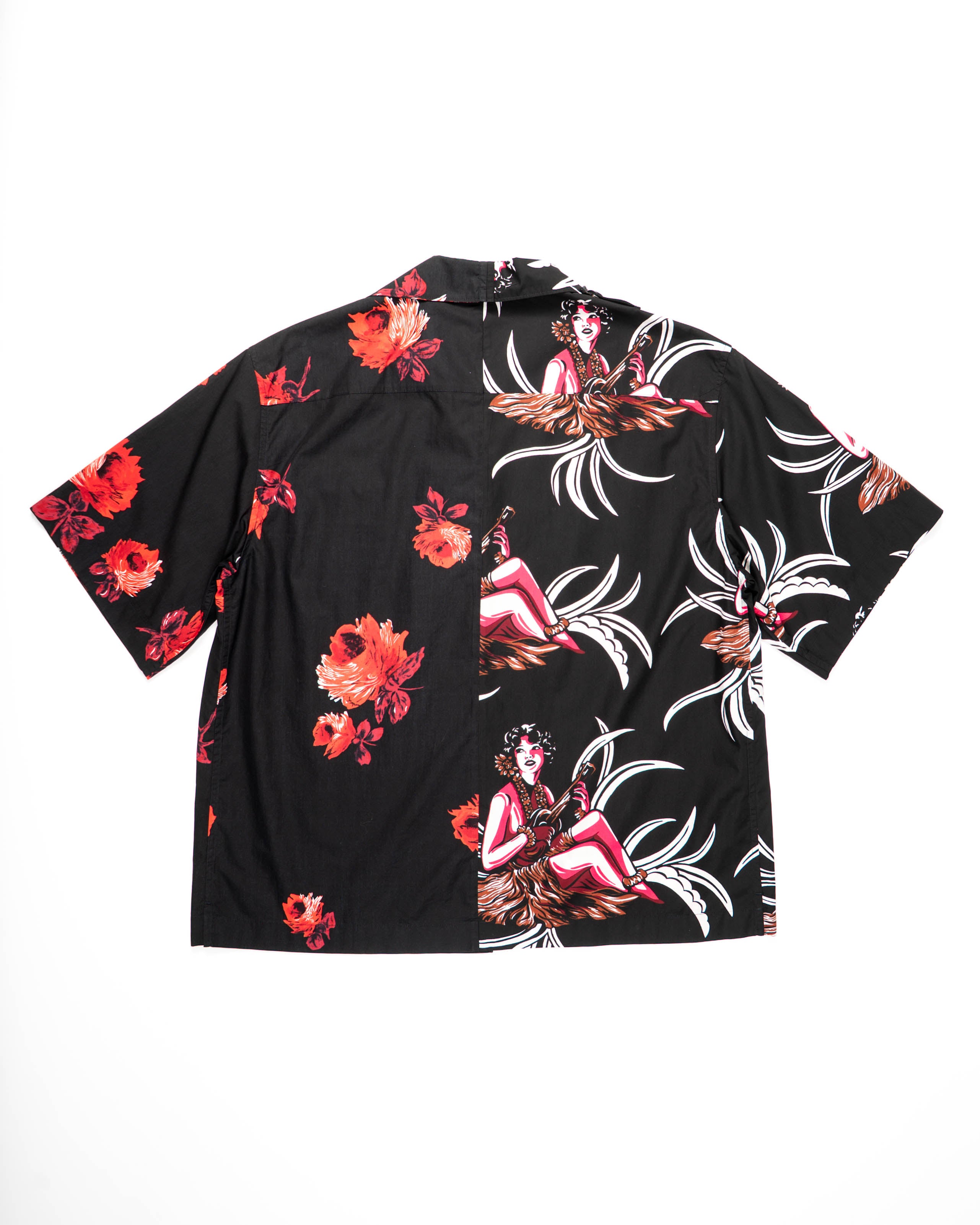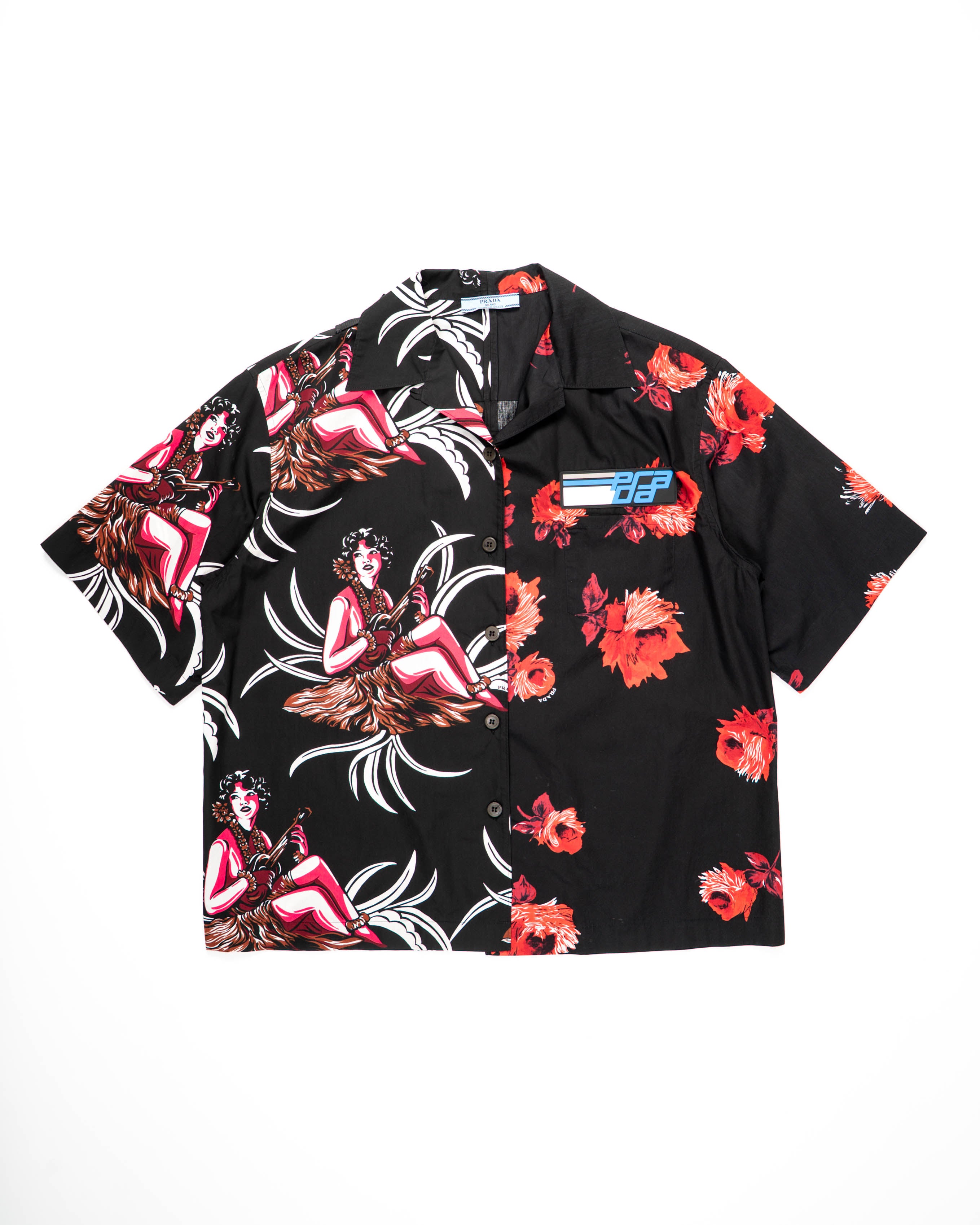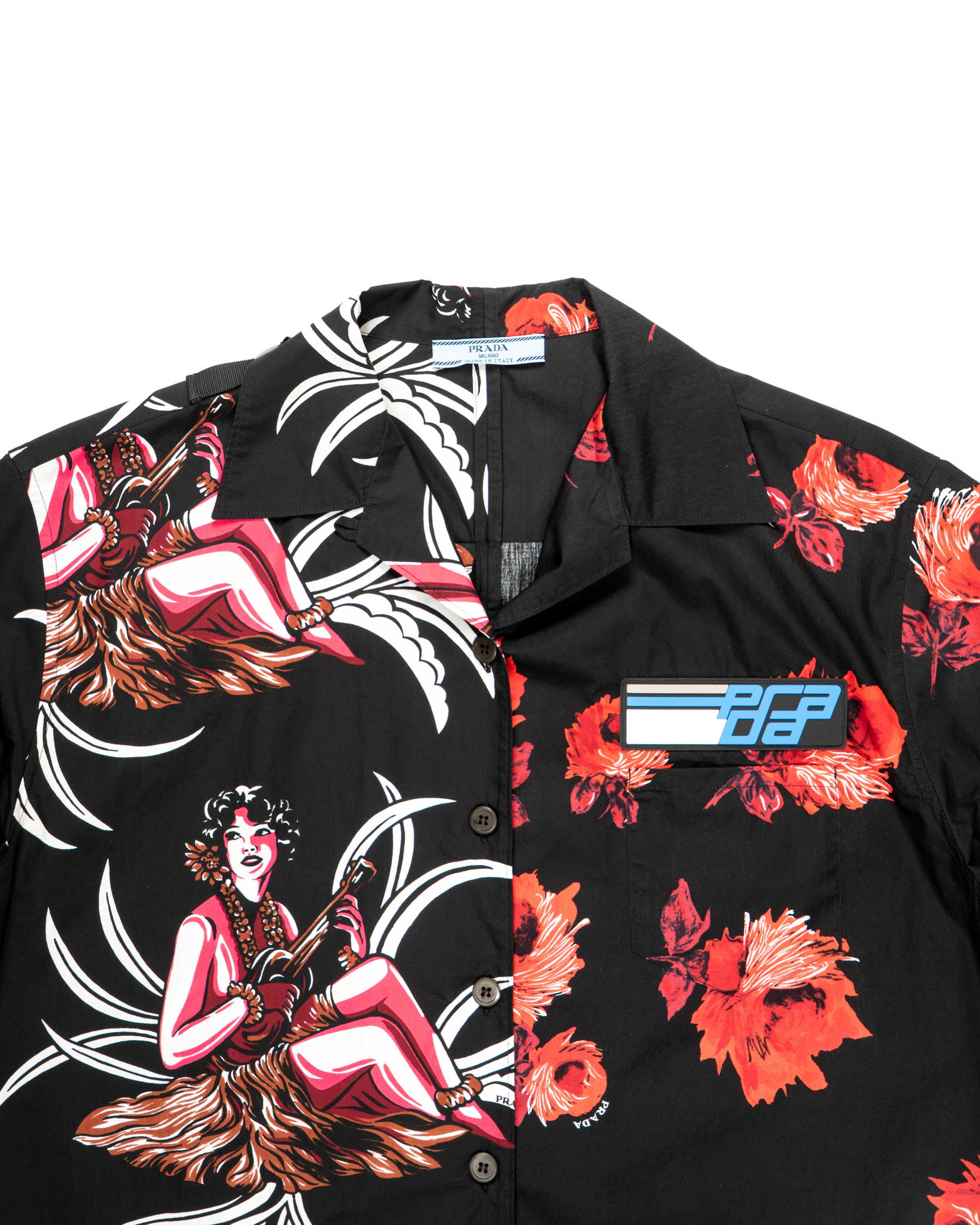 This short-sleeved bowling shirt was featured in the Fall/Winter 2018 collection under the creative direction of Raf Simons for Calvin Klein 205W39NYC. Crafted from smooth, lightweight cotton, it showcases a striking contrast print featuring pin up inspired motifs and vibrant red floral accents. The relaxed silhouette with a camp collar evokes classic mid century Americana, while the blue rubber logo patch at the chest adds a modern, industrial touch that became a signature of the era. Designed to blur the lines between nostalgia and subversion, this piece perfectly encapsulates Simons’ cinematic vision for Calvin Klein: bold and ironic.