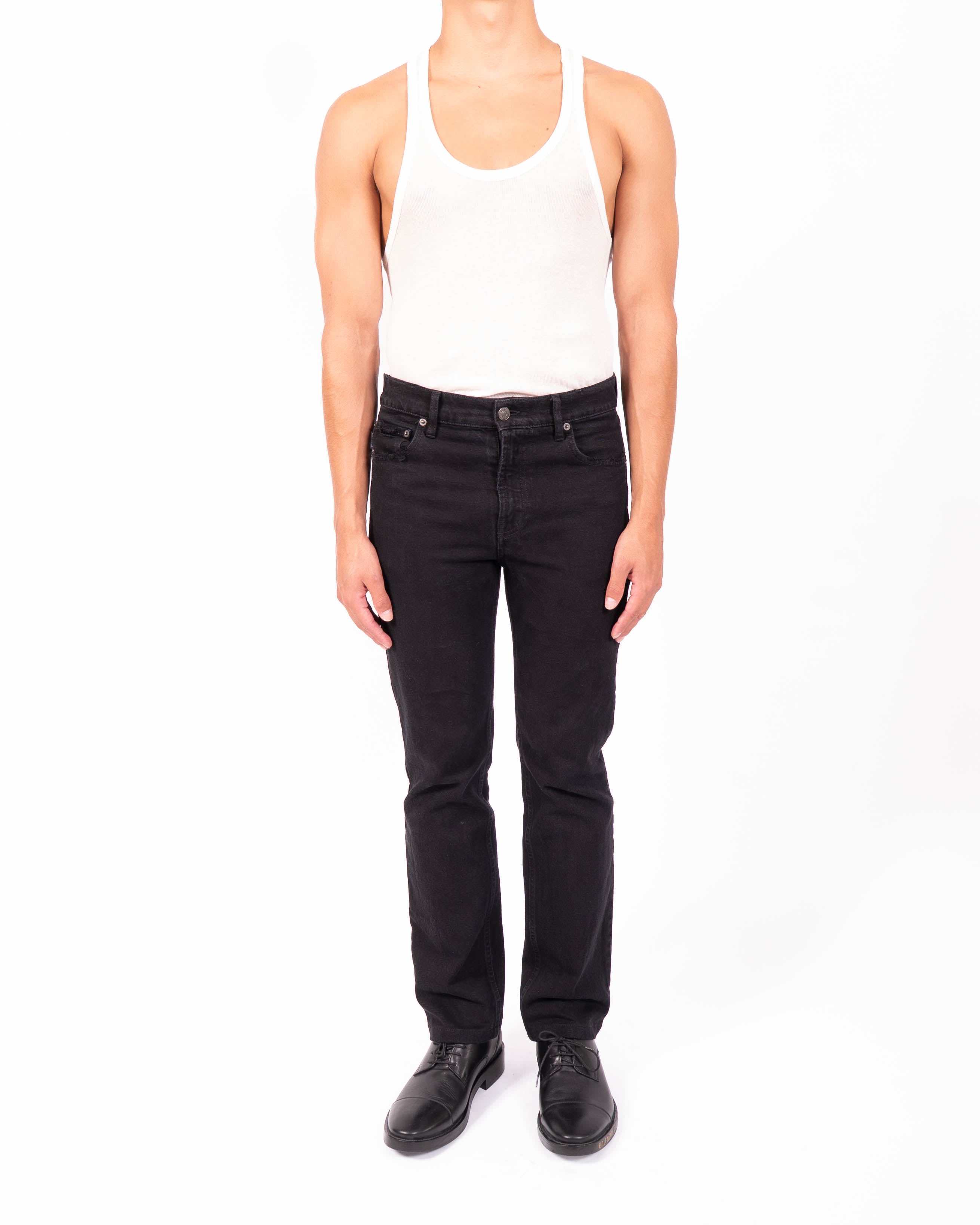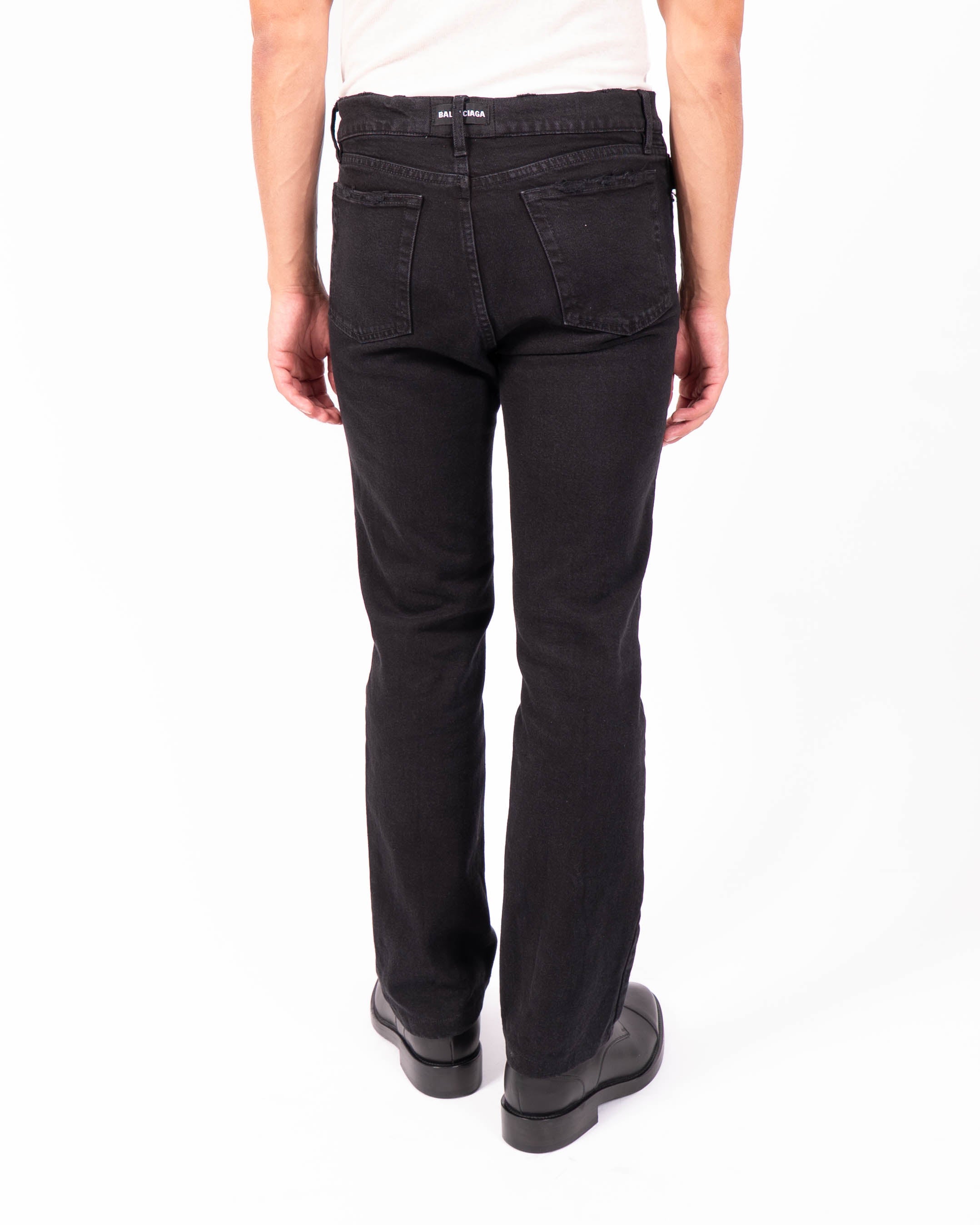 These black flared jeans from SS21 offer a sharp, elongating silhouette. The cut hugs through the hips and thighs before dramatically widening below the knee creating a bold, structured line.