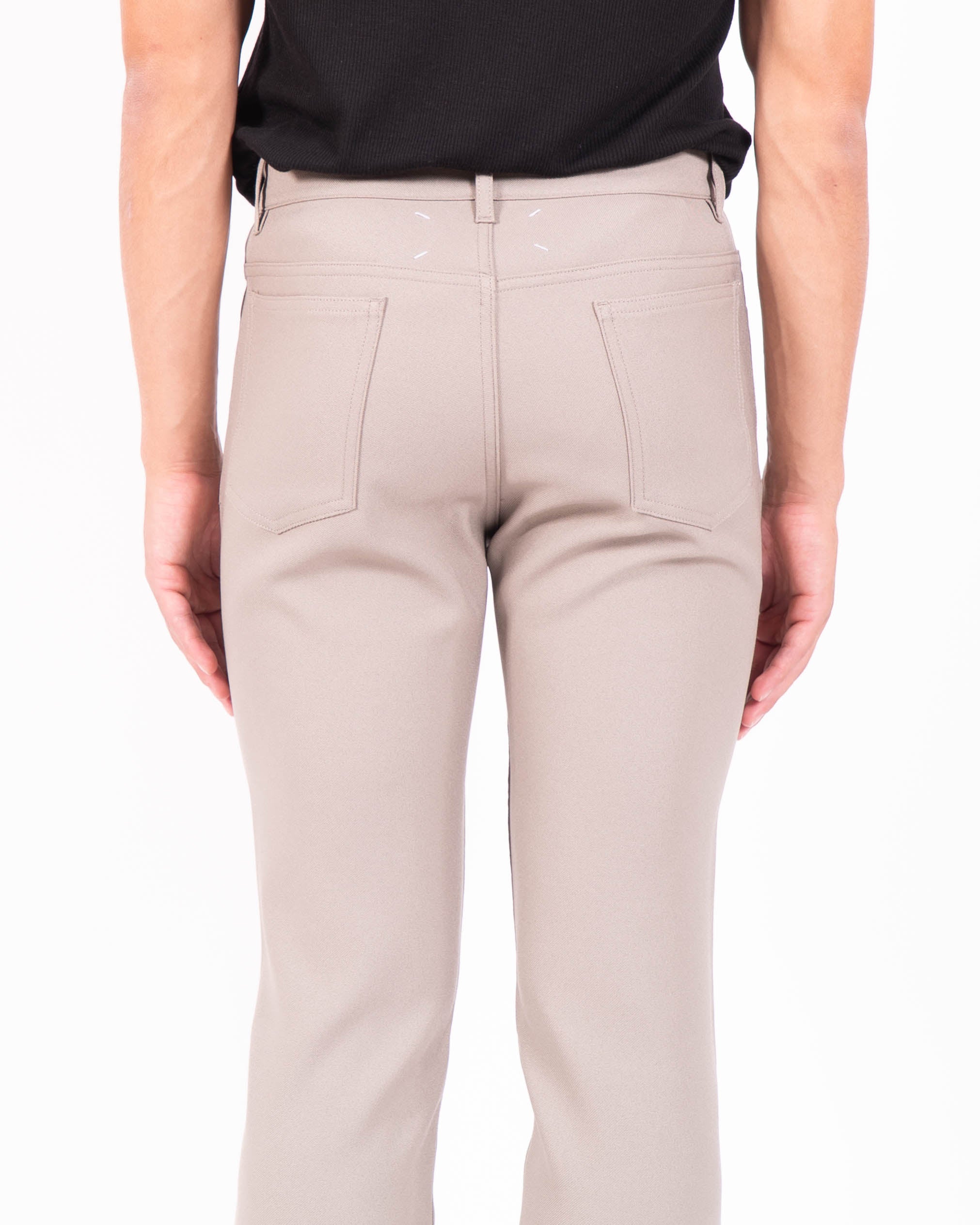 Crafted from beige viscose, the fabric has a soft drape and a muted sheen that emphasizes fluidity. Minimal detailing underscores the precision of the cut, allowing the focus to remain on the line of the leg and the garment’s understated presence.