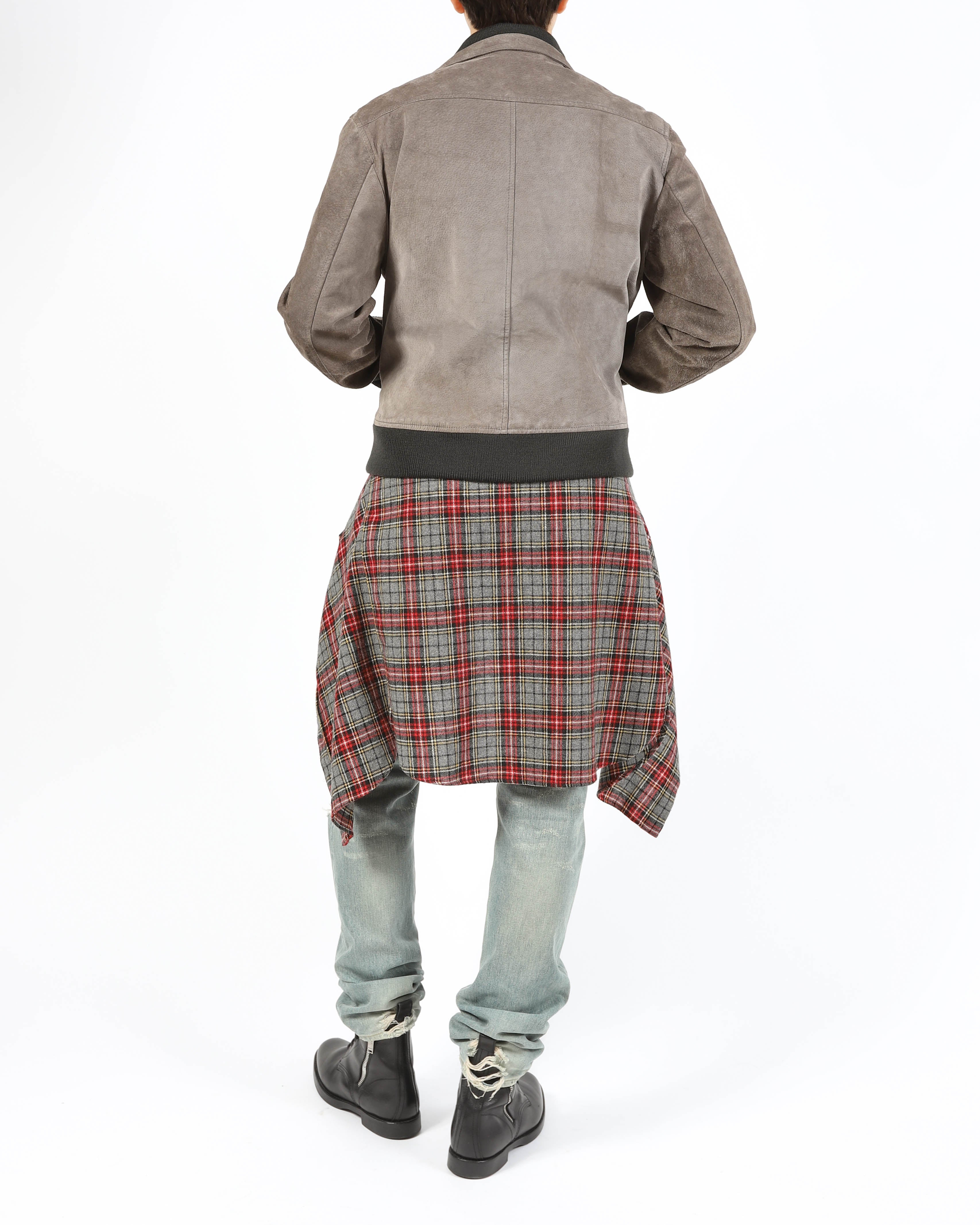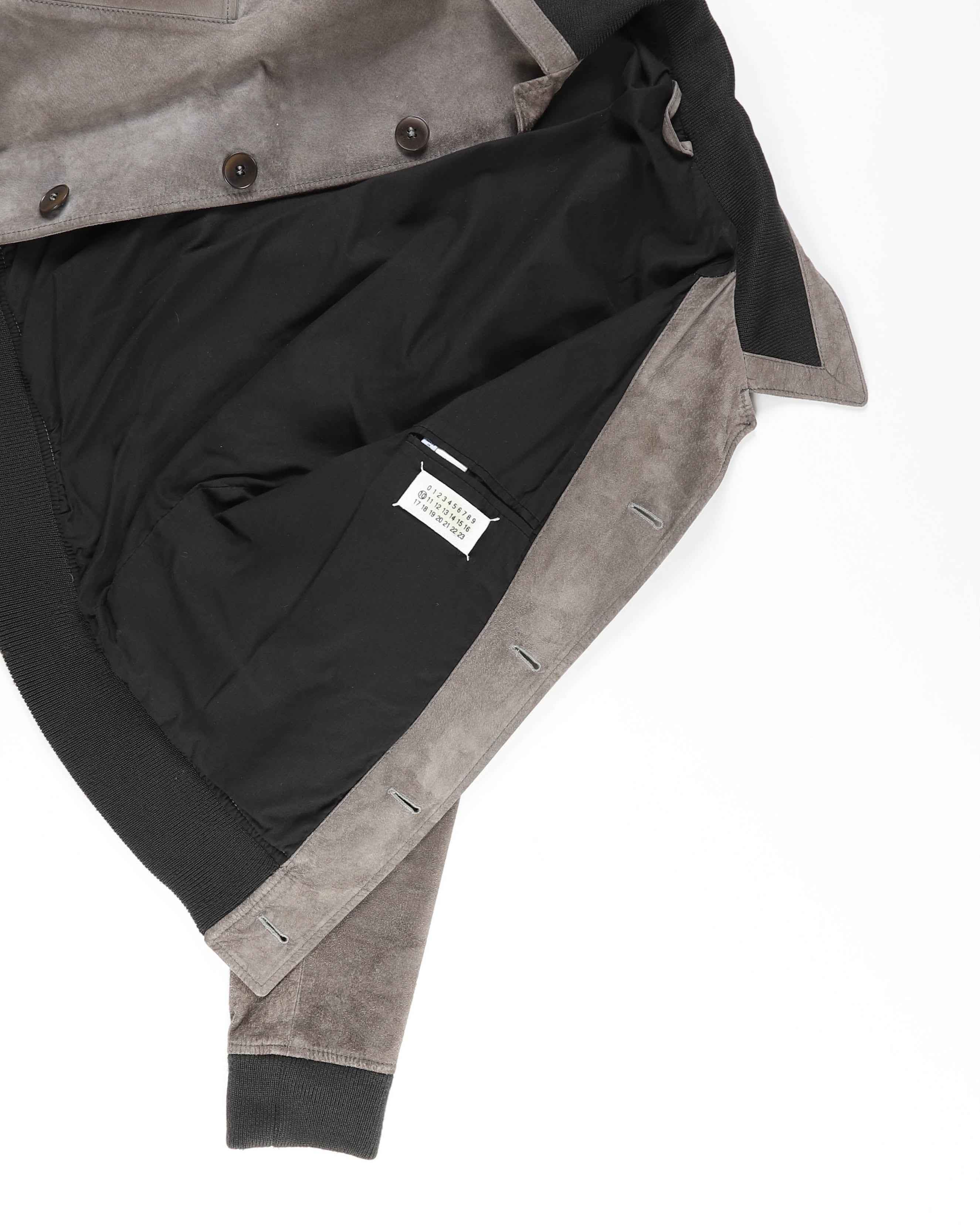 This contrast collar bomber in grey suede by Maison Margiela combines soft texture with sharp structure. The clean shoulder line and slightly boxy cut give the silhouette quiet strength, while the contrasting collar adds a clear focal point without overwhelming the shape.