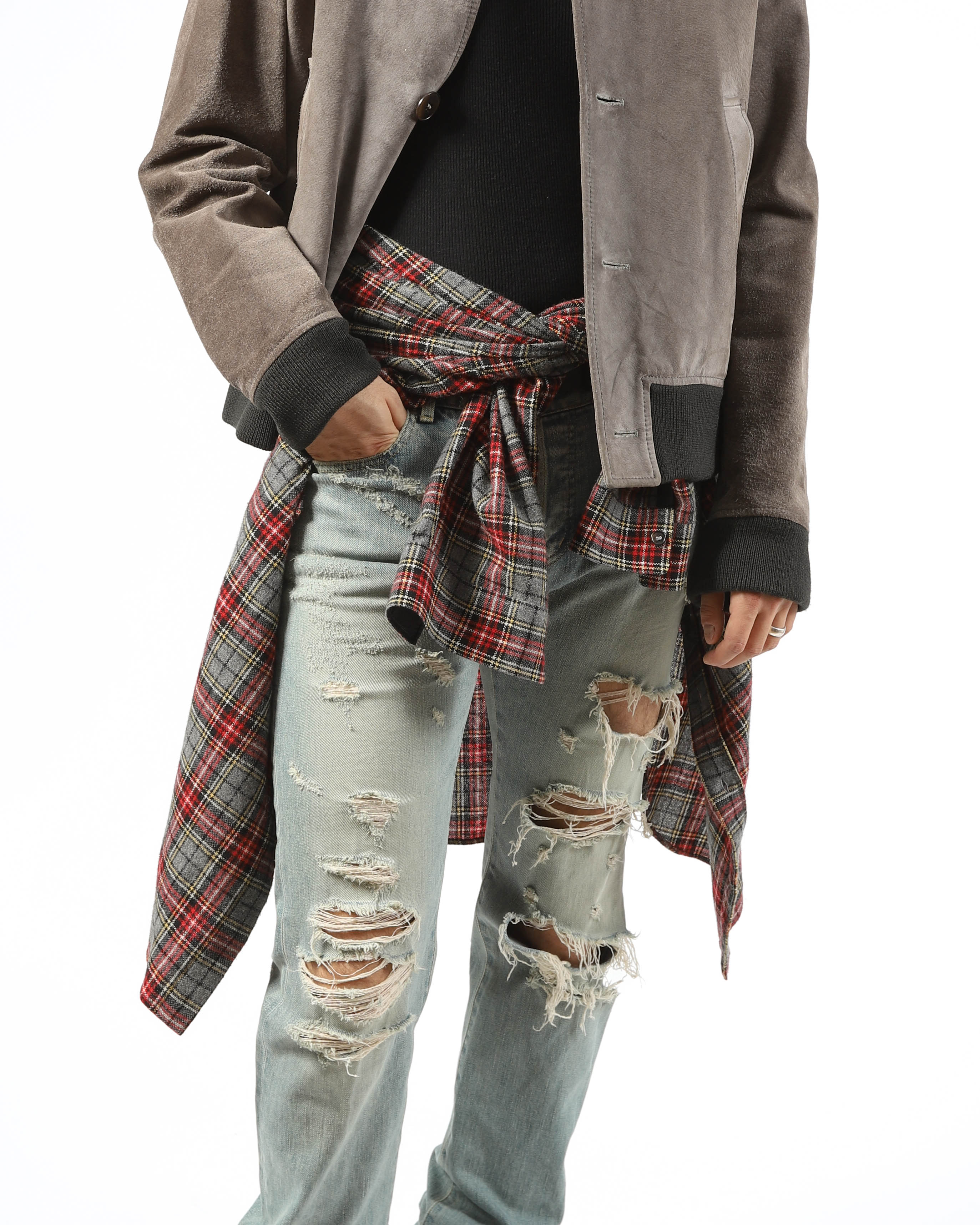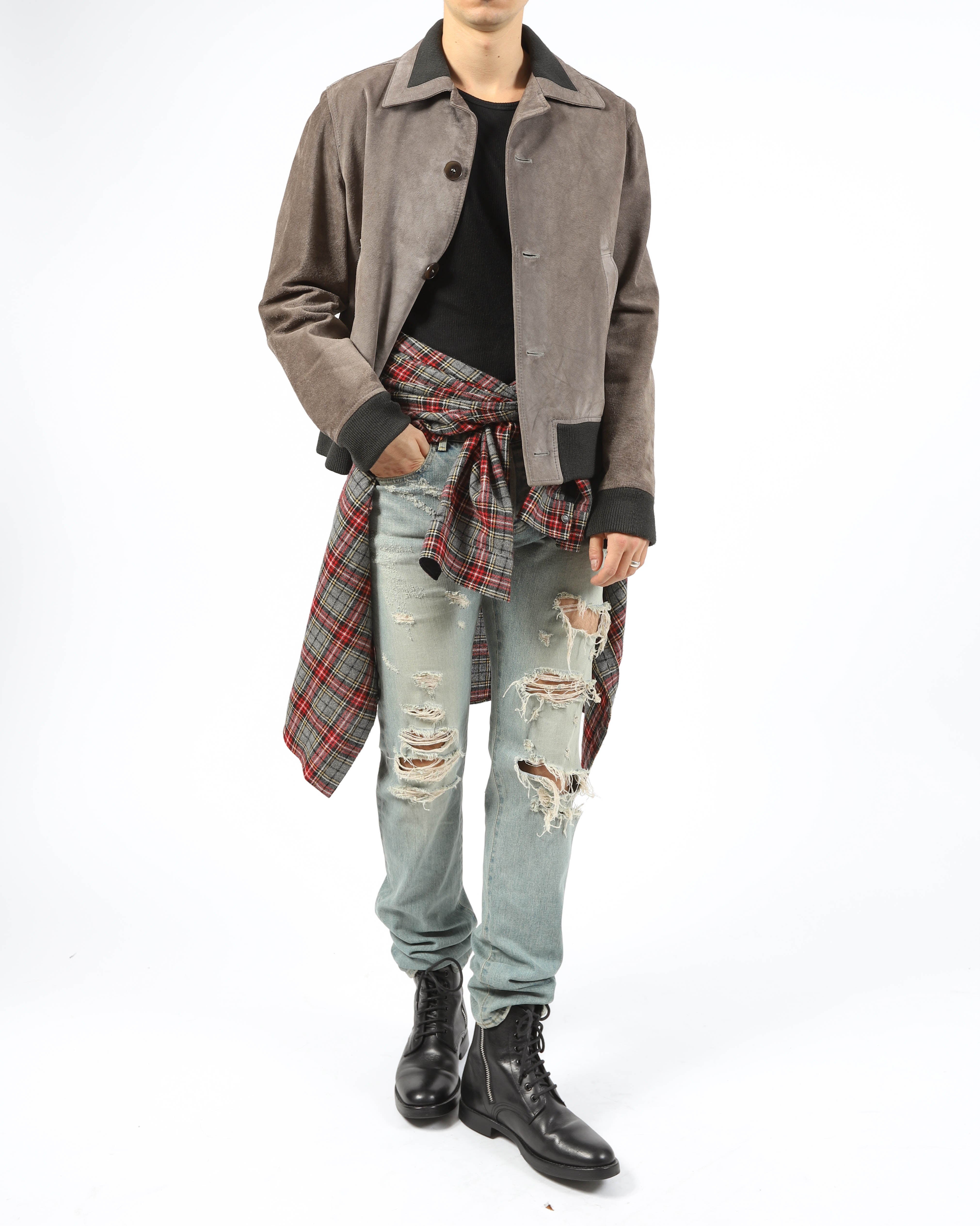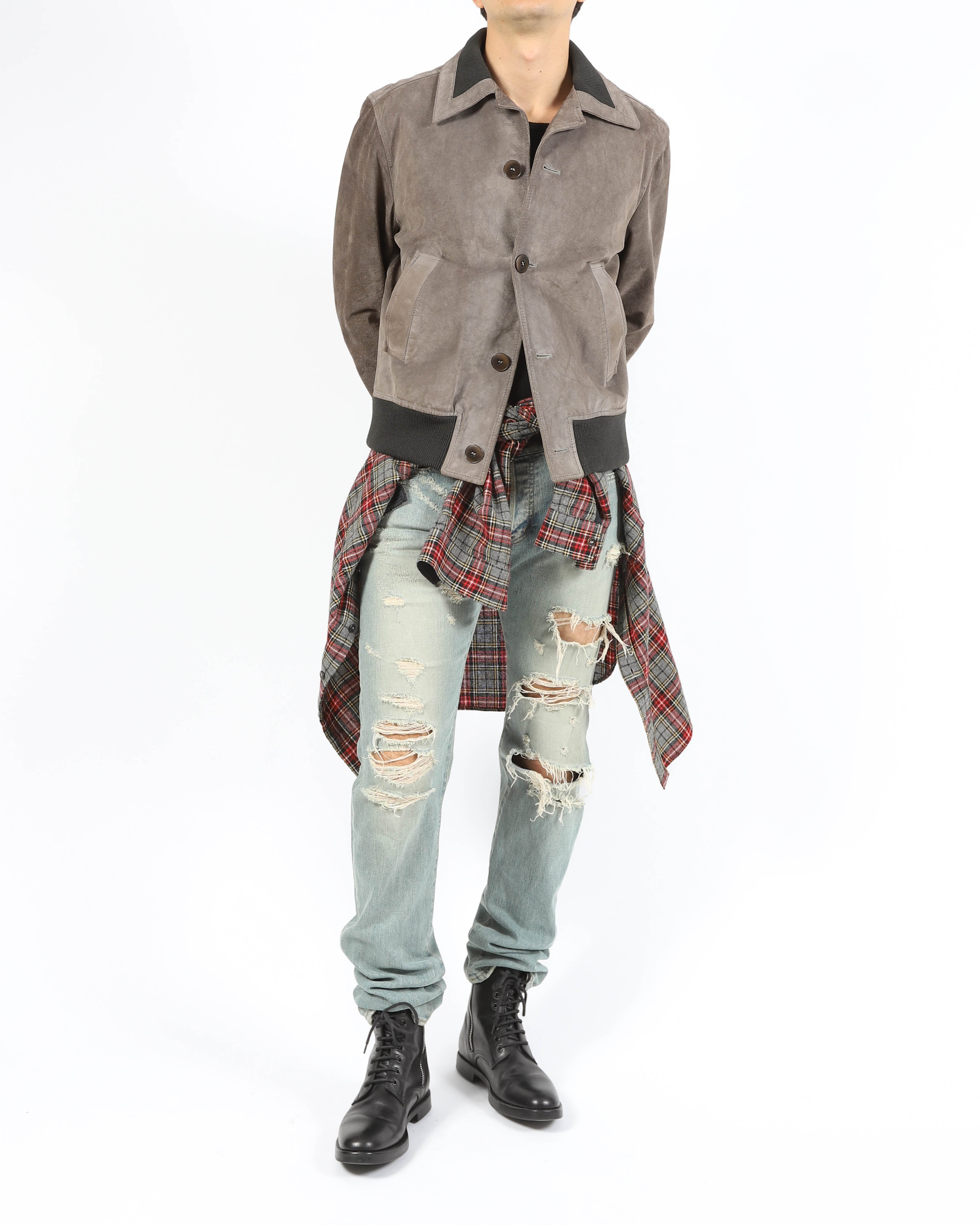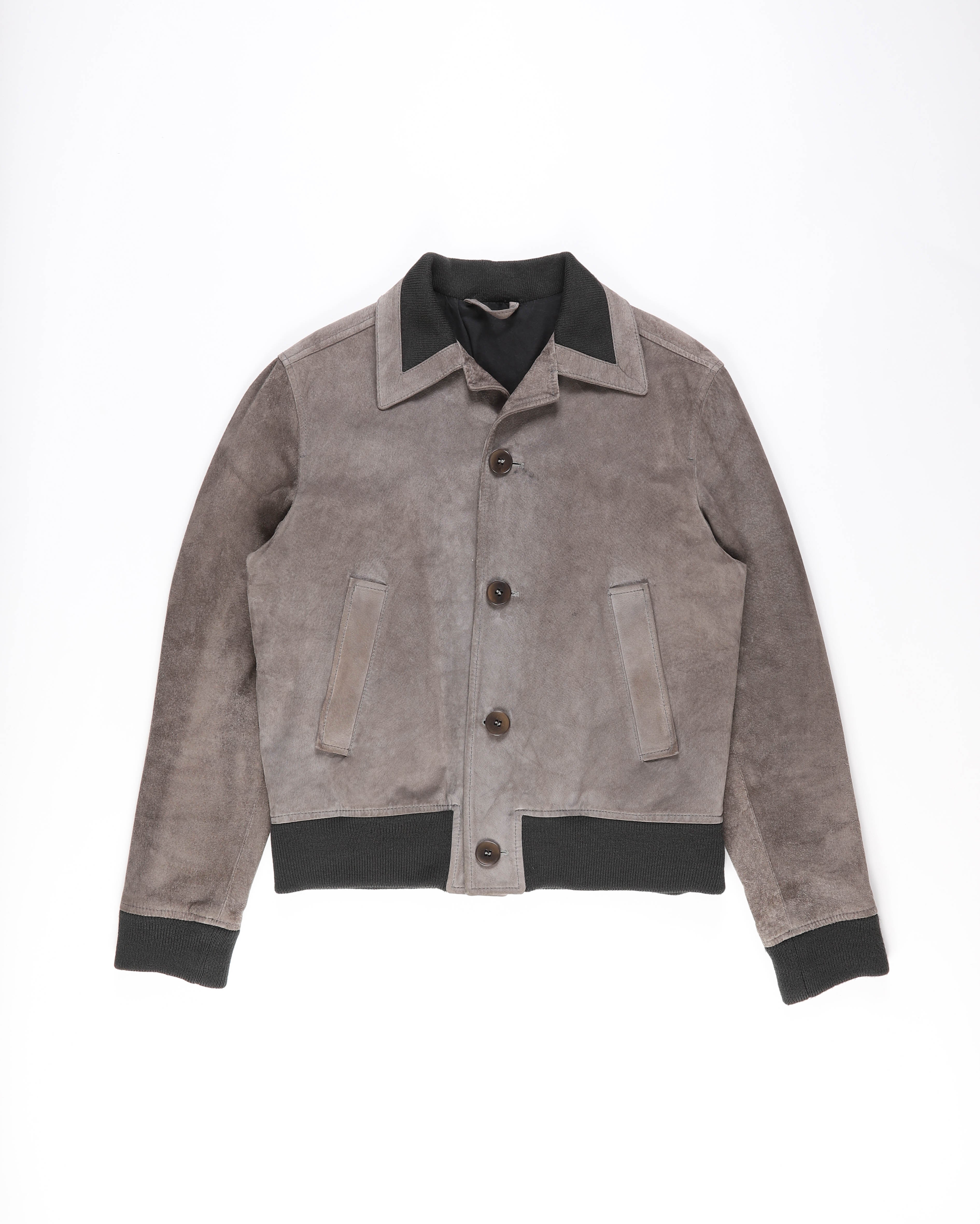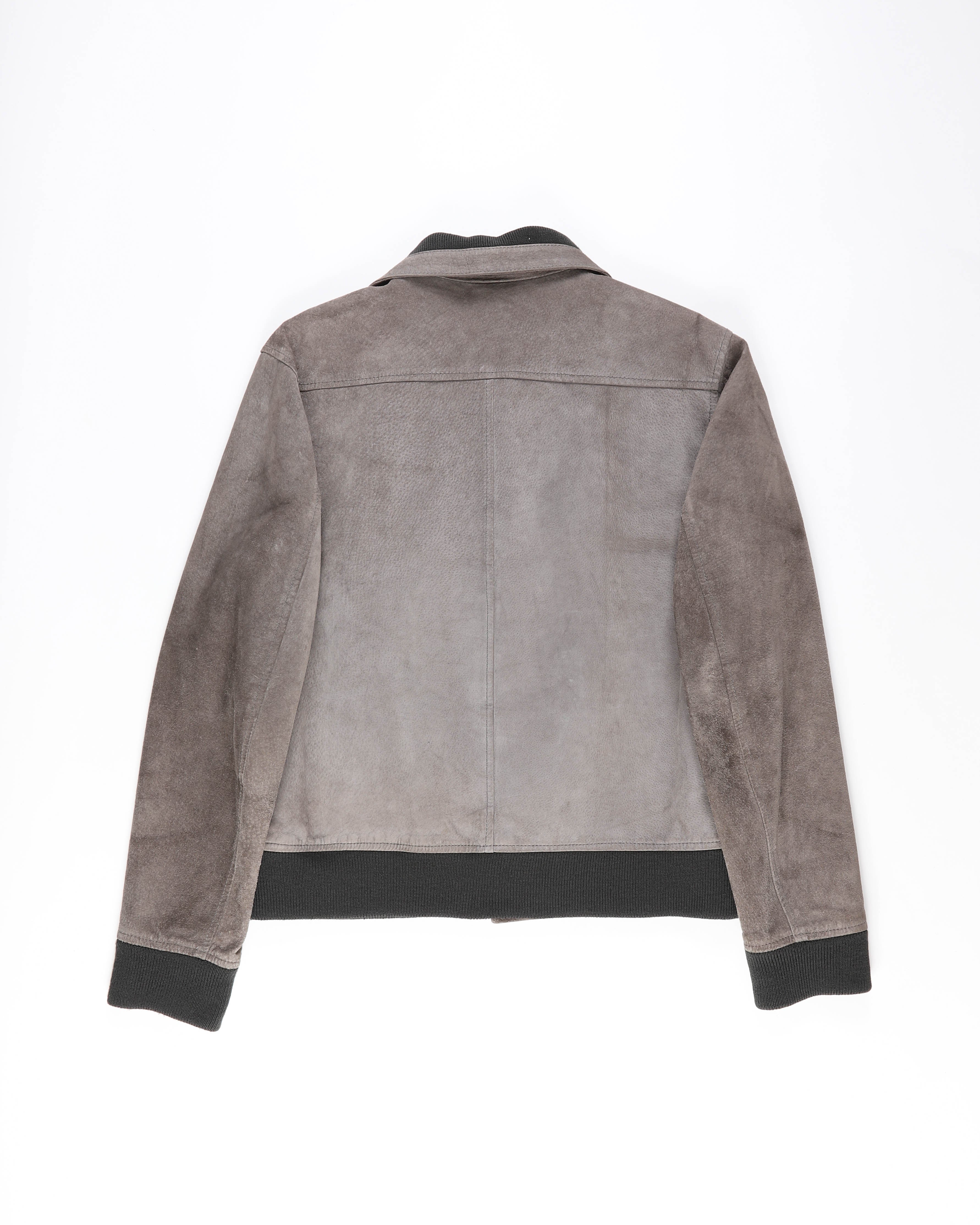 A zip front and minimal hardware keep the look refined and understated. The supple suede gives the jacket a rich, tactile finish that softens its structured outline. From FW03, the piece reflects Margiela’s early focus on subtle contrasts and a precise, deconstructed approach to outerwear.