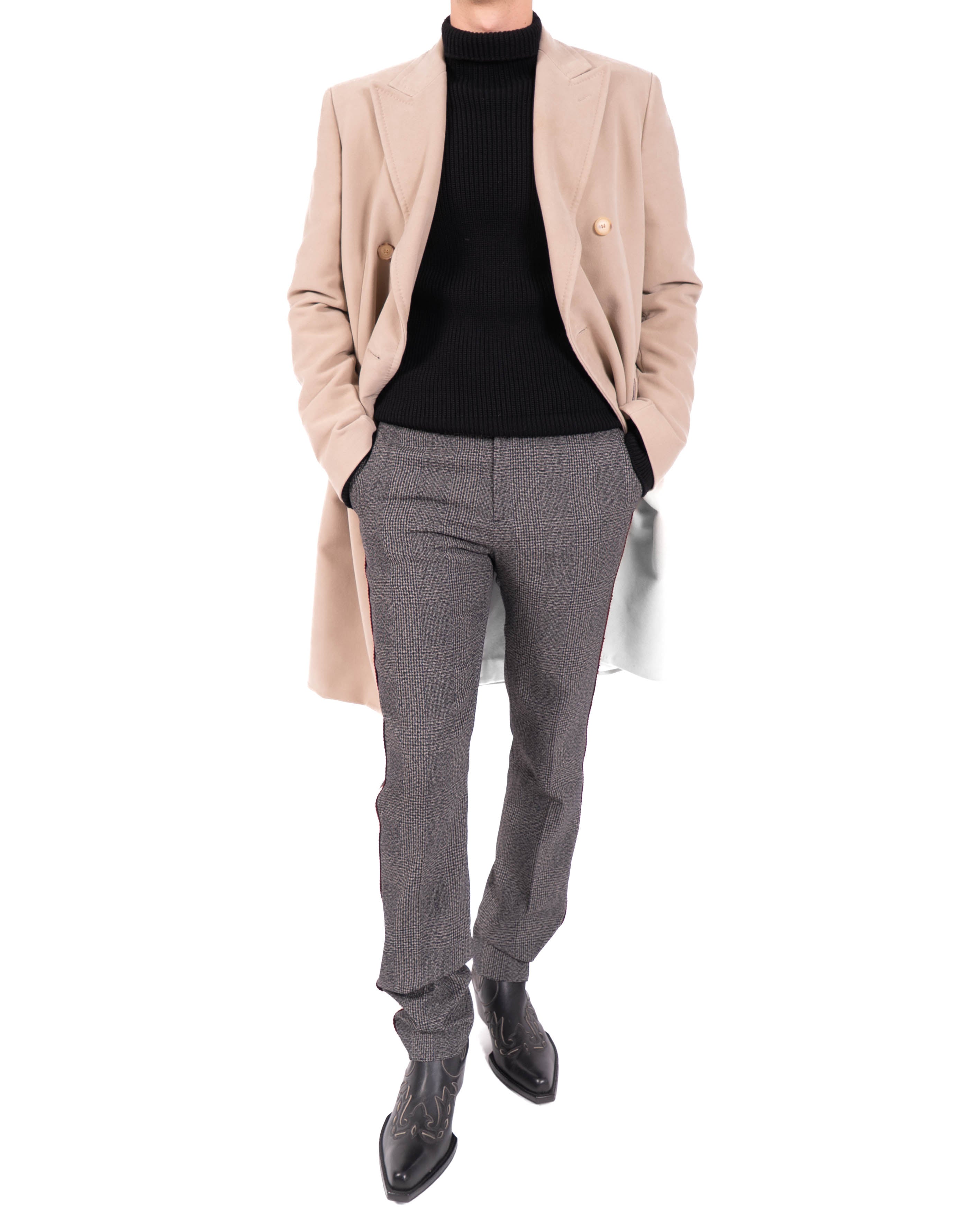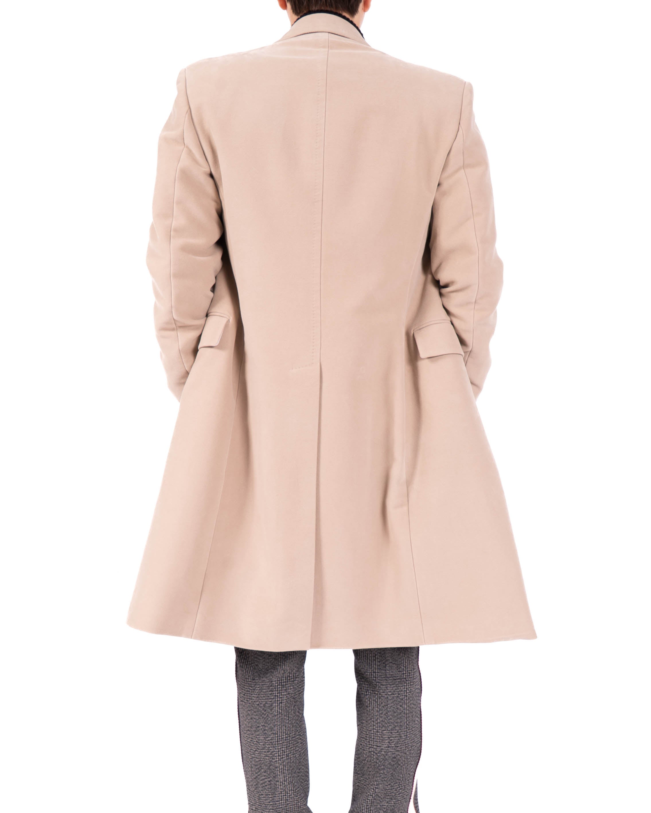 The dense, velvety texture of the beige moleskin provides warmth and durability, with a matte finish that highlights the coat’s sculptural lines. Flap pockets and tonal buttons reinforce the traditional tailoring vocabulary, executed with clarity and restraint.