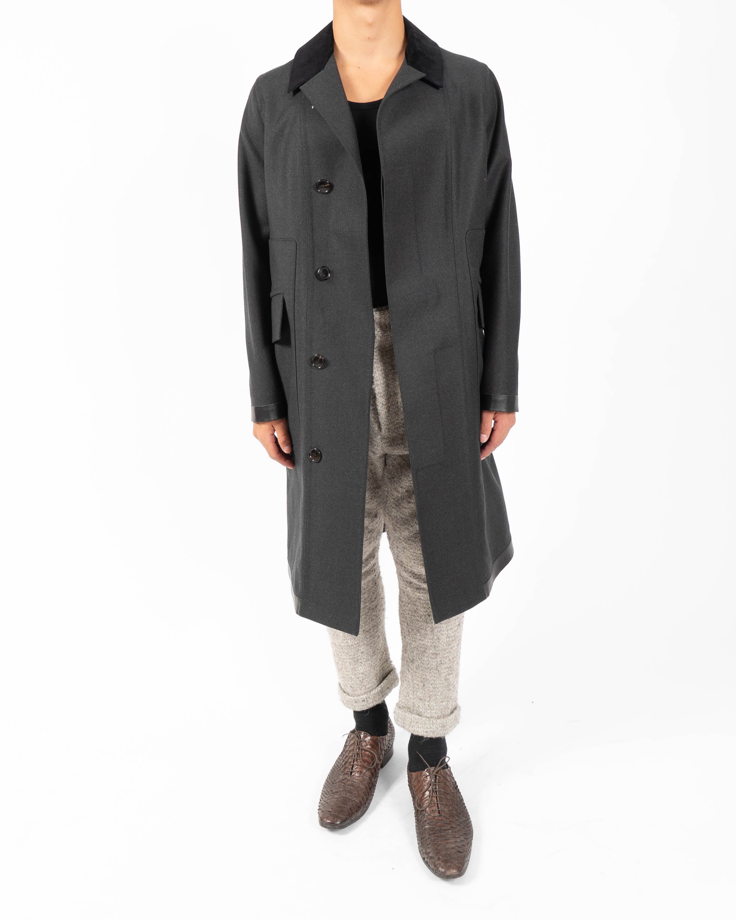 The FW17 Military Coat reinterprets utilitarian tailoring with a precise and elongated cut. Its straight silhouette is balanced by structured shoulders and discreet front closure, giving the piece a disciplined elegance.