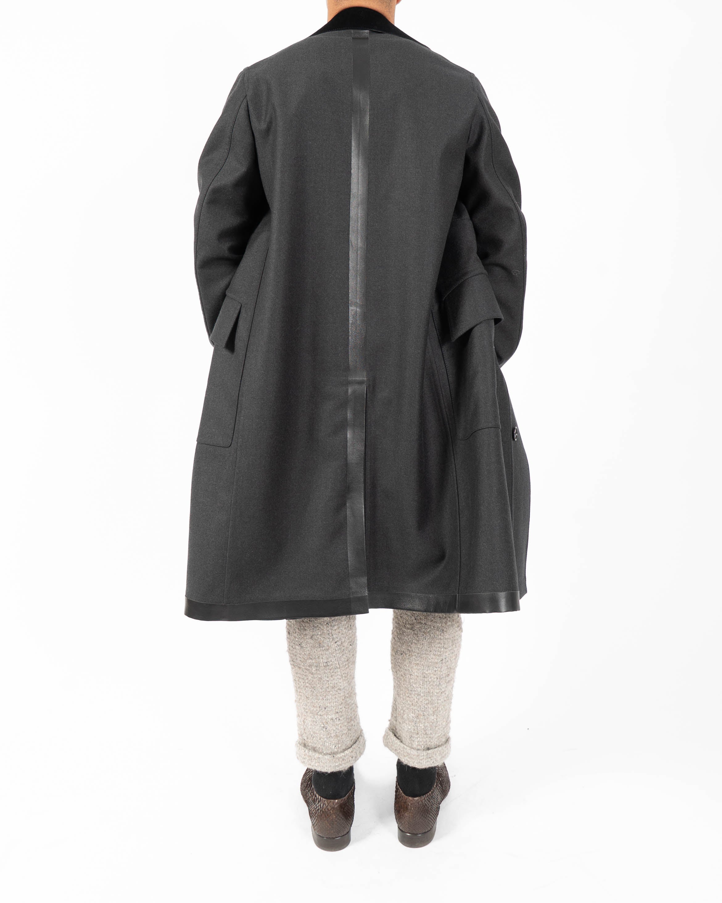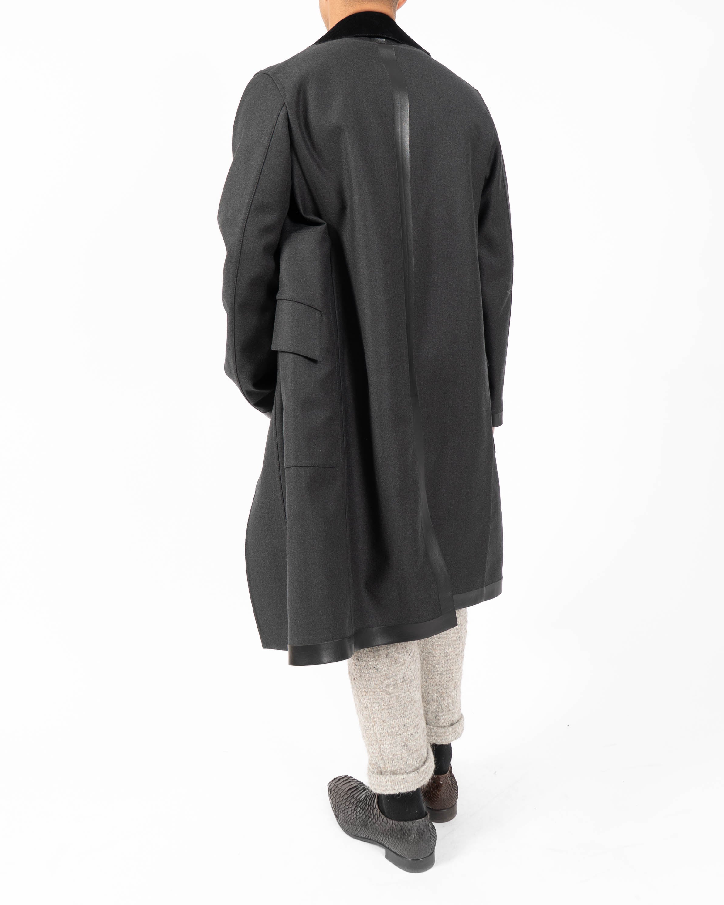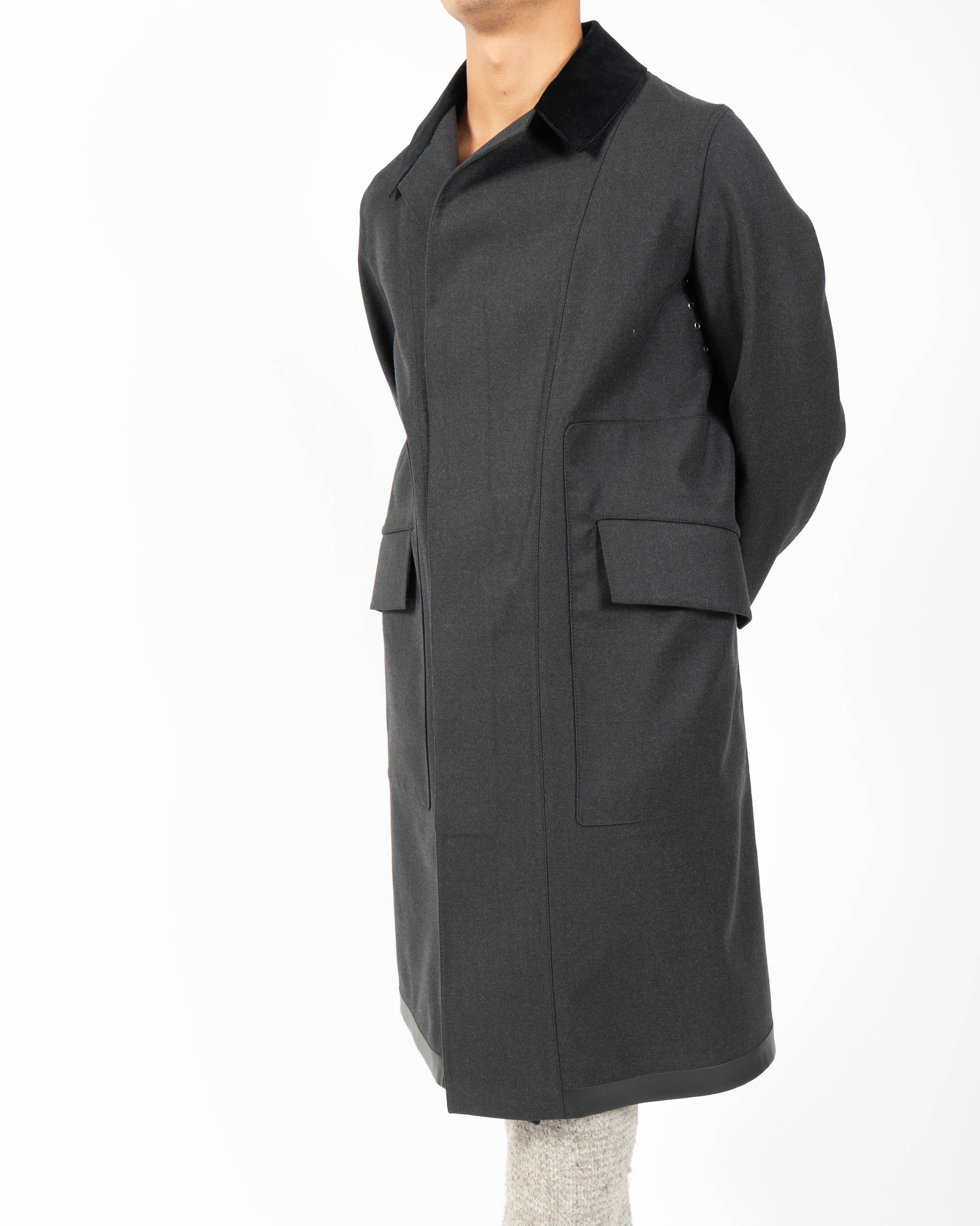 Made from soft grey fleece wool, the coat offers warmth and a refined matte texture. The Lining is bonded to the outer fabric creating a sturdy almost sculptural feel. Functional flap pockets add a practical touch while maintaining clean lines.