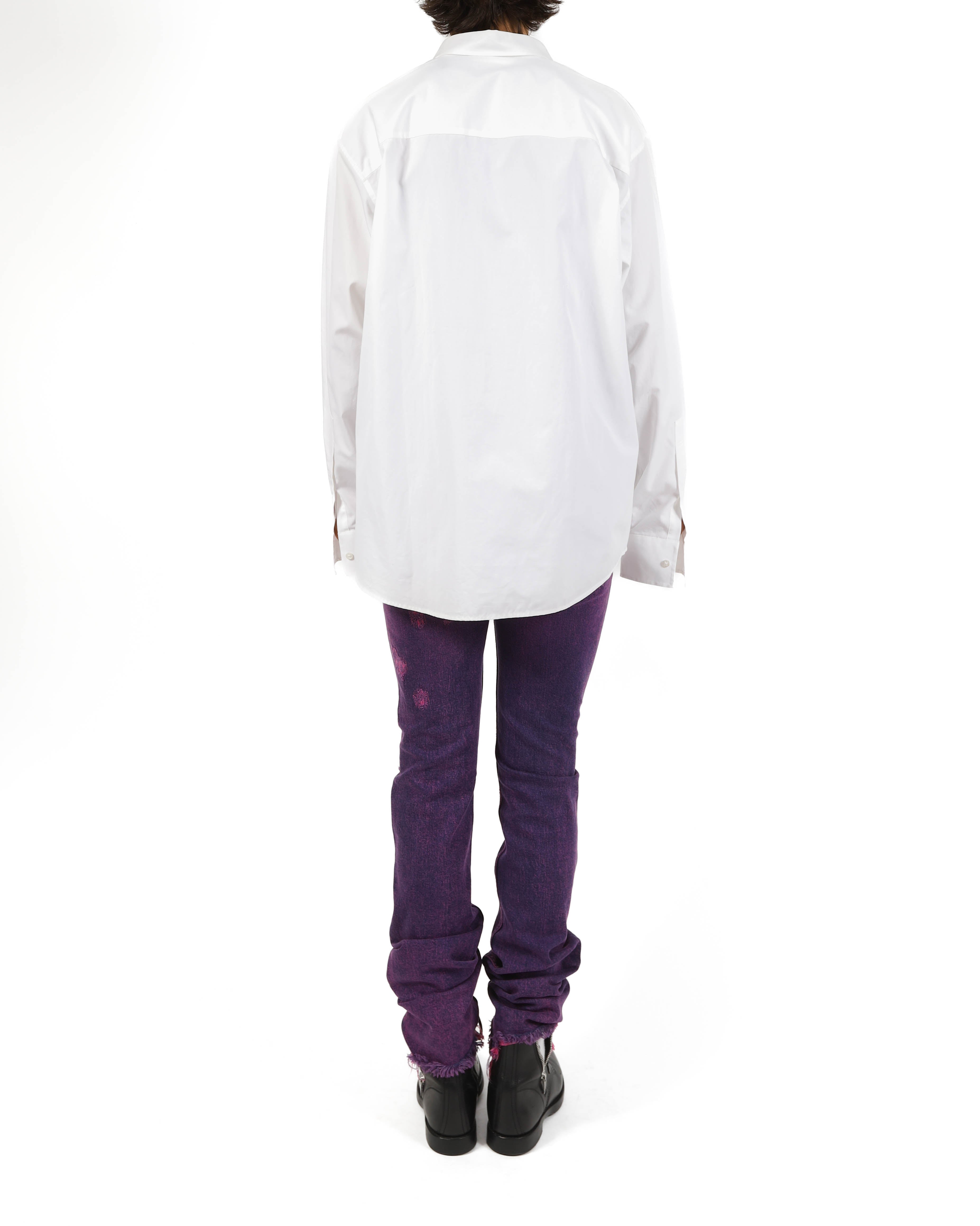 The oversized cut is structured at the shoulders before falling loosely down the body. A point collar and button front keep the look minimal and direct. Released in FW17, the piece reflects the label’s refined take on classic American shirting, elevated through proportion and subtle cultural reference.