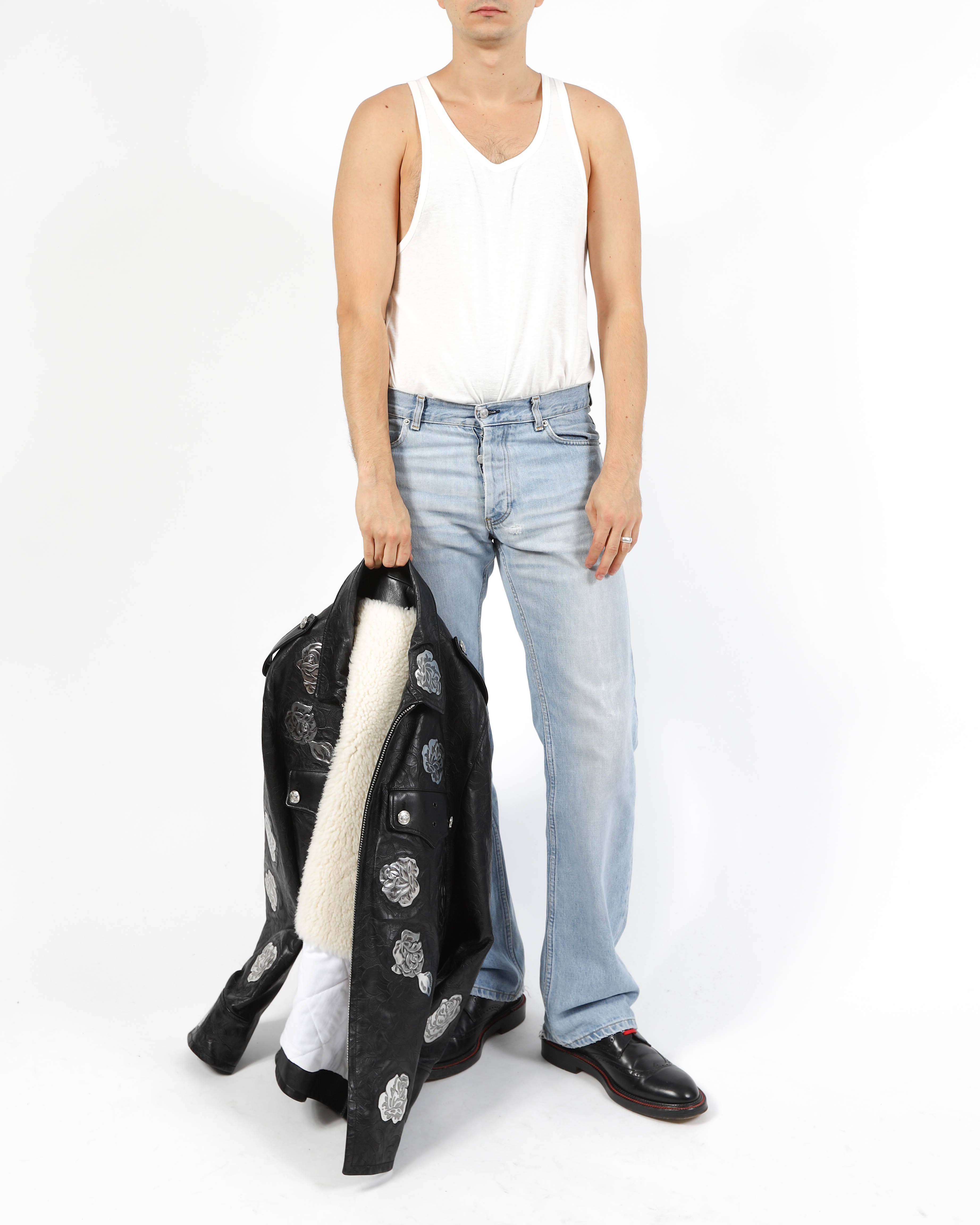 This leather jacket was featured on the FW17 Calvin Klein 205W39NYC runway show a defining piece that captures Raf Simons’ cinematic vision for the house. Crafted from embossed New Zealand calf leather, the jacket features intricate rose metal appliqués that lend a subtle yet striking contrast to its police-inspired silhouette. Its heavy construction and ivory shearling lining provide both substance and comfort, while the oversized fit enhances its bold, structured presence. A true collector’s item, this jacket embodies the refined craftsmanship and provocative spirit of Simons’ debut seasons at Calvin Klein.