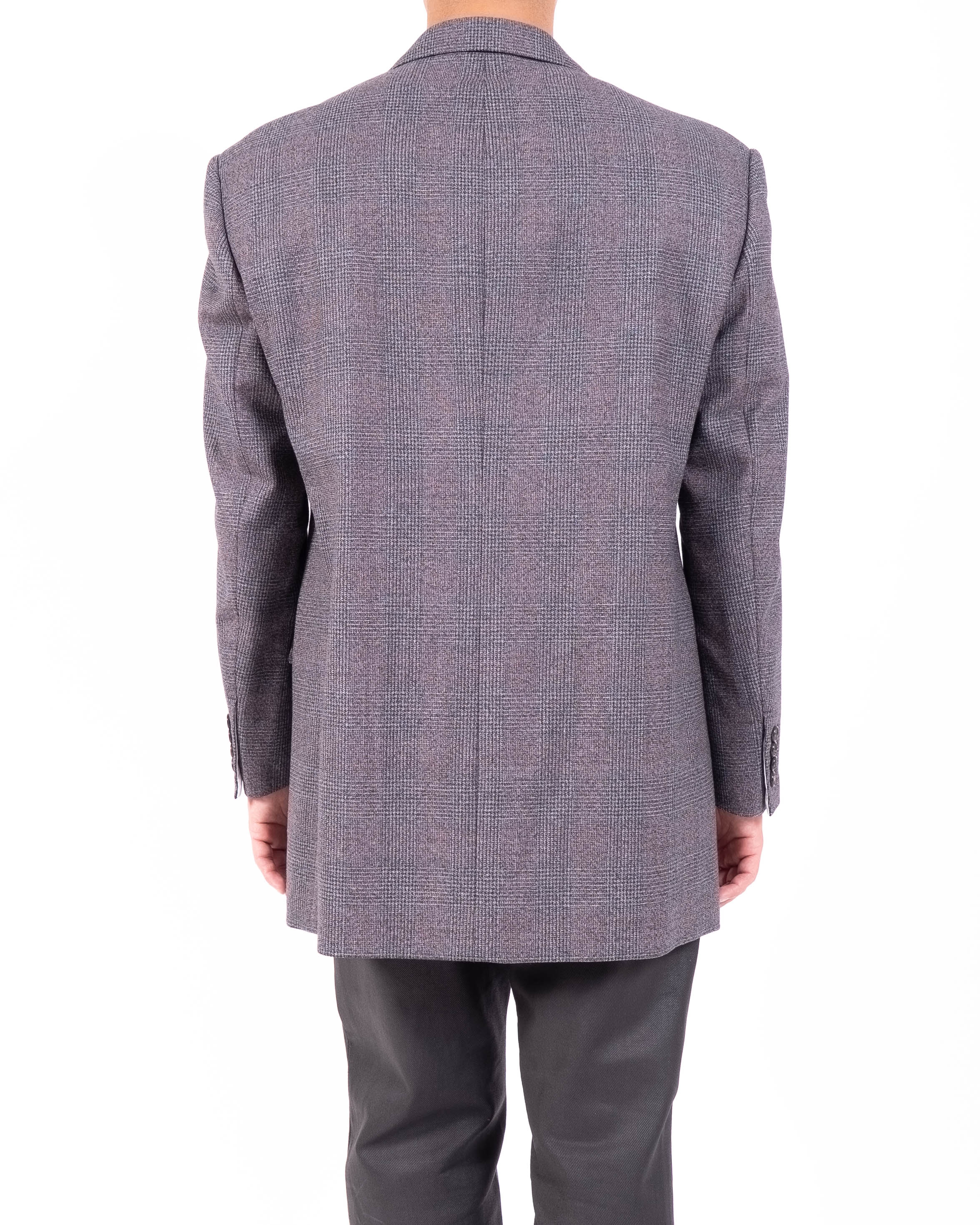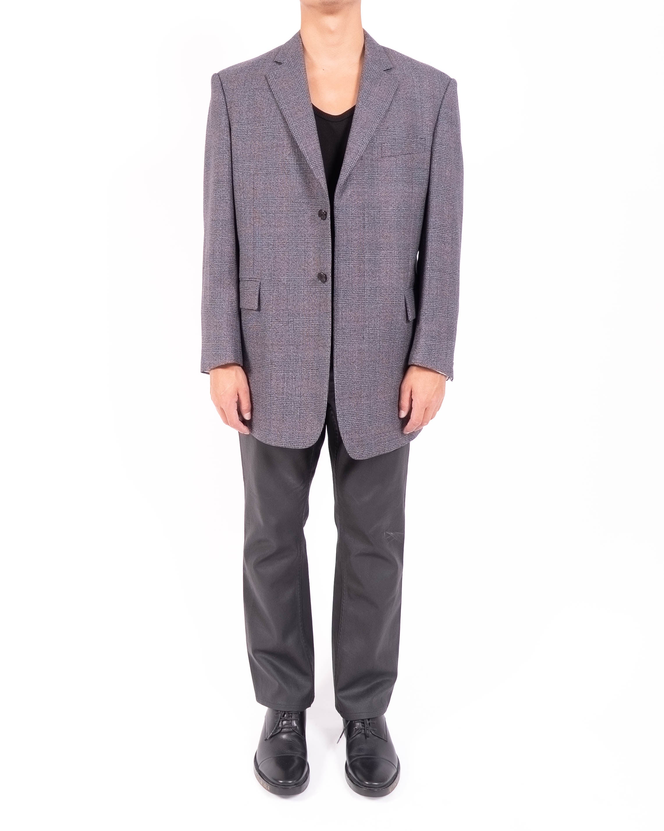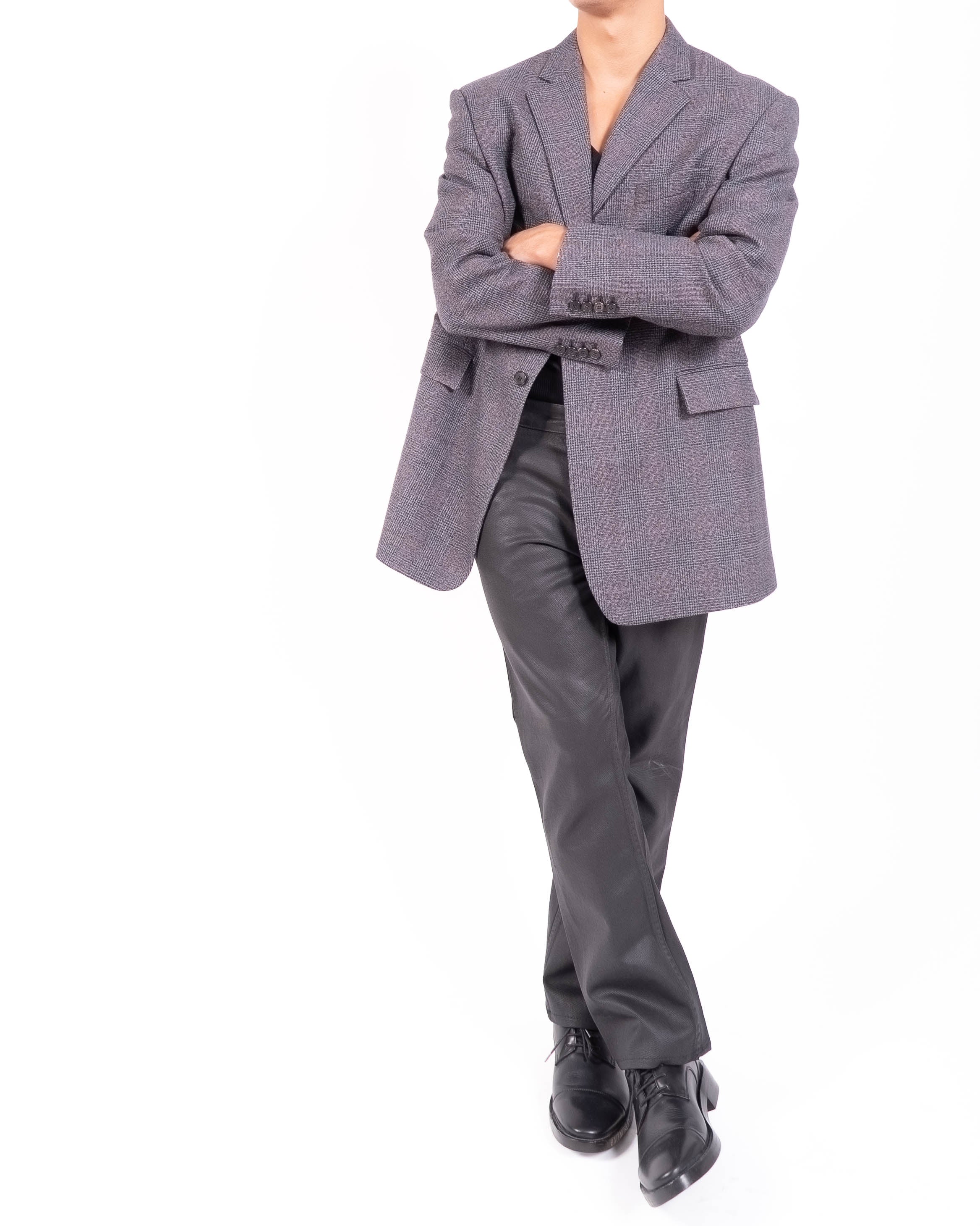 Crafted from checked grey wool, the fabric brings a traditional menswear pattern into a more contemporary frame. The lightly padded shoulders and elongated lines emphasize structure, while the relaxed fit softens the overall presence, striking a balance between discipline and ease.