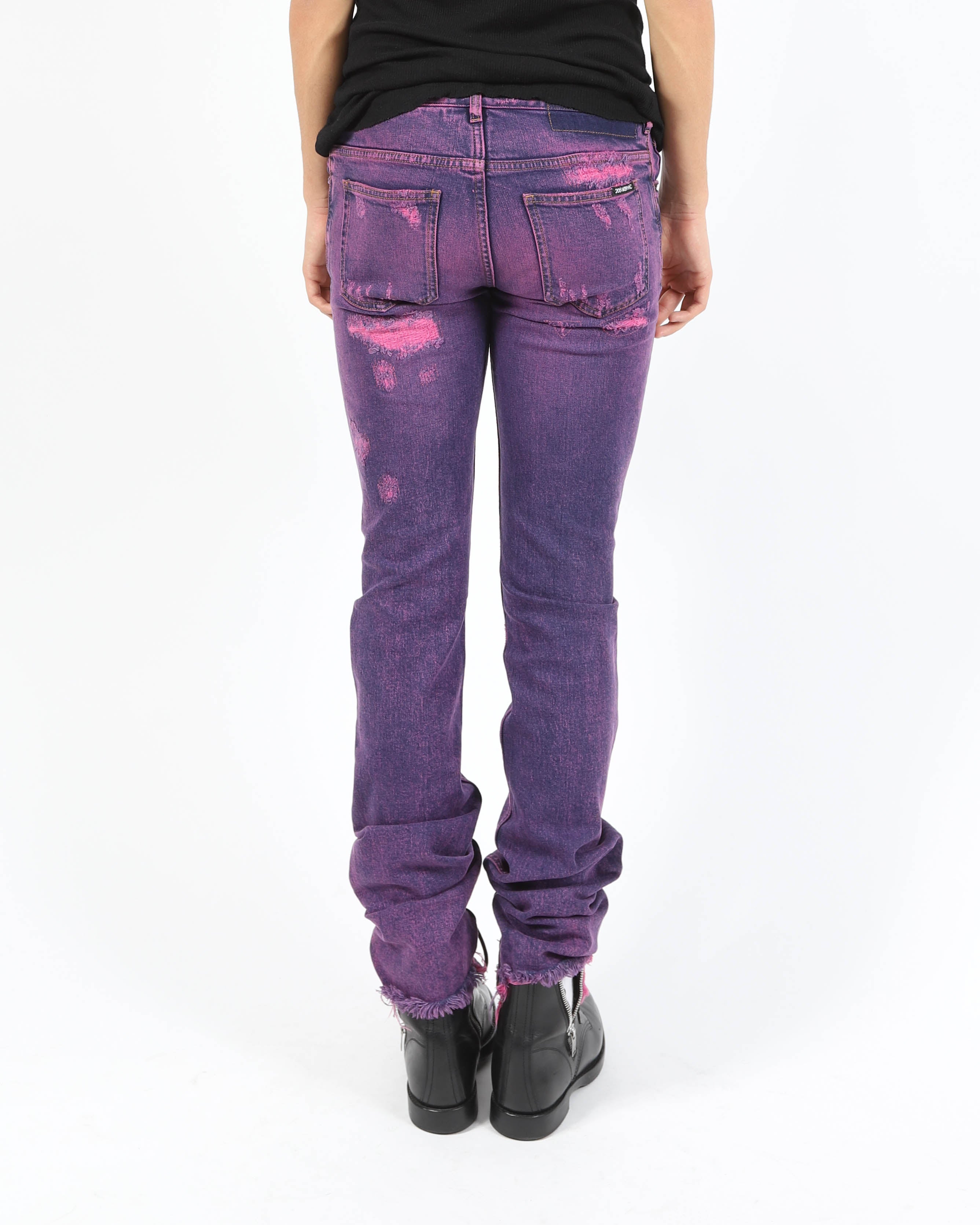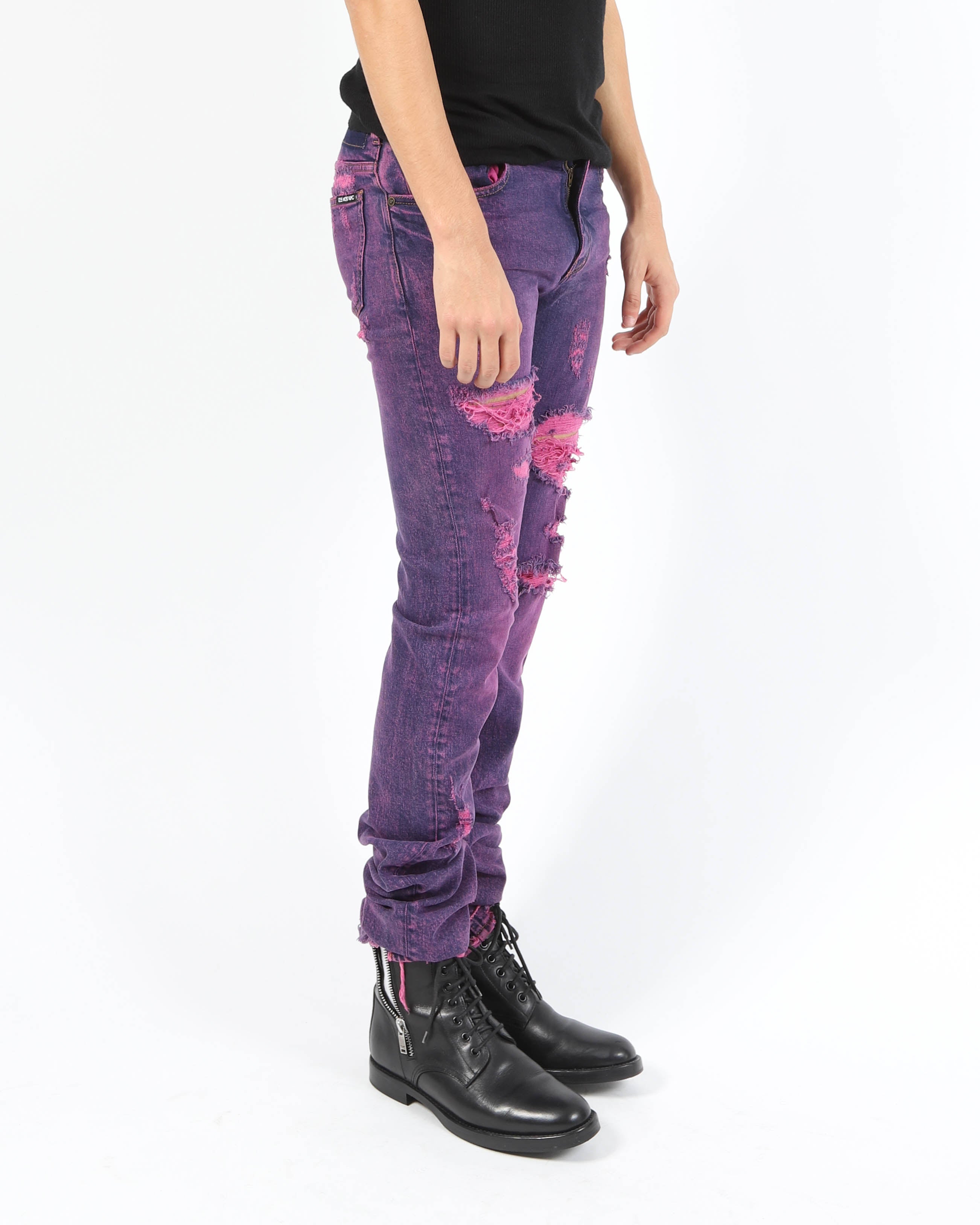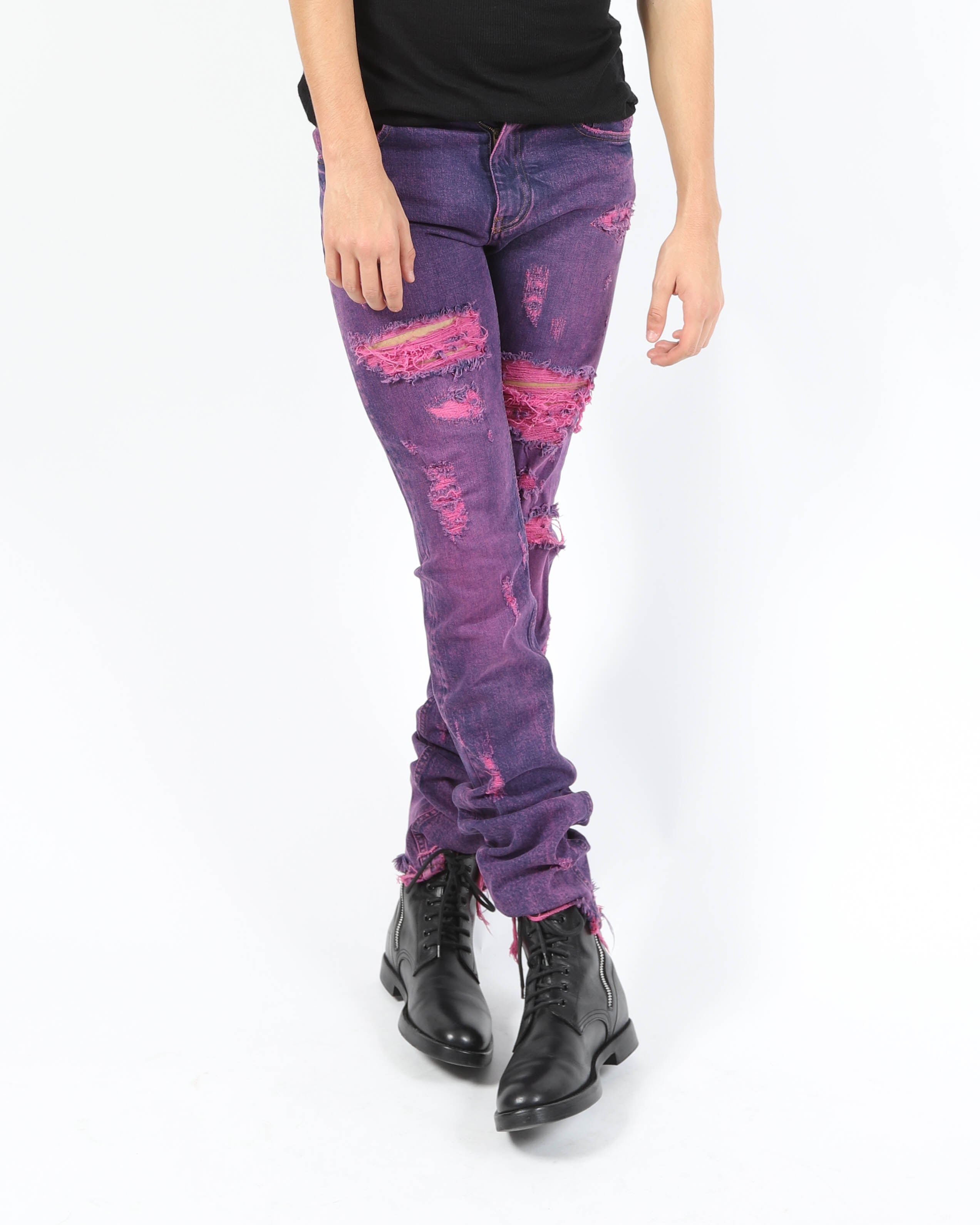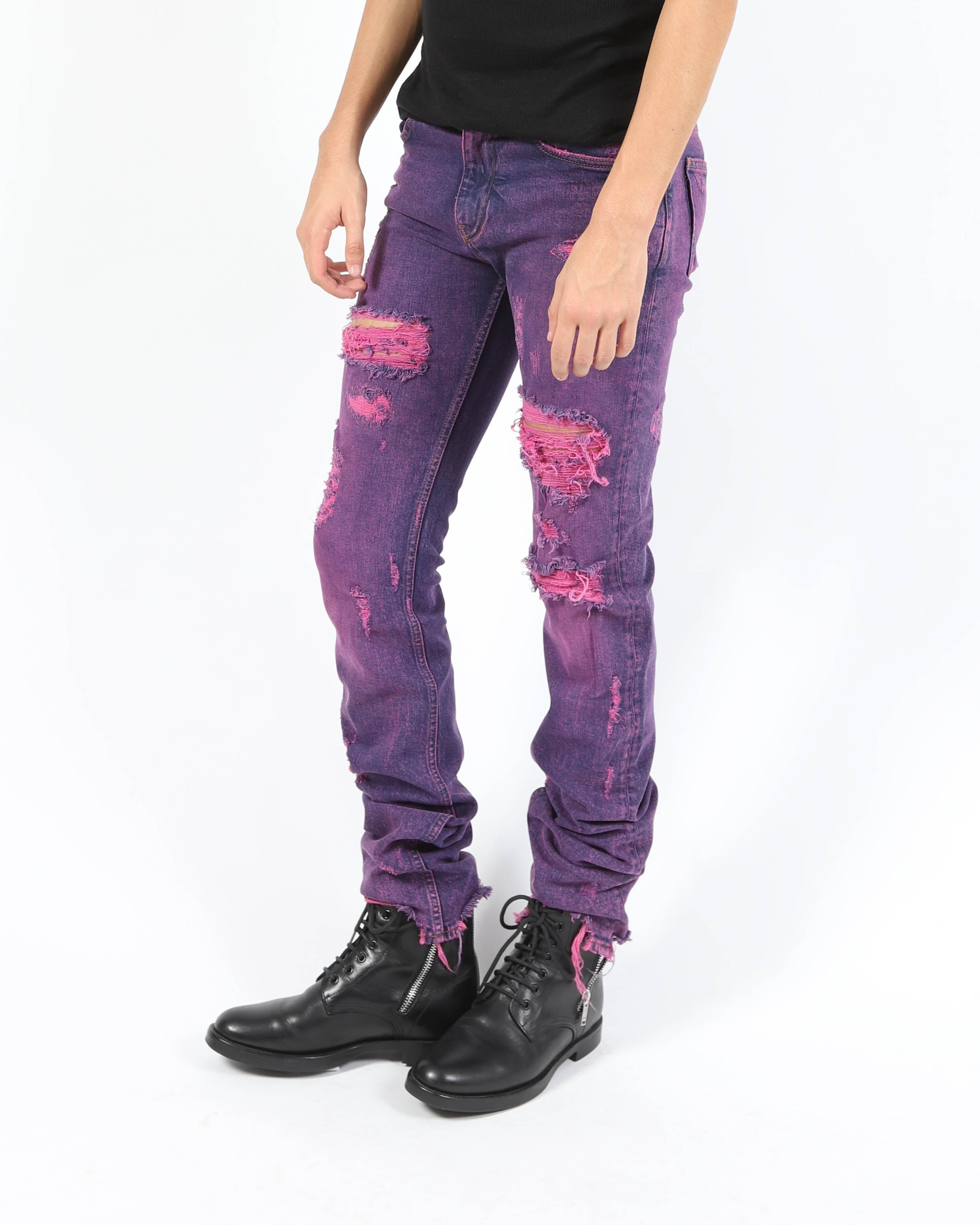 These purple distressed denim trousers combine bold color with edge. The rich violet wash is softened by precise distressing, abrasions, and fading placed to feel intentional rather than random.