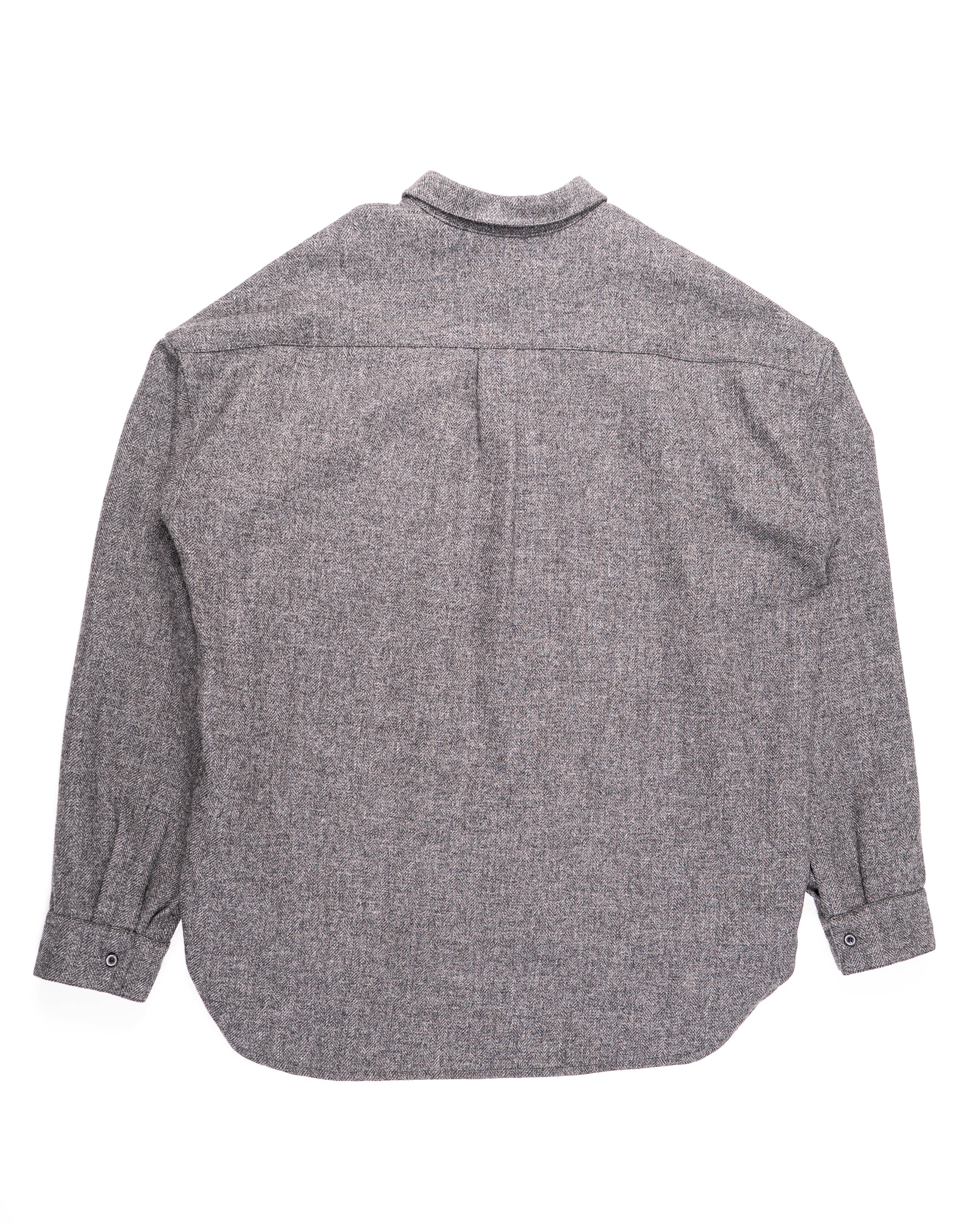 Made from grey chevron wool, the fabric combines texture and softness with subtle depth, giving the shirt an understated richness. The minimal placket and clean lines keep the focus on the proportions, reinforcing the sense of quiet refinement.