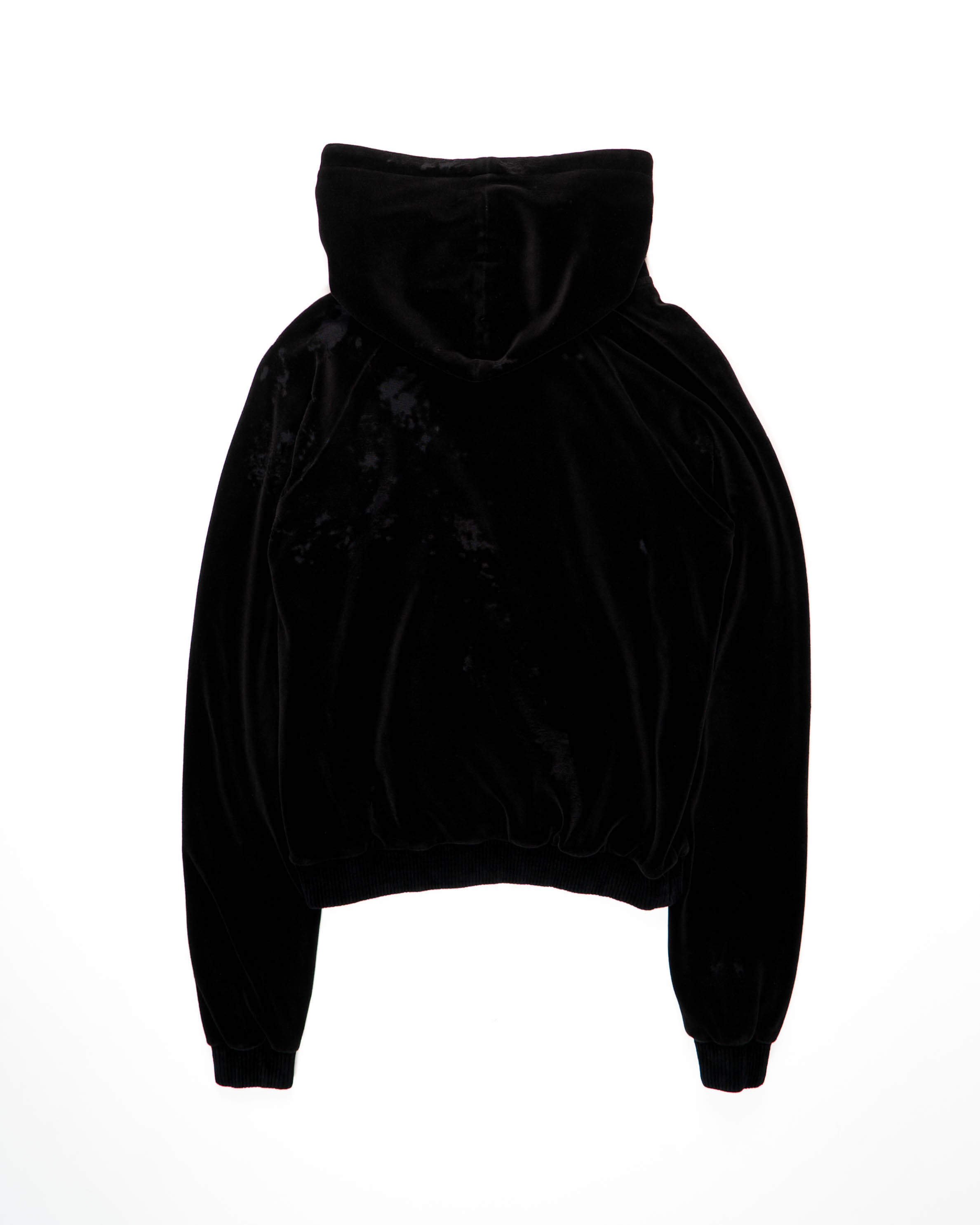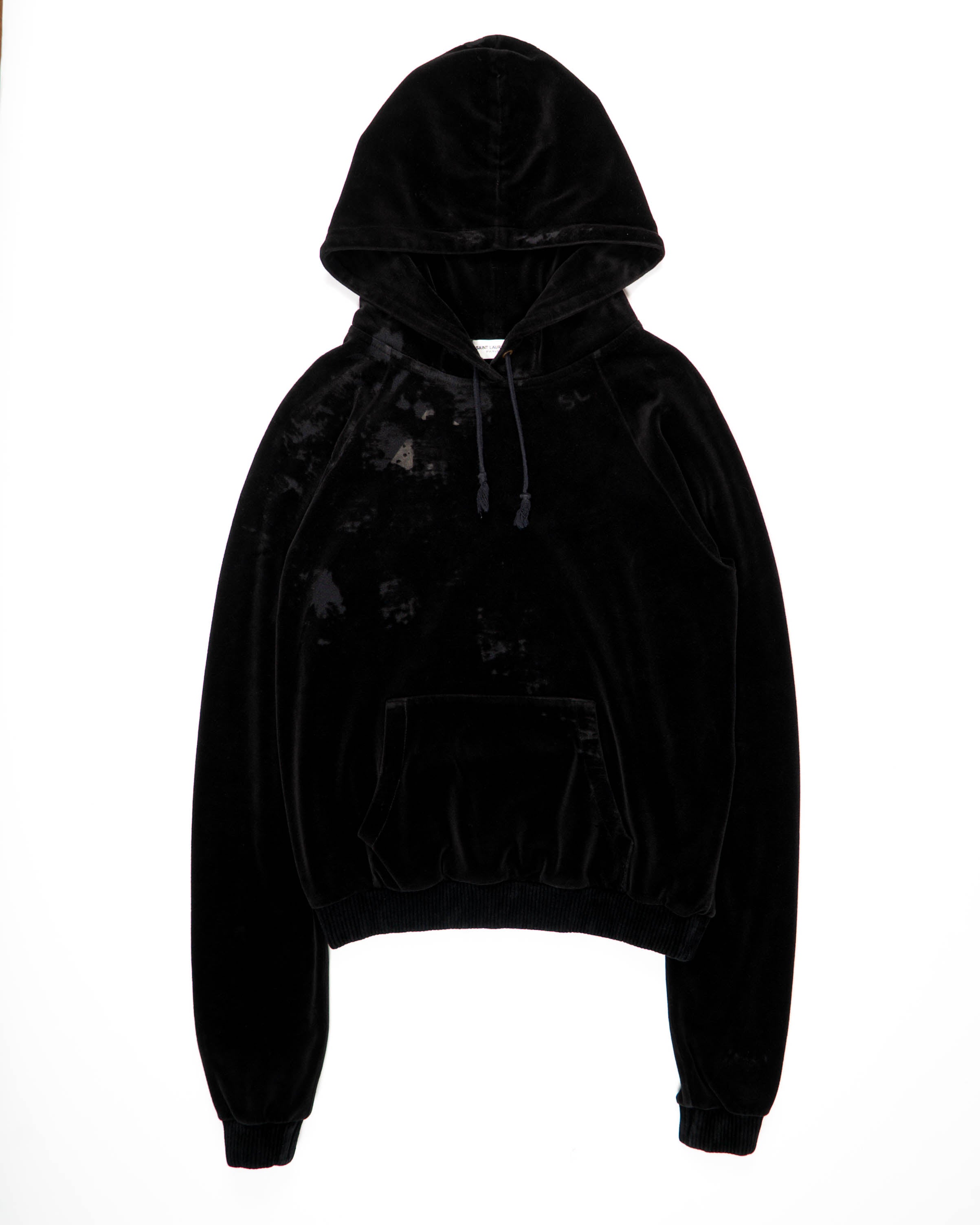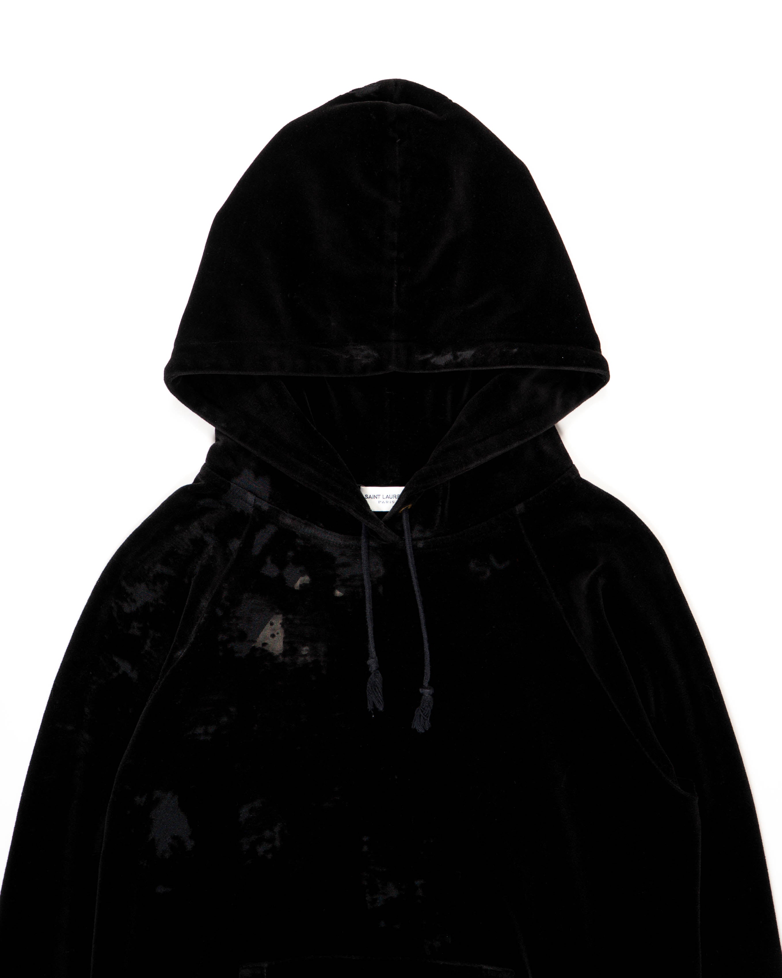 This Saint Laurent hoodie from FW18 reimagines casualwear with a subversive twist. Crafted from plush black velvet, the piece balances luxury and rebellion, while subtle distressing throughout introduces an intentionally used character. Its slouchy fit and soft feel contrast with the raw edge of the detailing, embodying Slimane’s ability to fuse refinement with grunge energy. A piece that transforms the everyday hoodie into something elevated.