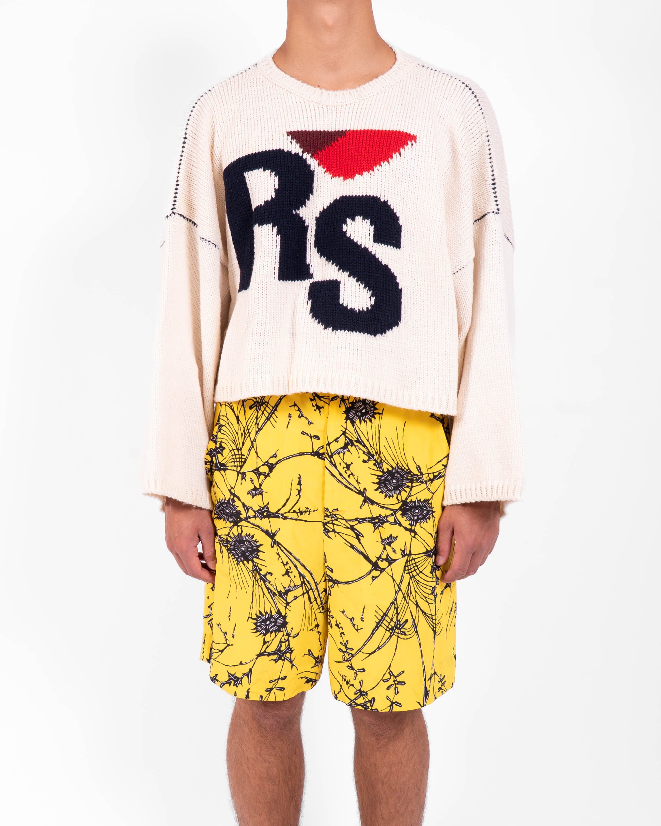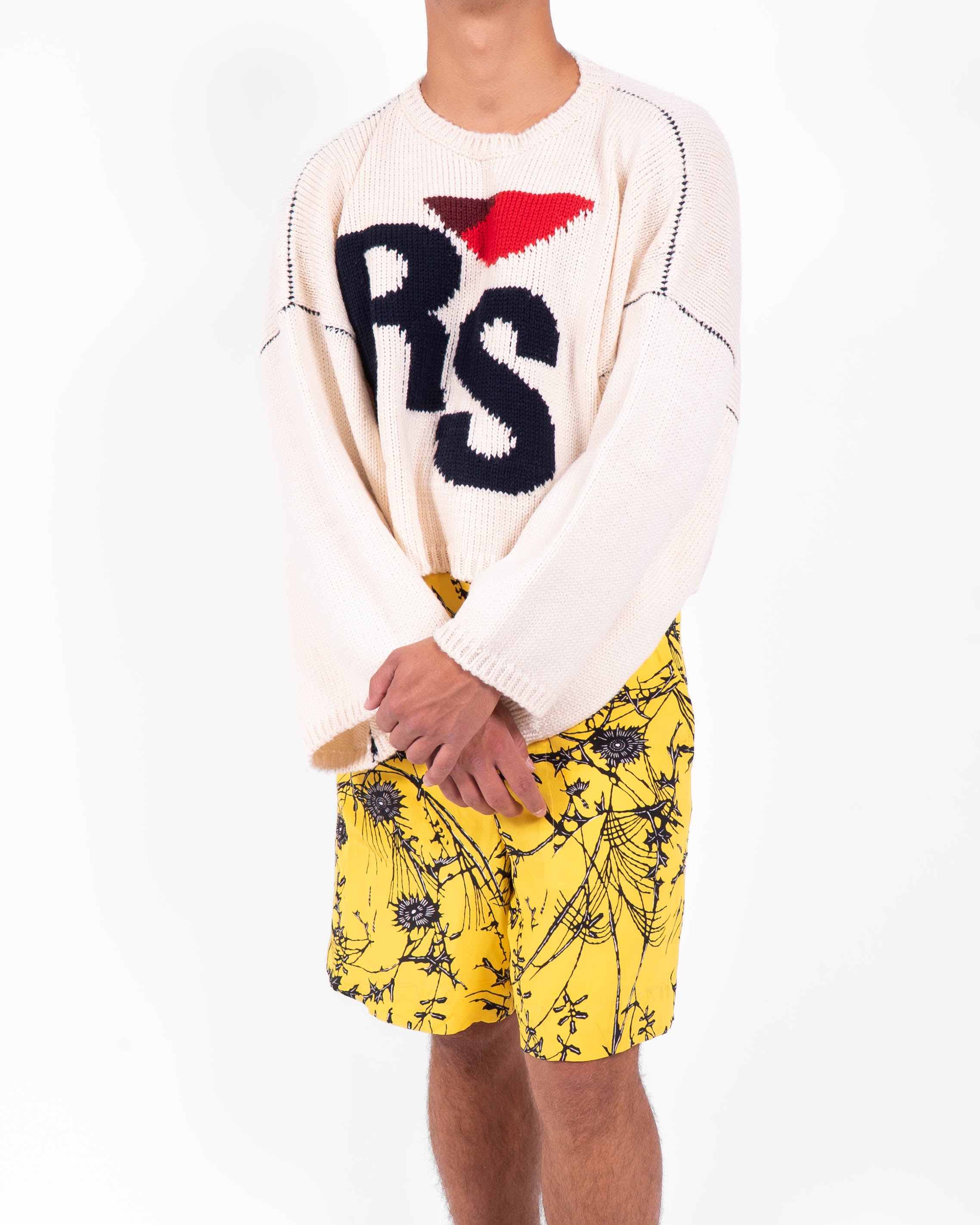From the Fall Winter 2019 collection, this cropped sweater reflects Raf Simons’ continued dialogue between youth culture and refined minimalism. Knitted from soft virgin wool, the piece features a bold intarsia logo across the chest an emblem of identity rendered through precise craftsmanship.