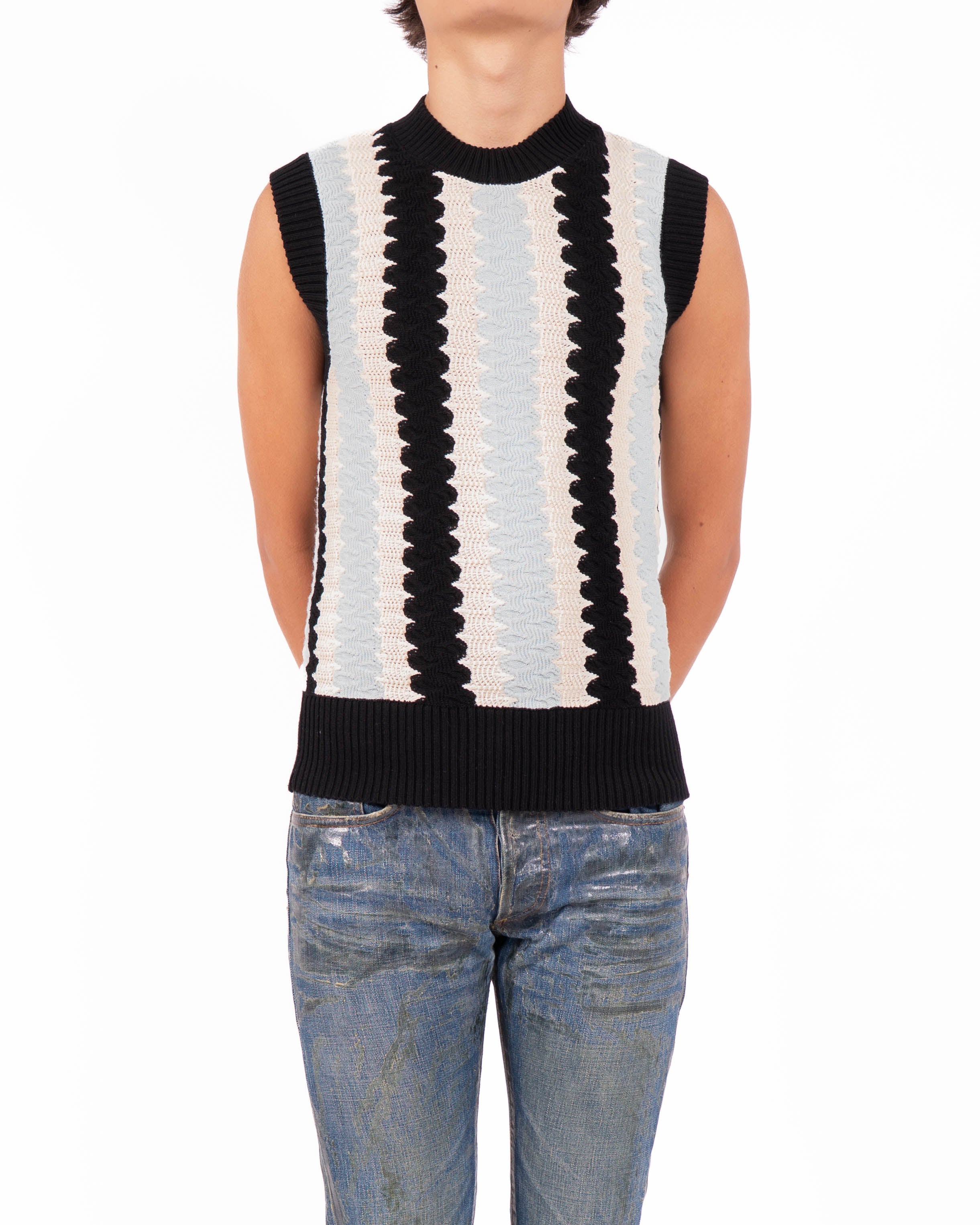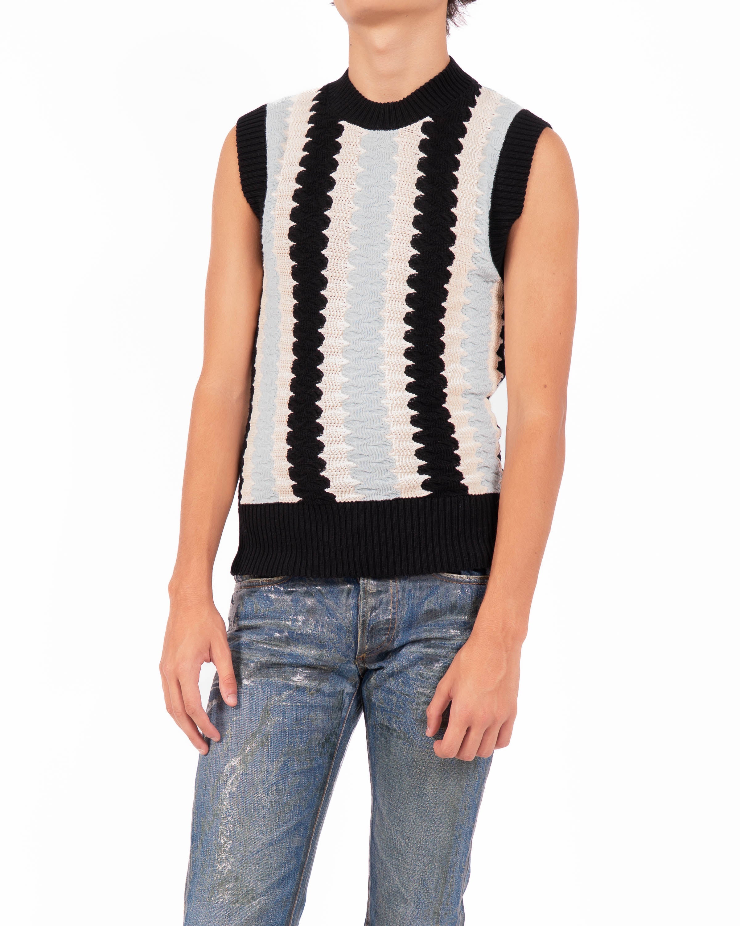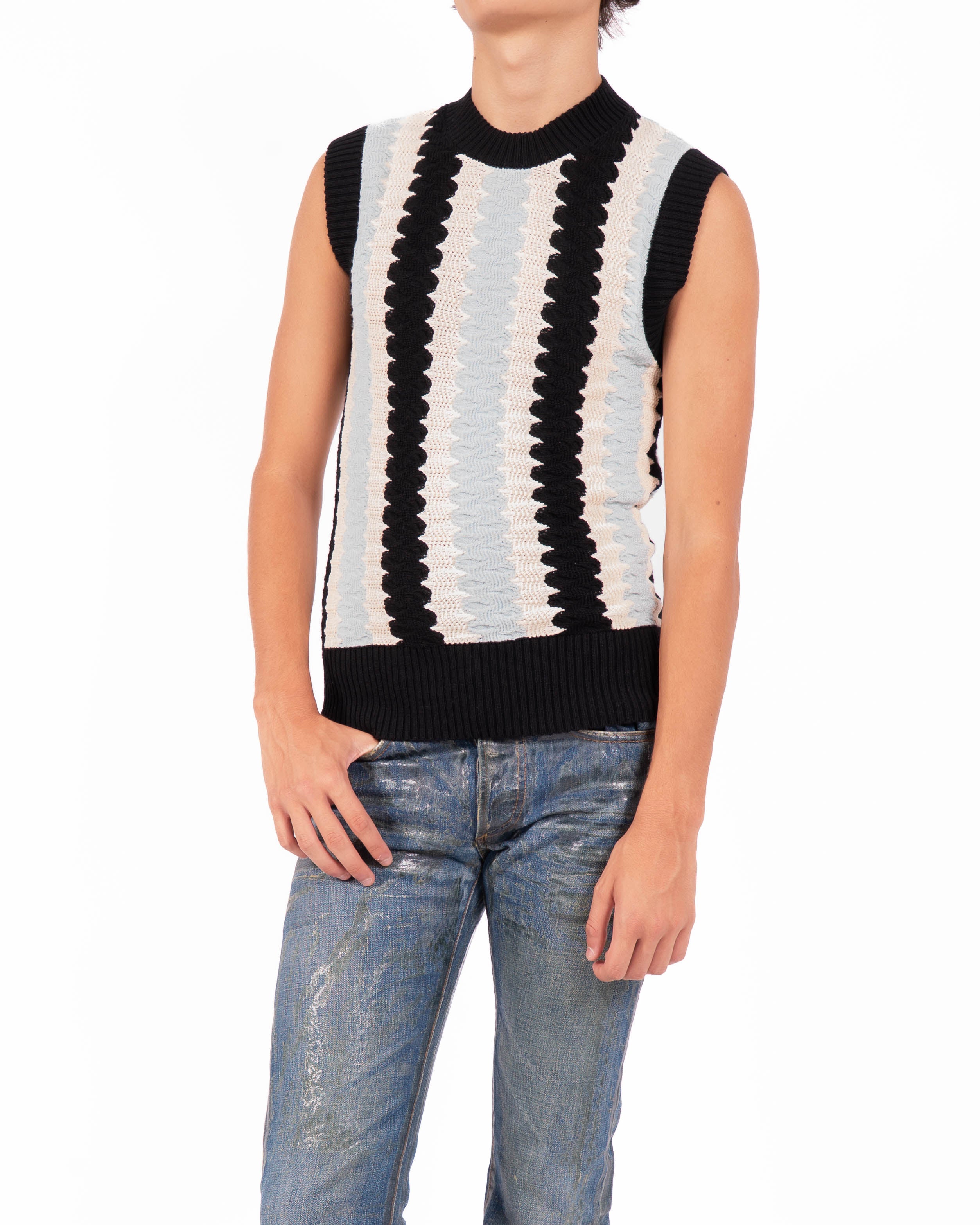 Part of the Spring Summer 2019 collection, this sleeveless vest introduces a vertical knit pattern in black, white, and grey. The clean crew neckline and ribbed hem frame the bold design, keeping the silhouette compact and direct.