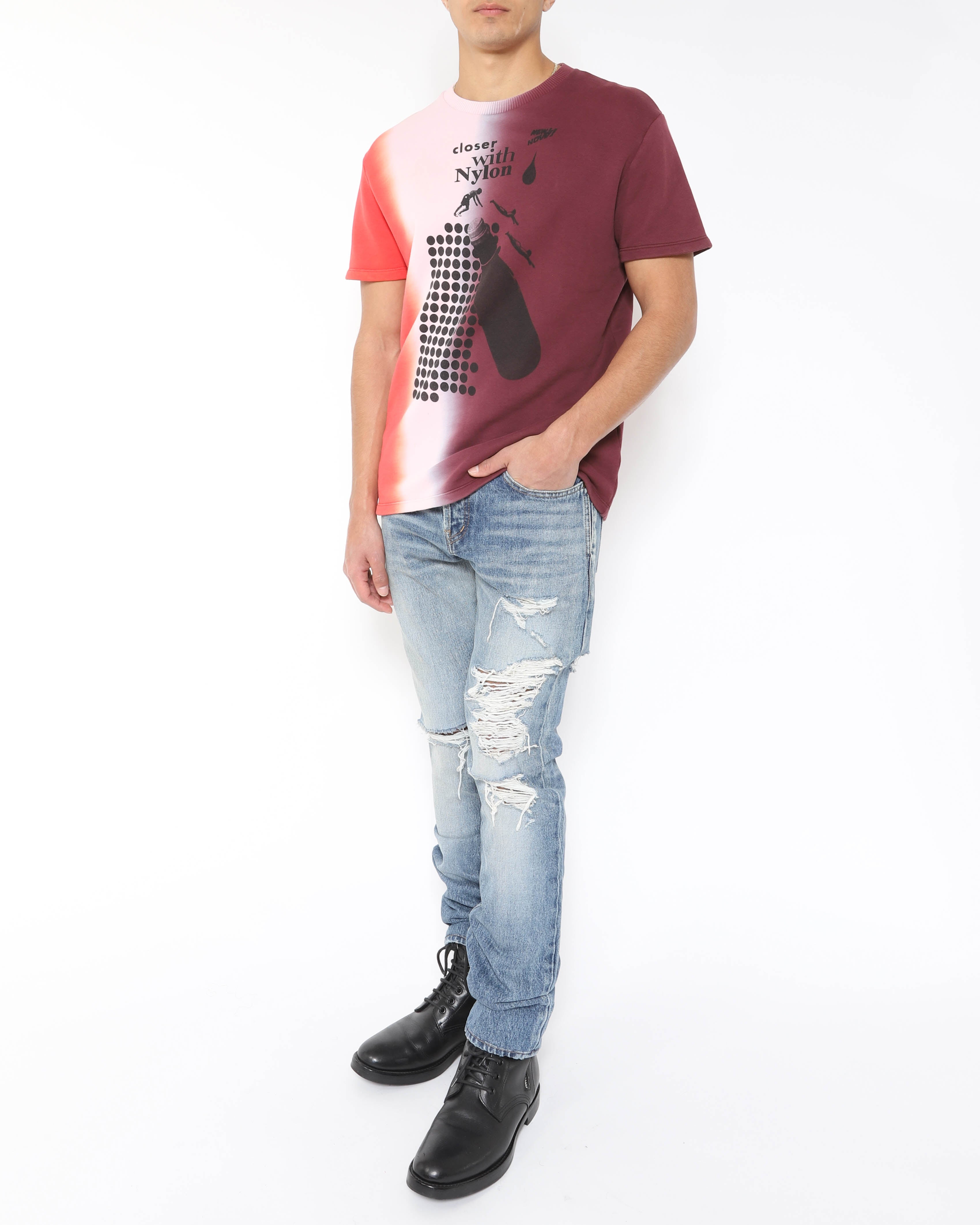 From SS14, this multicolor short sleeve T-shirt by Raf Simons is a straightforward everyday piece with a brighter, graphic leaning feel than a standard plain tee. It reflects the way Simons often used simple staples as a base for color and attitude, keeping the silhouette clean while letting the finish carry the look. Easy to wear on its own or layered under outerwear.
