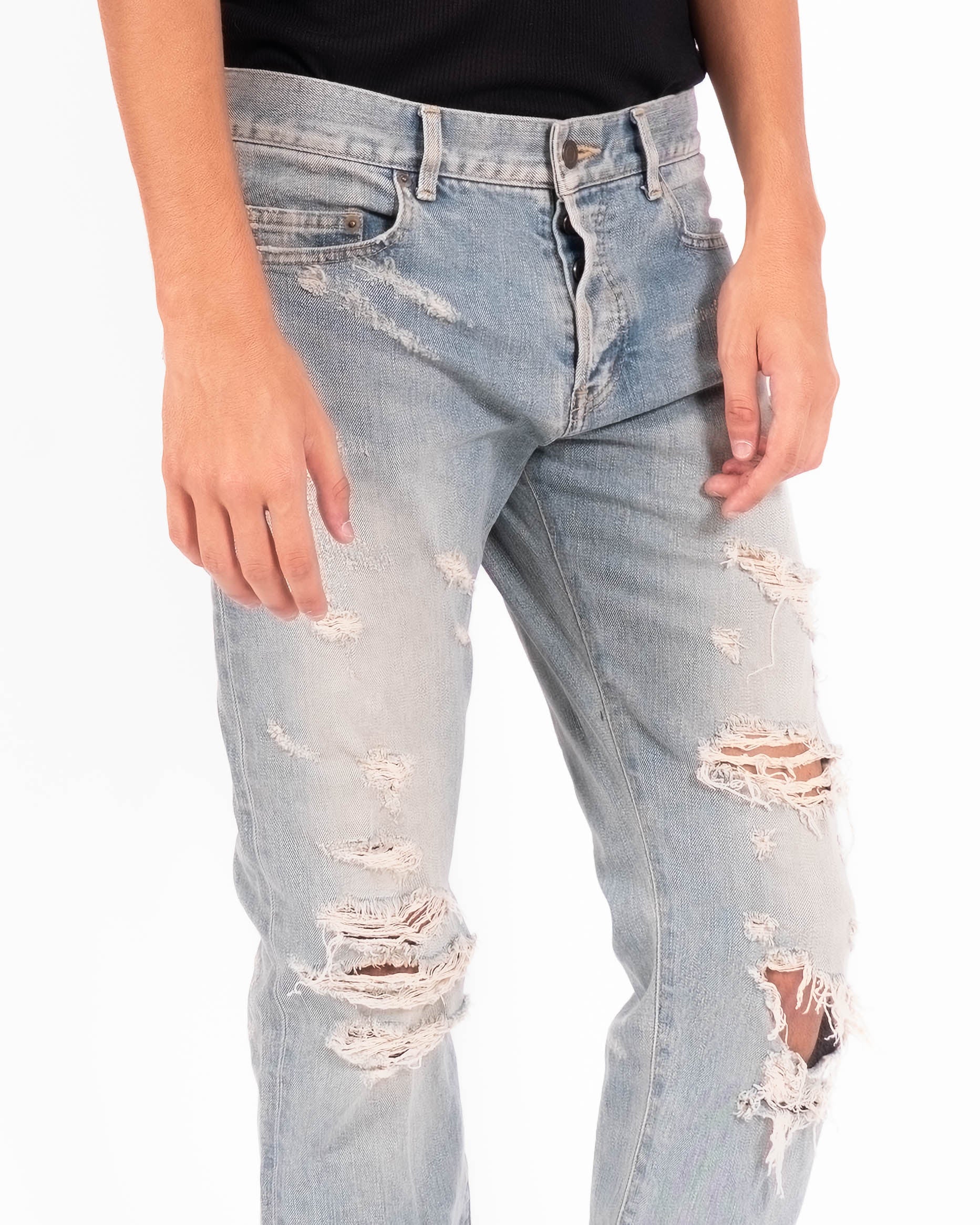 Crafted in washed blue denim, the fabric is heavily distressed with rips and abrasions, creating a used look that carries the raw edge of Hedi Slimane’s vision for Saint Laurent. Each tear is carefully placed, balancing rugged character with a sense of design.