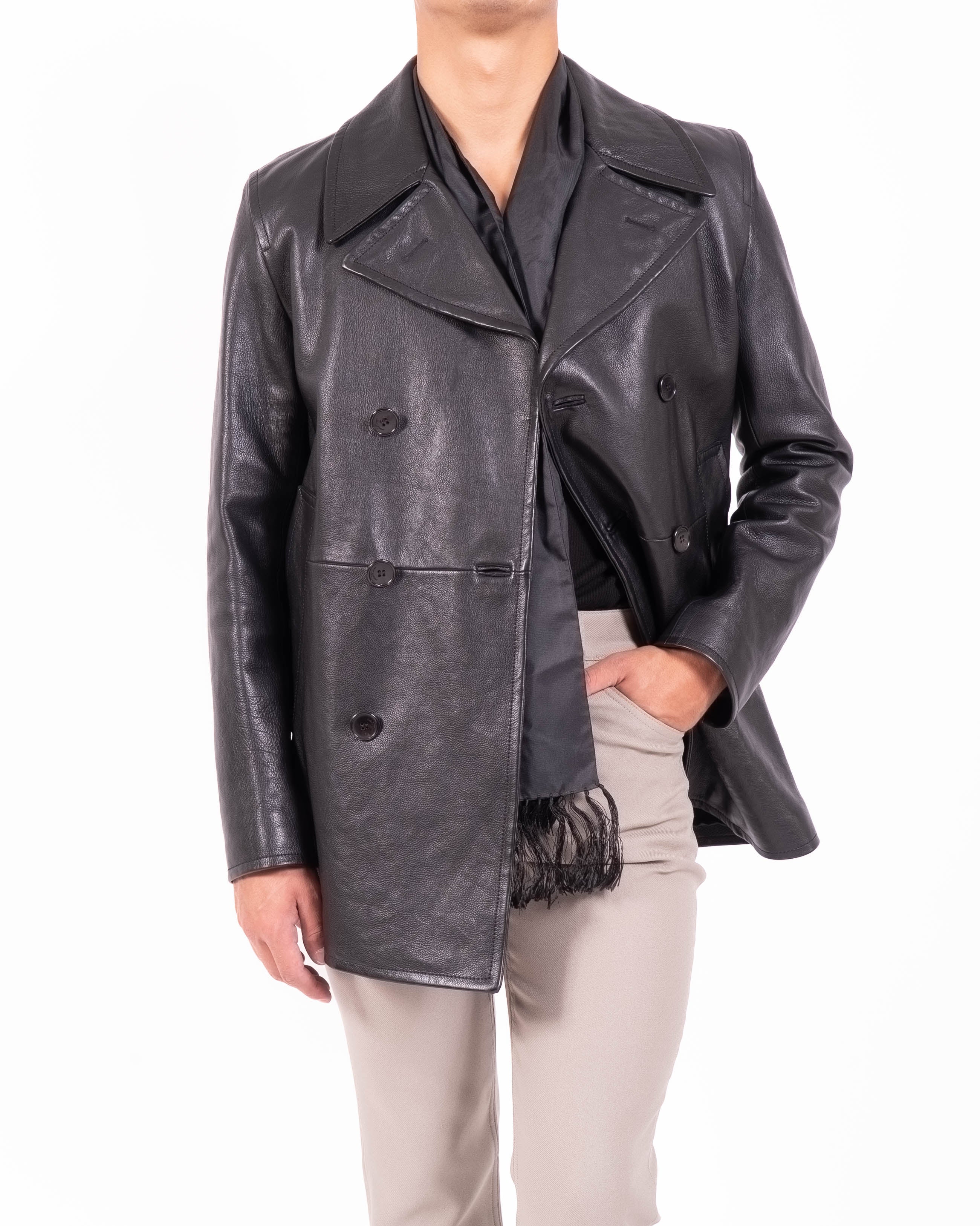 Introduced in the Fall Winter 2017 collection, this double-breasted coat reinterprets a classic outerwear form through the use of textured calf leather. Its boxy cut and elongated lines lend the piece a structured silhouette, while wide peak lapels and a six-button front closure underline its tailored foundation.