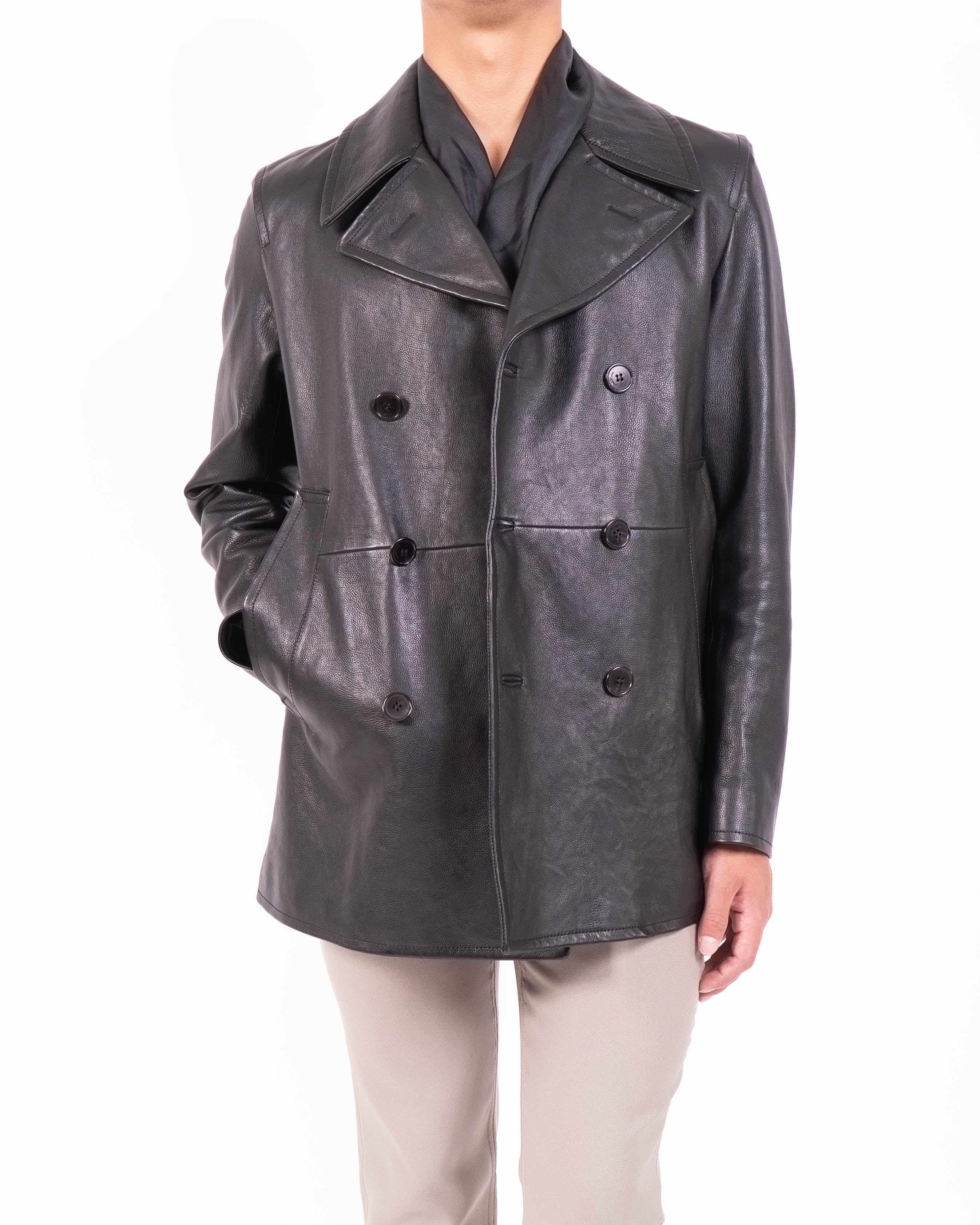 The leather’s grain brings depth to the surface, catching light with a muted sheen that emphasizes its robust character. Slanted welt pockets integrate into the design without disturbing its clean frontage, and the fully lined interior ensures ease of wear.