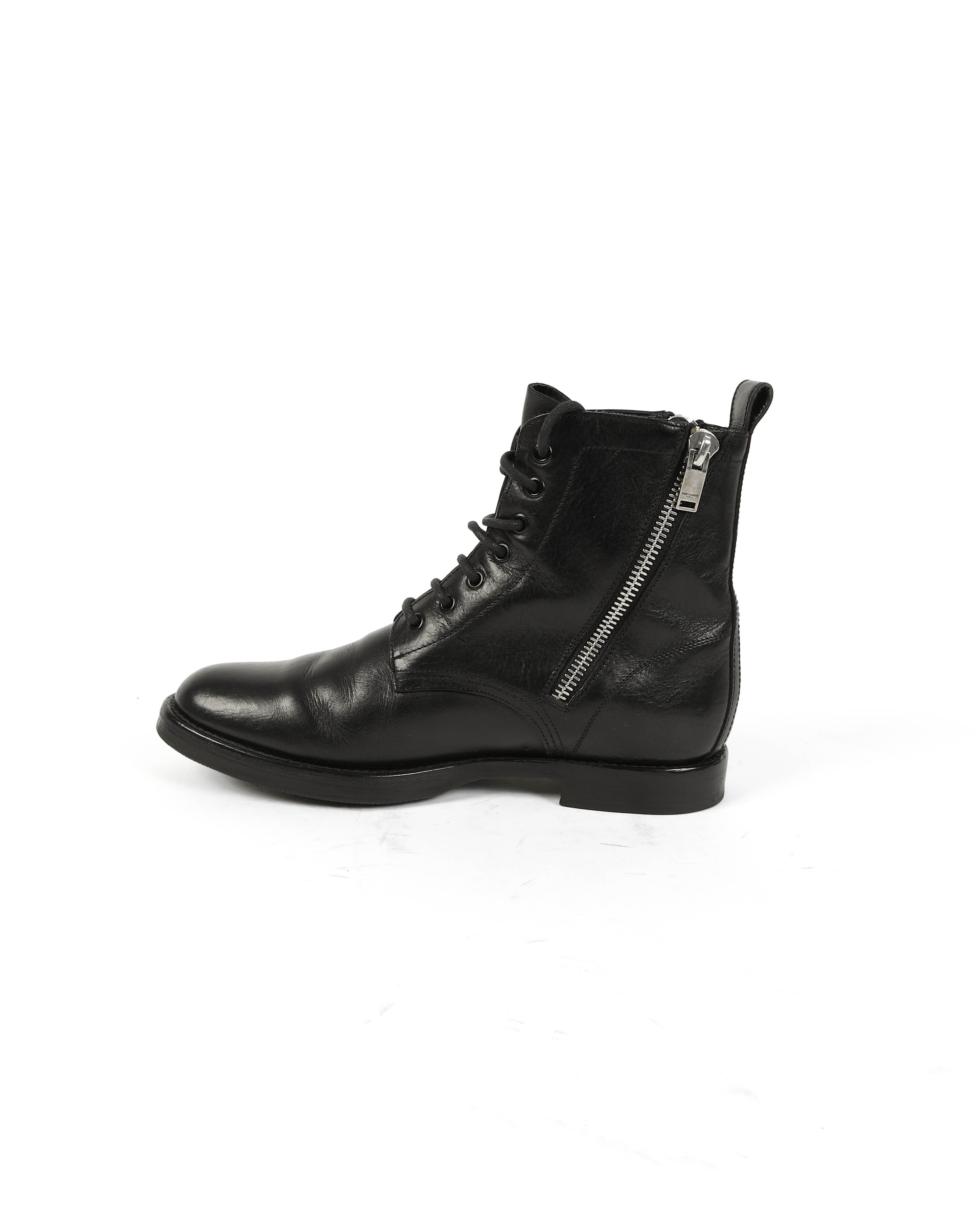 These double zip ranger boots from FW15 by Saint Laurent are defined by rugged form and sharp detailing. Crafted in smooth black leather, the dual vertical zippers flank the lacing, giving the silhouette bold structure.