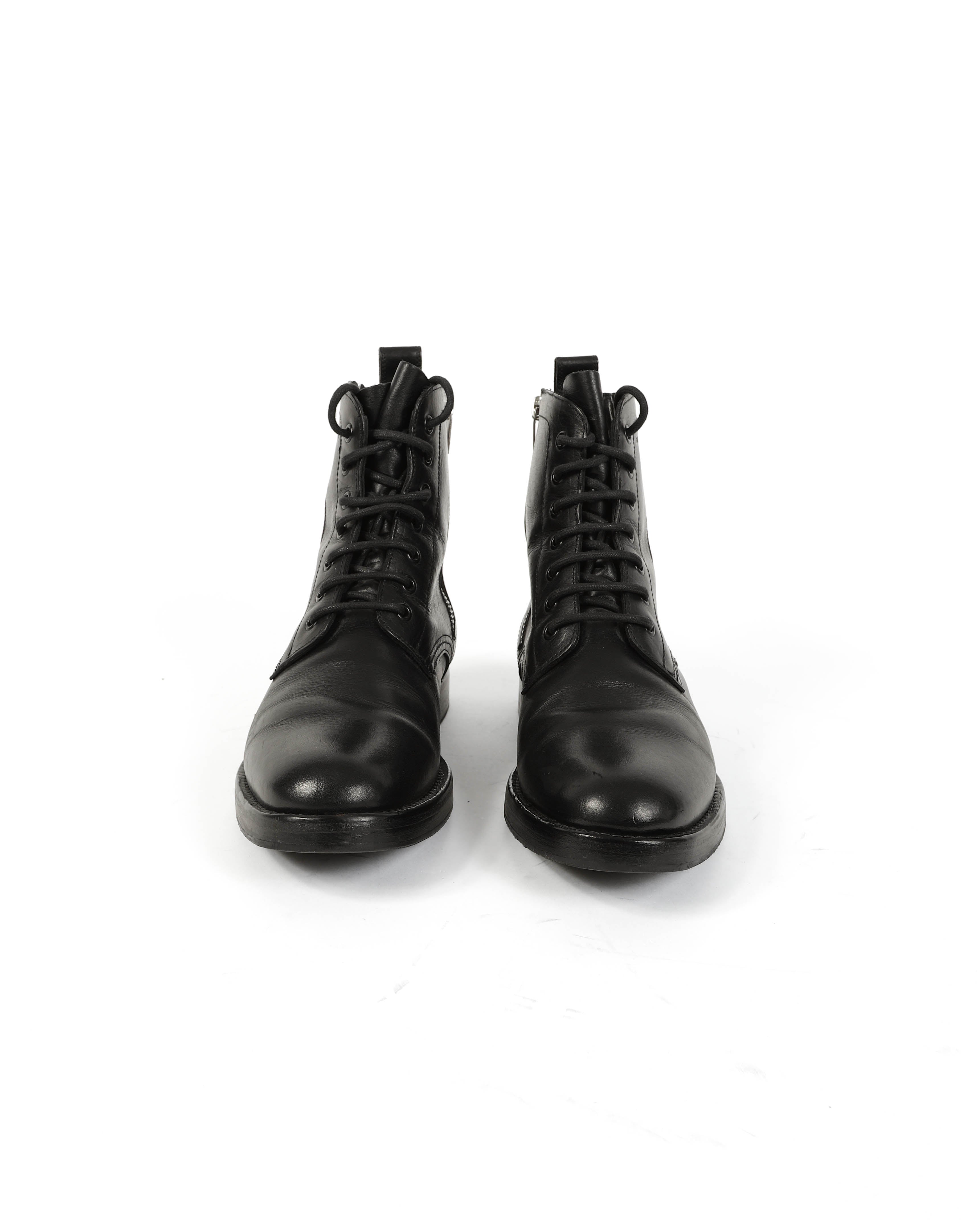 The toe is rounded but firm, and the height rises just above the ankle. Clean seams and minimal decorative hardware maintain a raw, utilitarian sensibility. Originally released under Hedi Slimane’s direction, this pair embodies the era’s push toward rock-inflected tailoring and elevated combat styles.