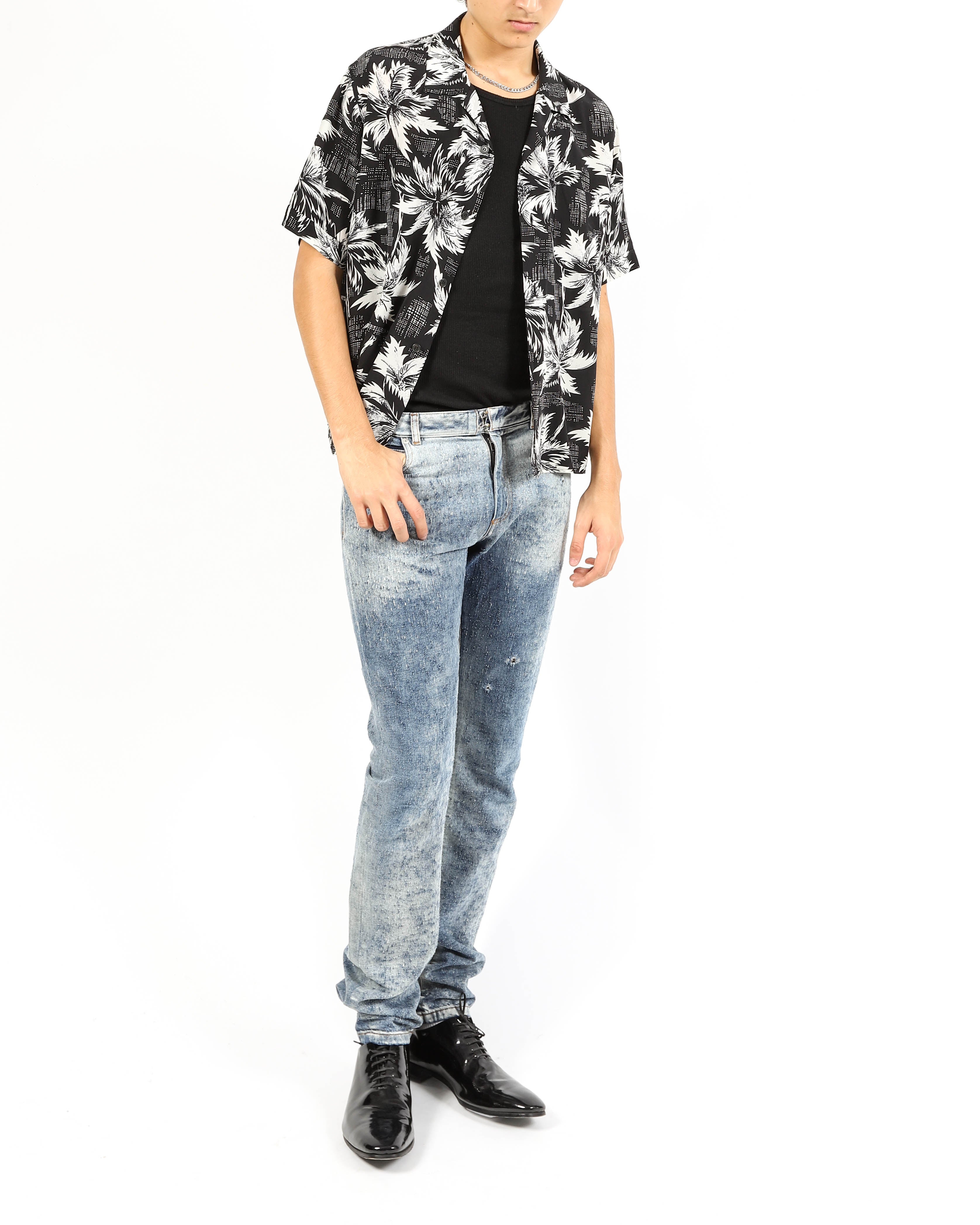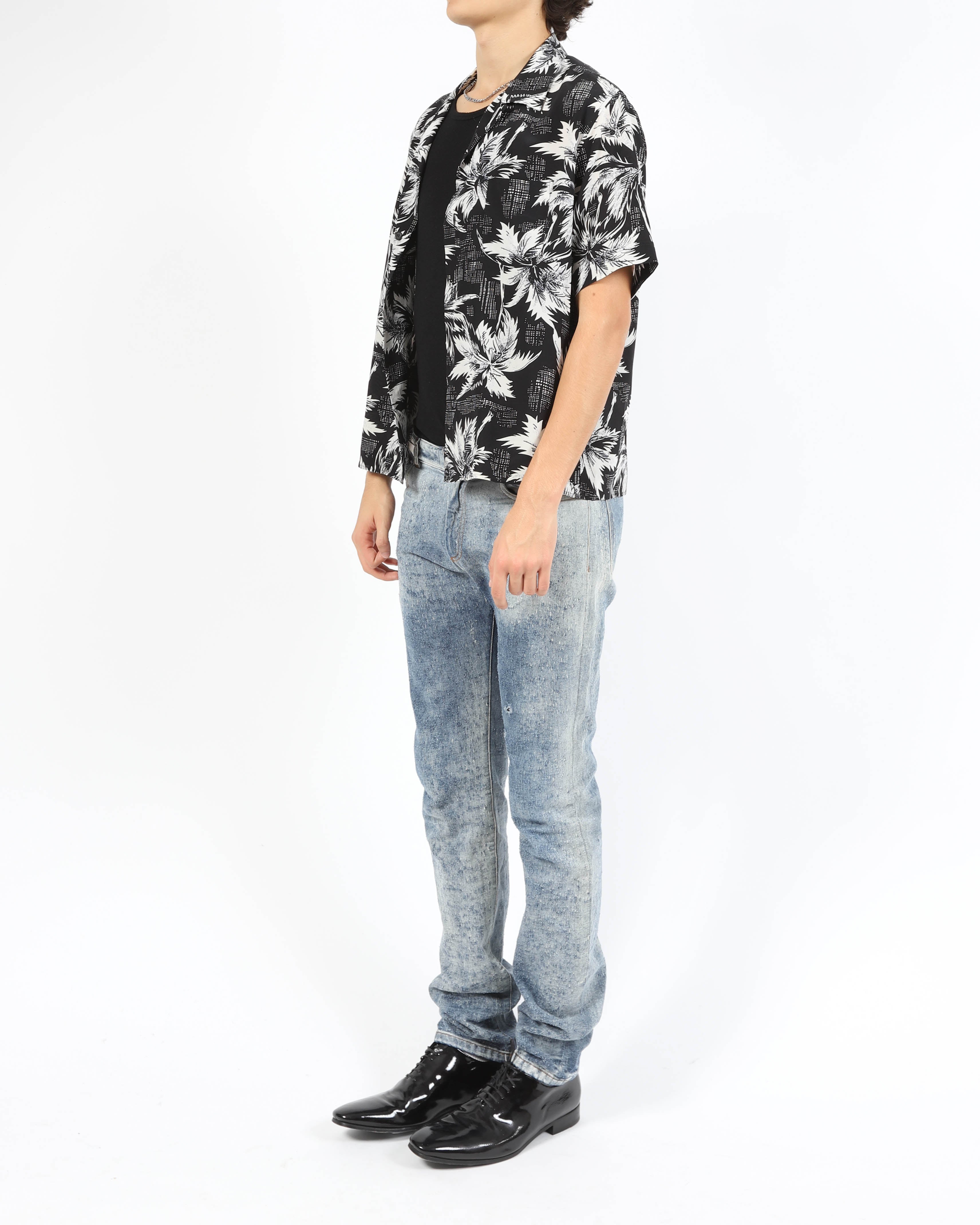 This black and white floral printed short sleeve shirt from SS14 is made of smooth silk, offering a light drape and subtle sheen. The all over floral motif balances contrast and elegance, turning a classic silhouette into a statement piece.