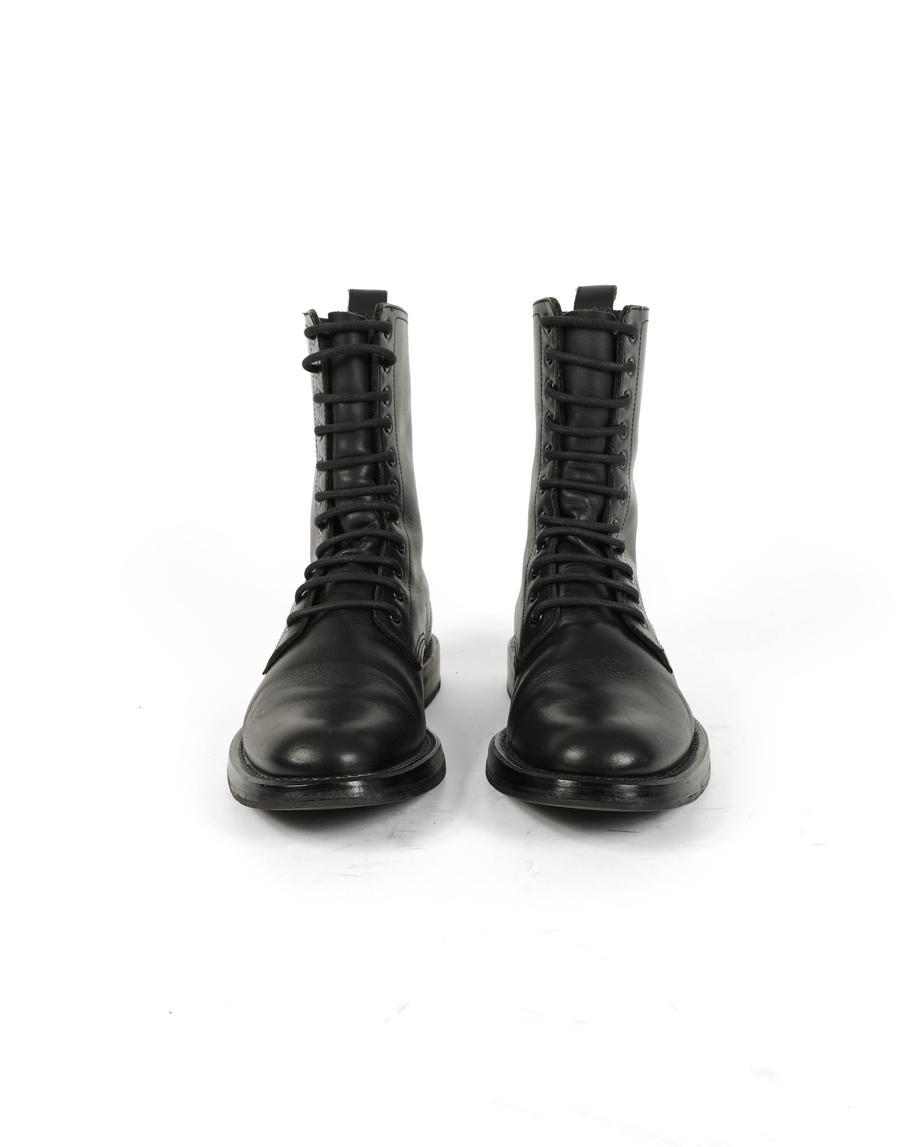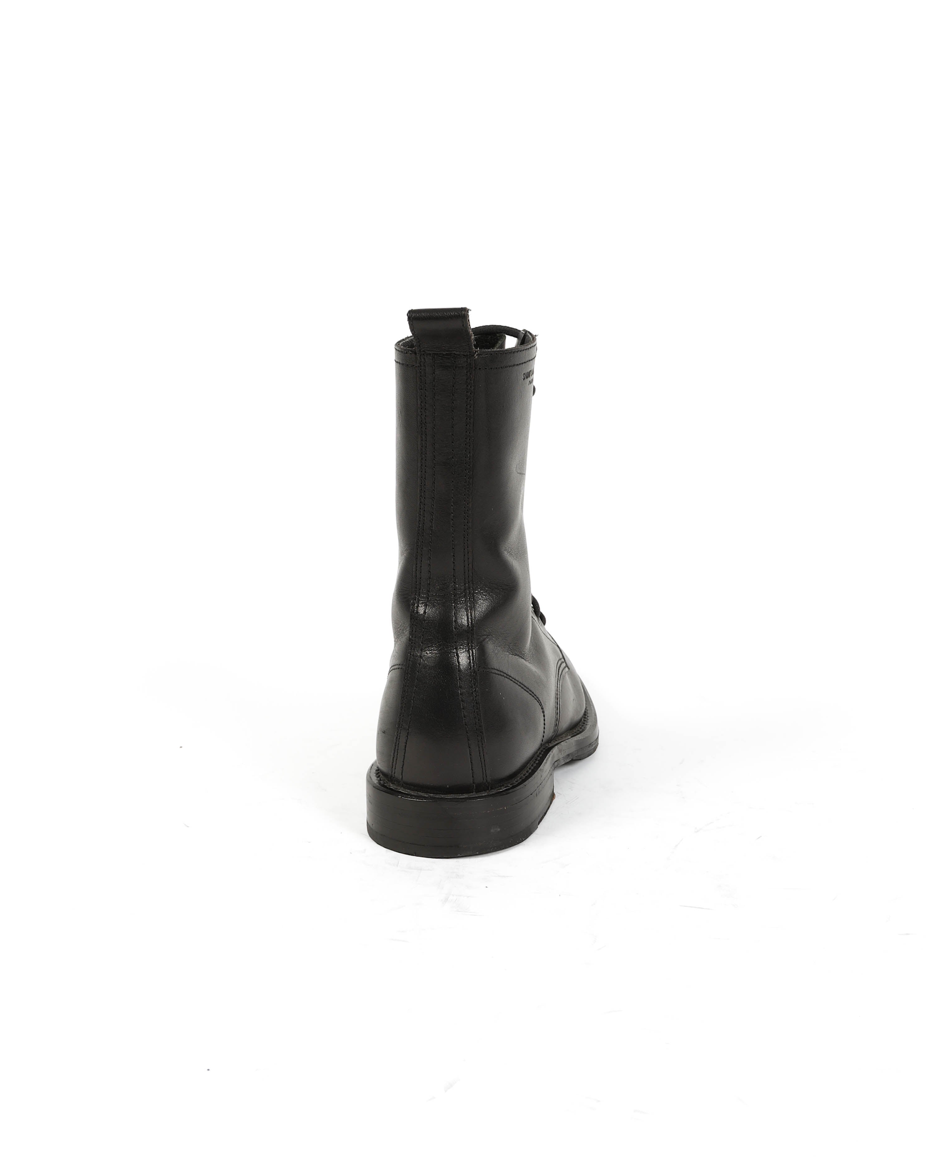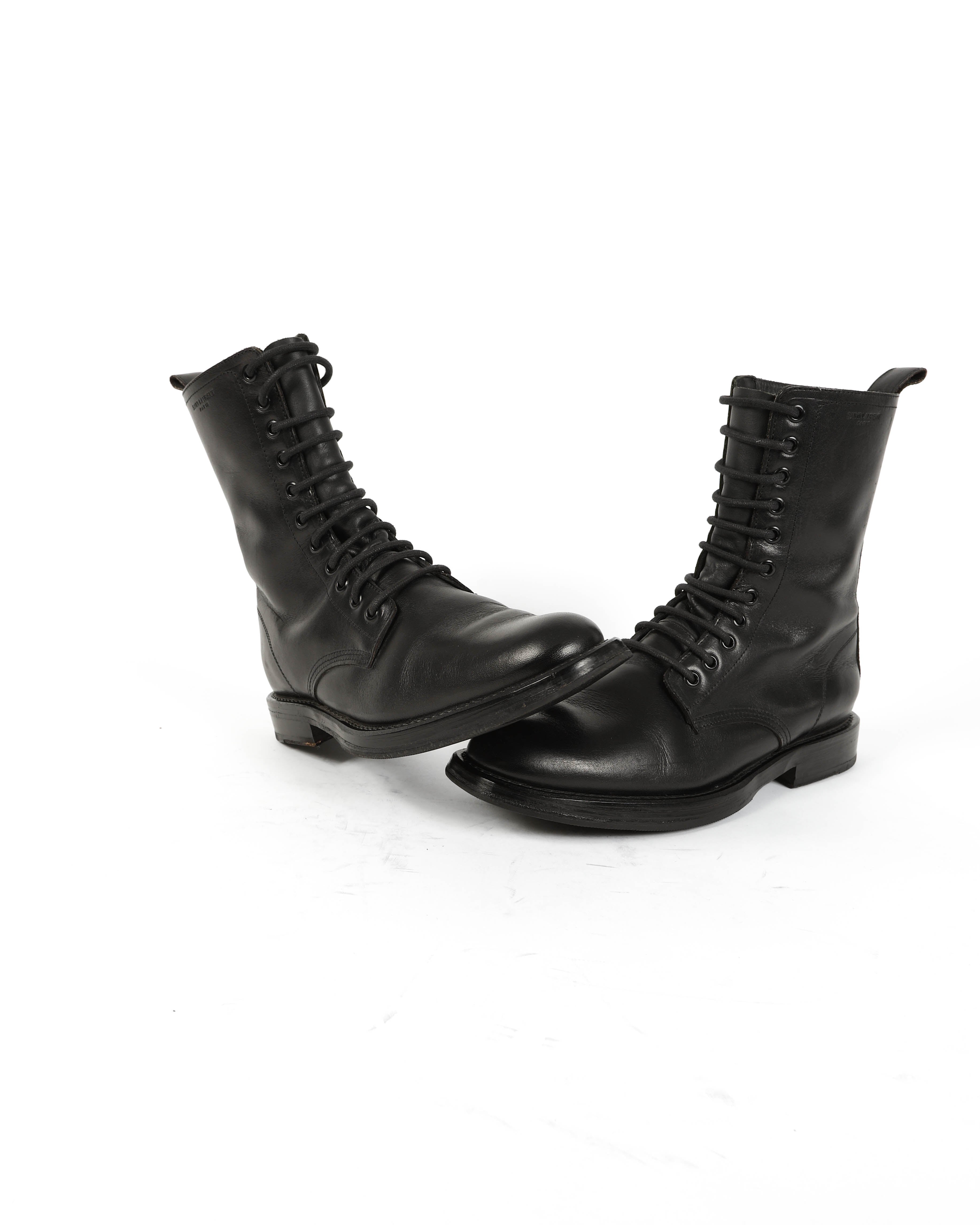 These 11-eye combat boots from the Hedi era FW14 blend rugged utility with a rock-inflected silhouette. Crafted in black leather, their tall shaft and ample eyelets lend an uncompromising presence.