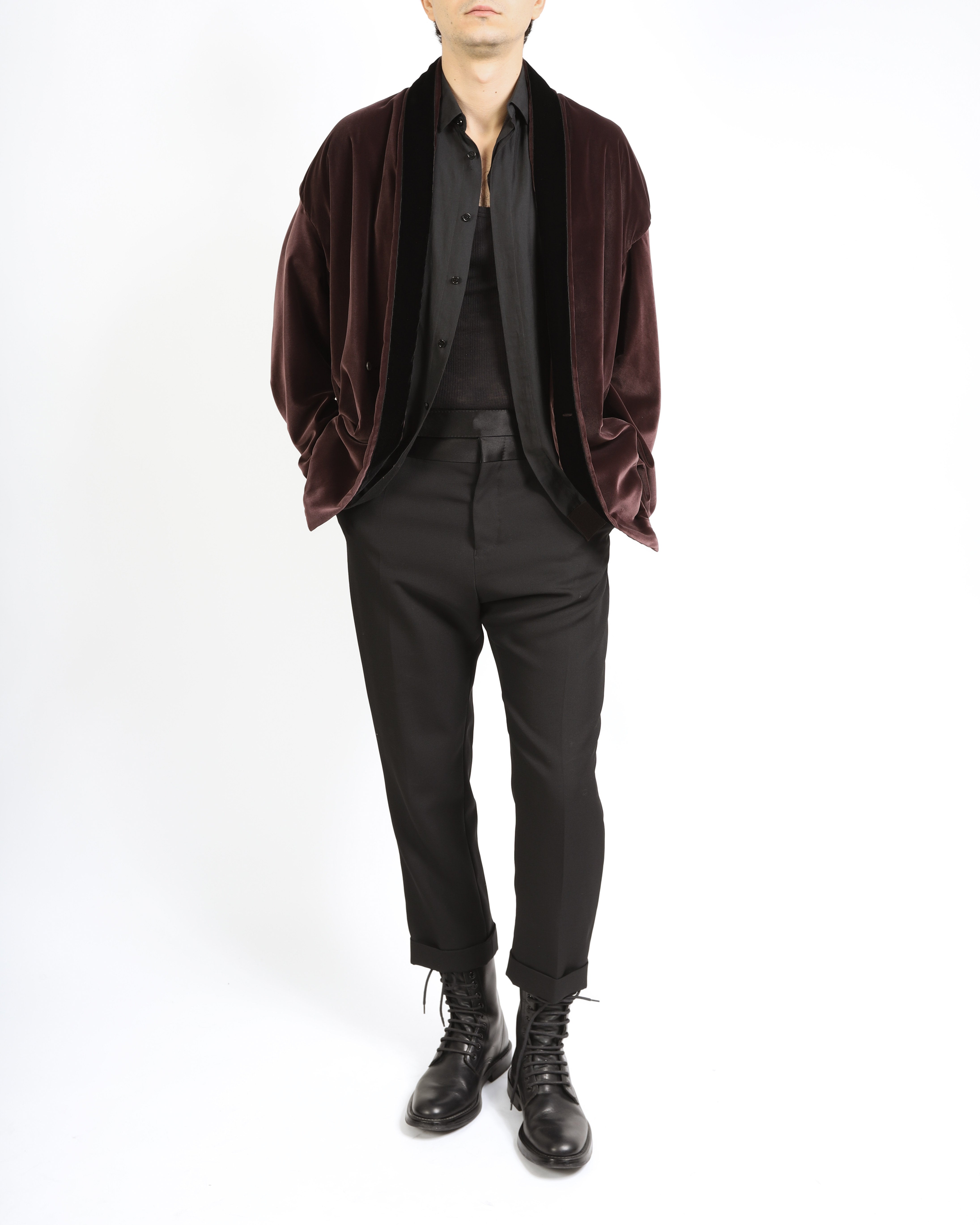 The Fall/Winter 2015 collection marked a significant milestone in Haider Ackermann's career and remains one of his most celebrated and iconic seasons to date. By presenting a range of remarkable menswear pieces, each characterized by their richness in color and exquisite fabric selection, Ackermann captivated audiences and critics alike. This collection demonstrated his masterful use of opulent textures, from luxurious velvet and jacquard to intricate embroidery and layering, setting a new standard for luxury menswear. The color palette was striking, featuring deep jewel tones - emerald greens, royal blues, and burgundies that evoked a sense of elegance and mystery.