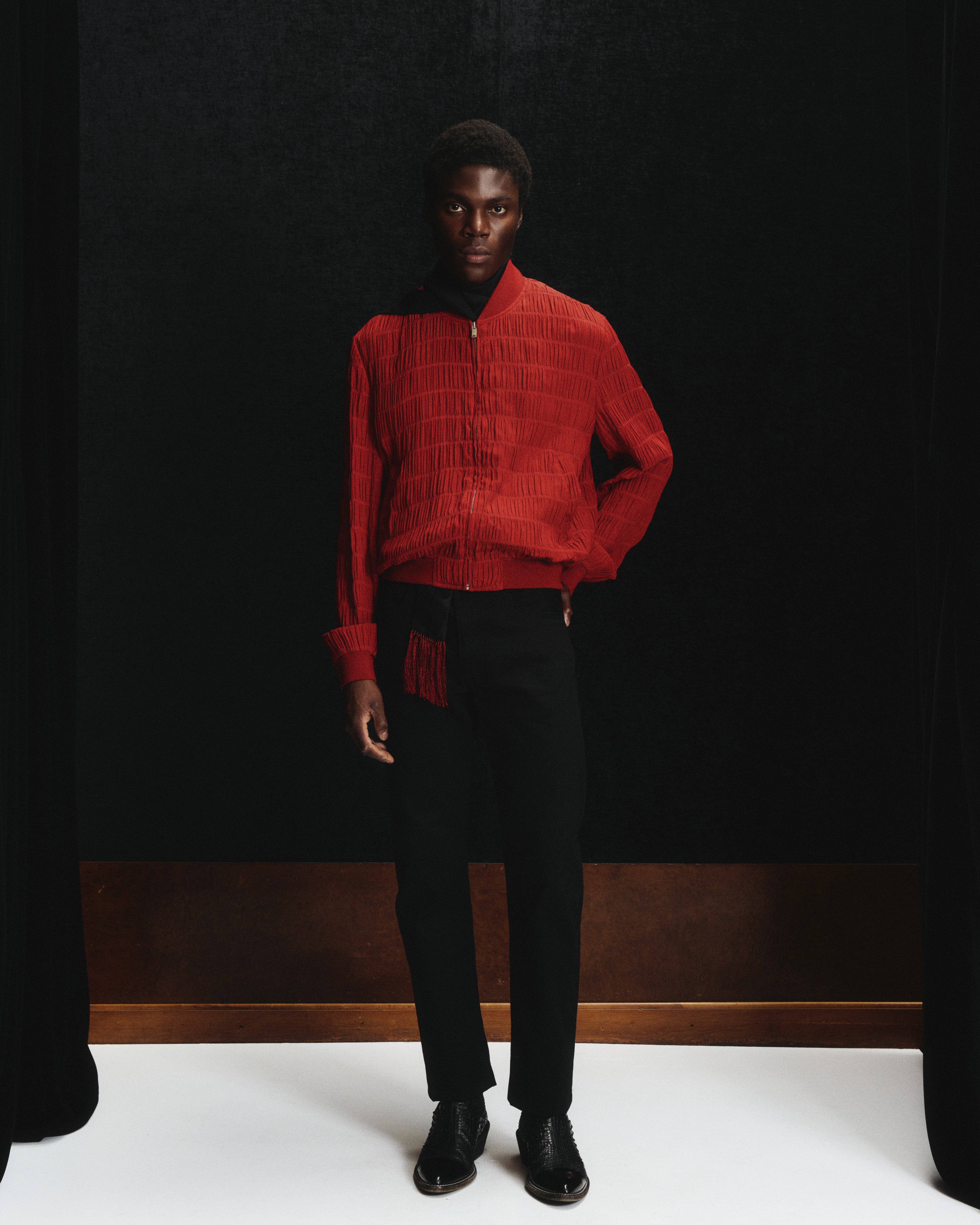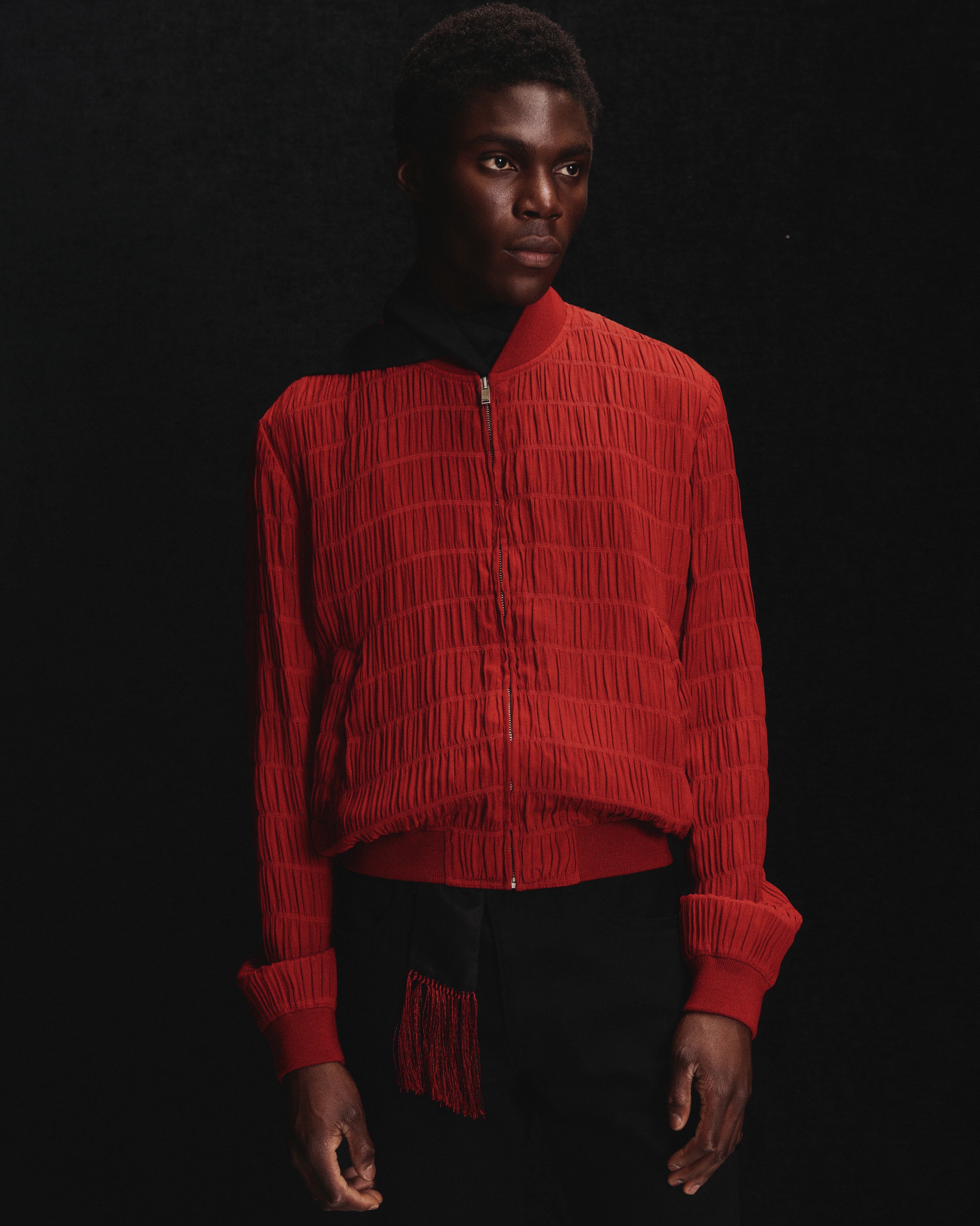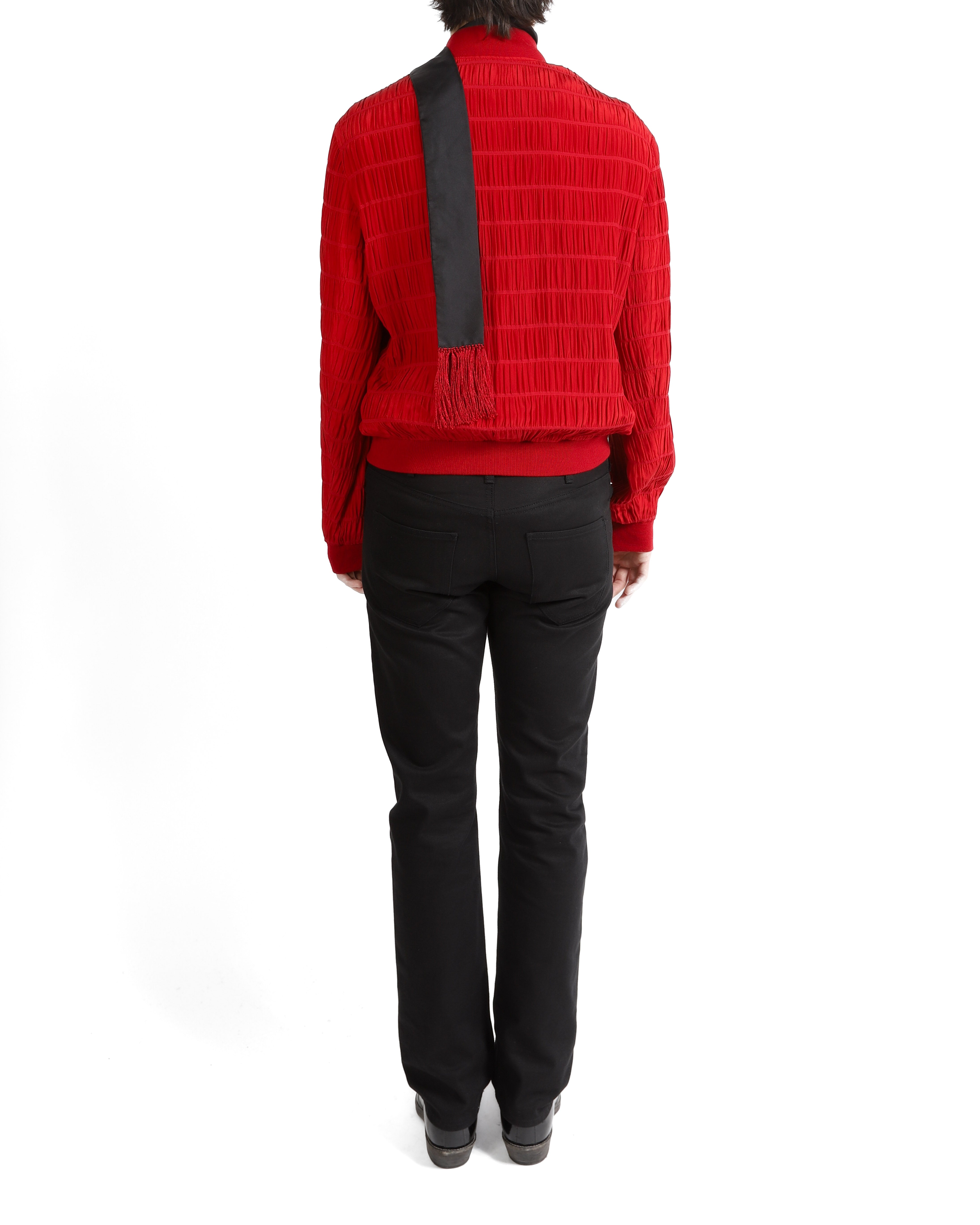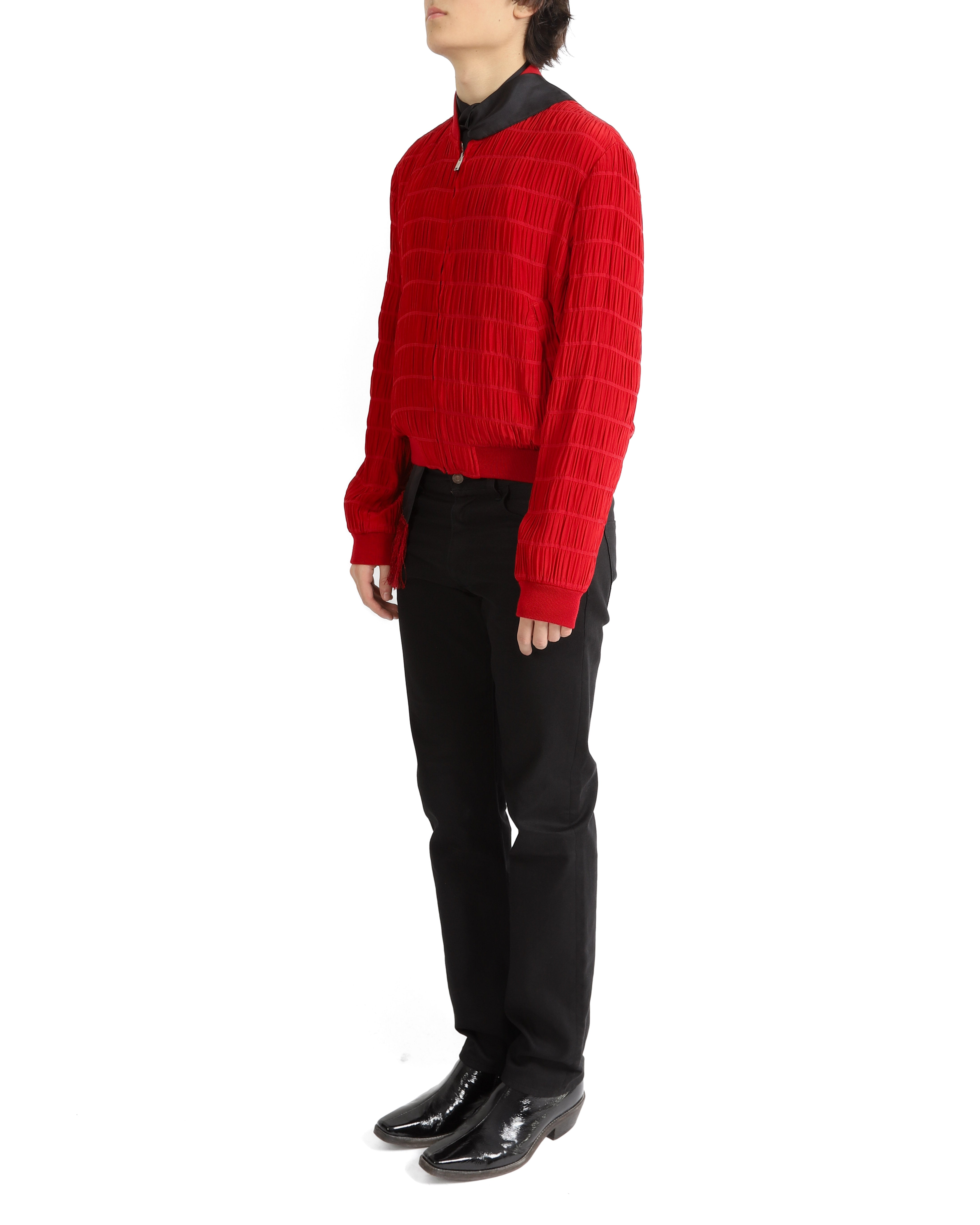 Cut from lightweight red silk with soft pleating, this bomber jacket offers movement and subtle structure. The cropped silhouette sits neatly at the waist. Part of the SS22 Saint Laurent collection, it reflects a refined take on a classic bomber shape.