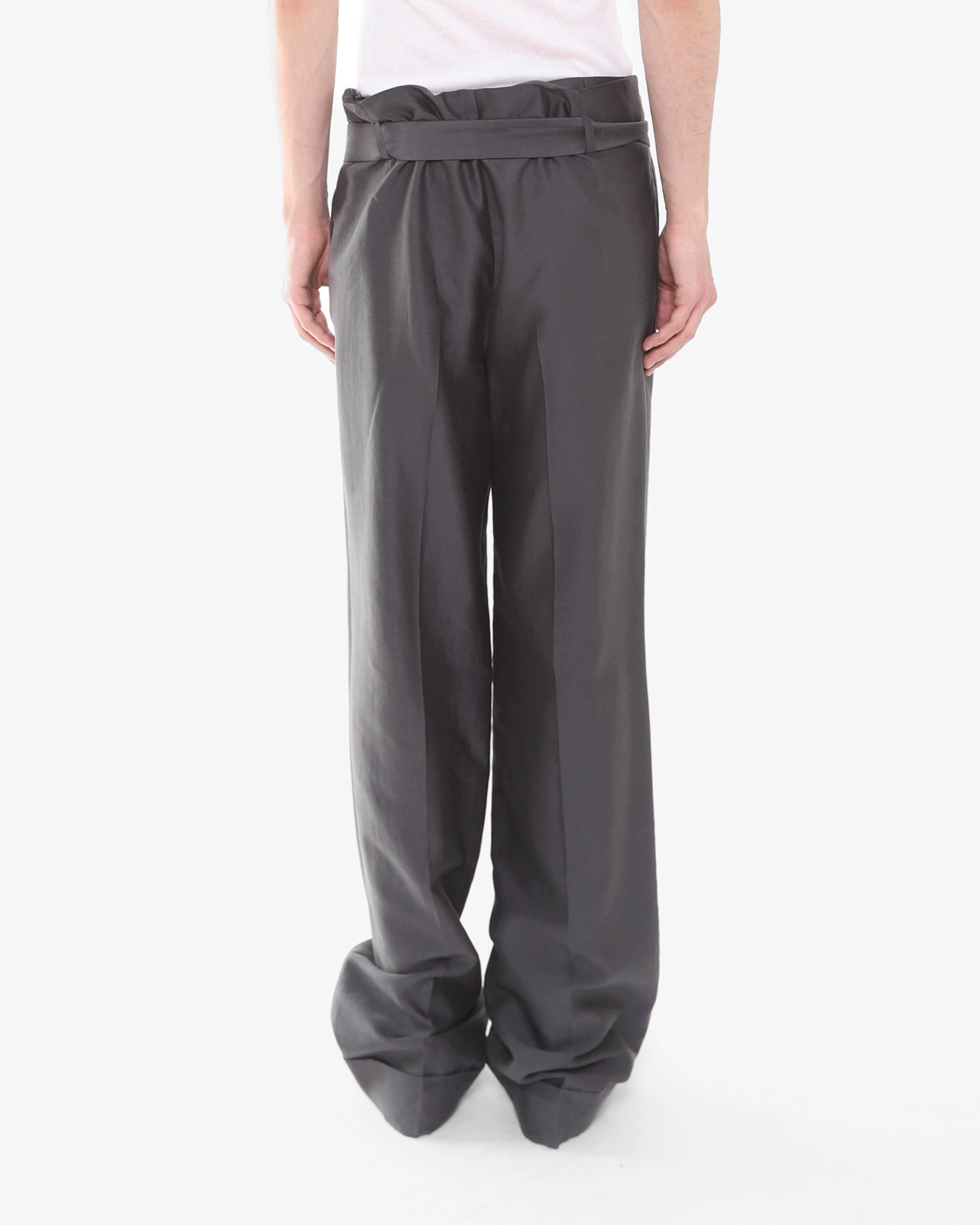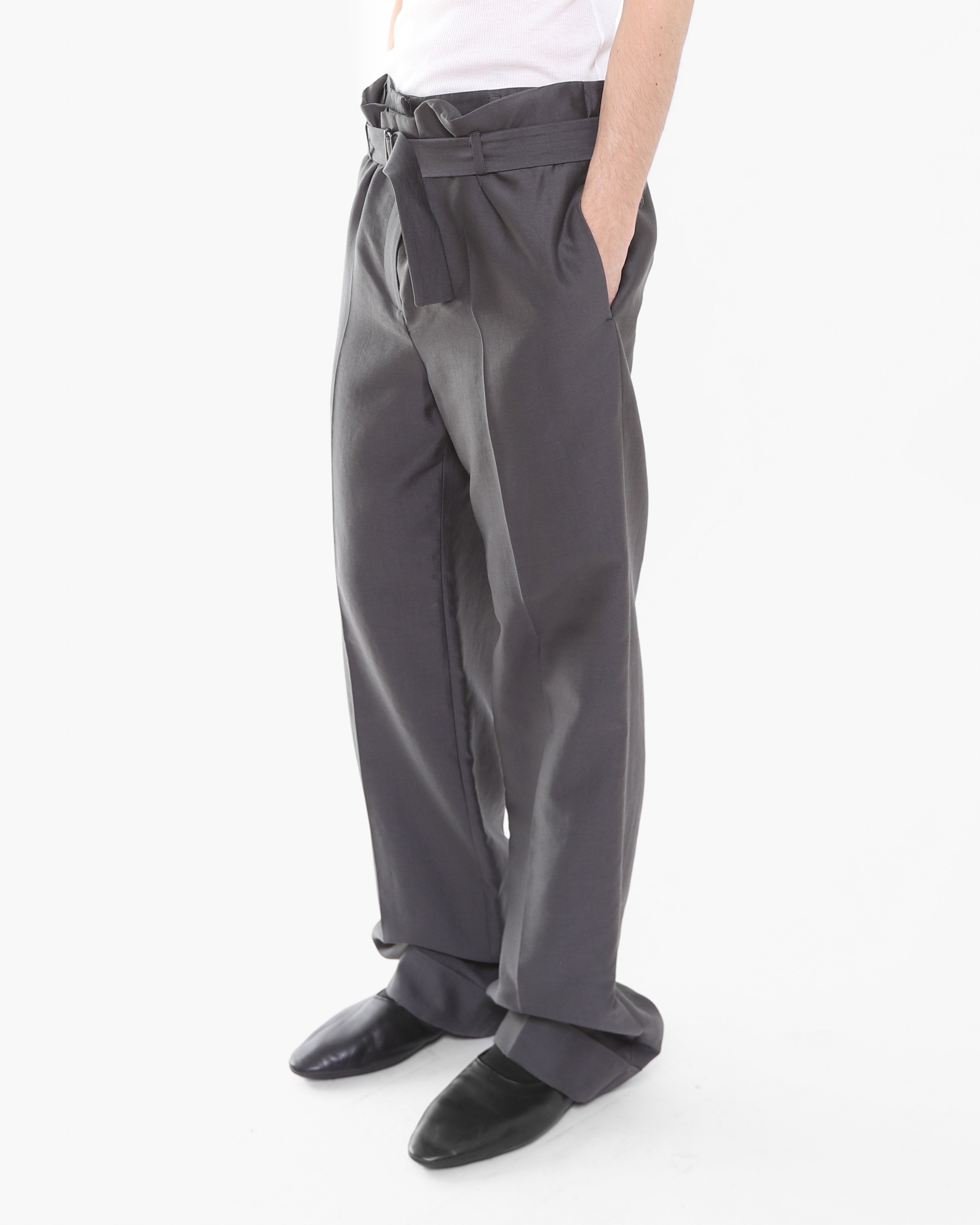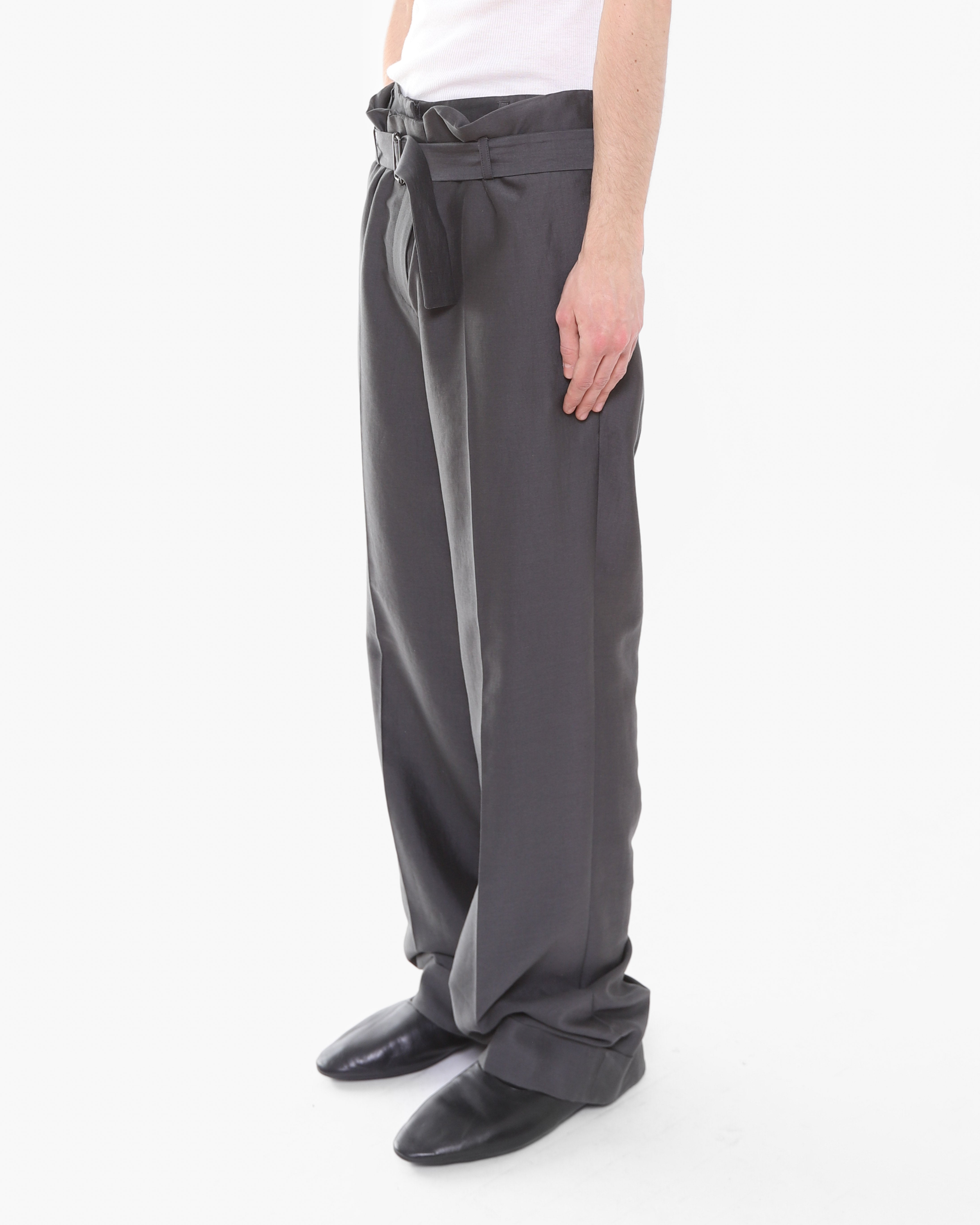 The trousers feature a signature double construction with a built-in short layer on the inside, showcasing the conceptual tailoring Haider became celebrated for. An adjustable waist belt allows for a customizable fit, while the relaxed leg is finished clean cuff at the hem. Understated yet considered in every detail.