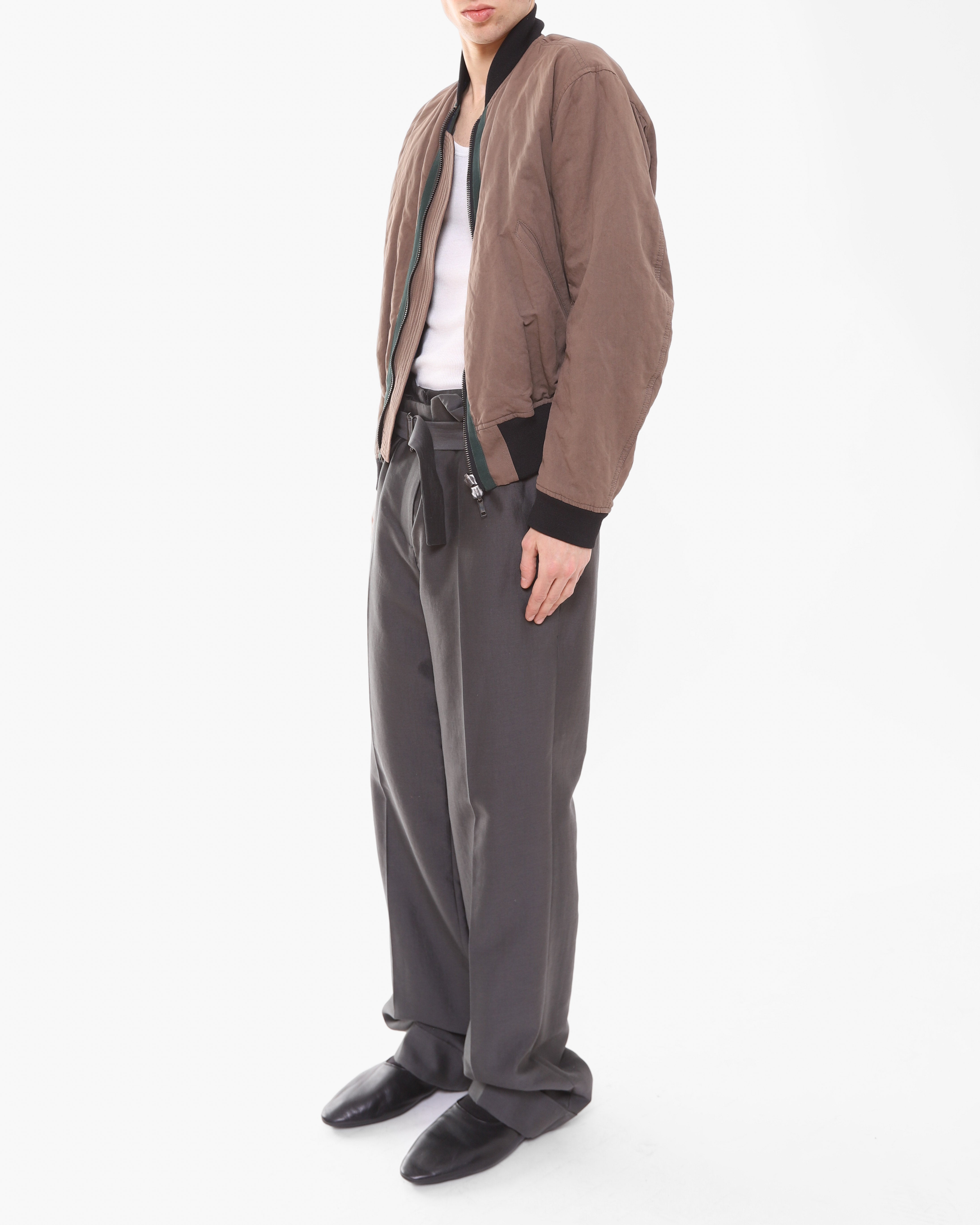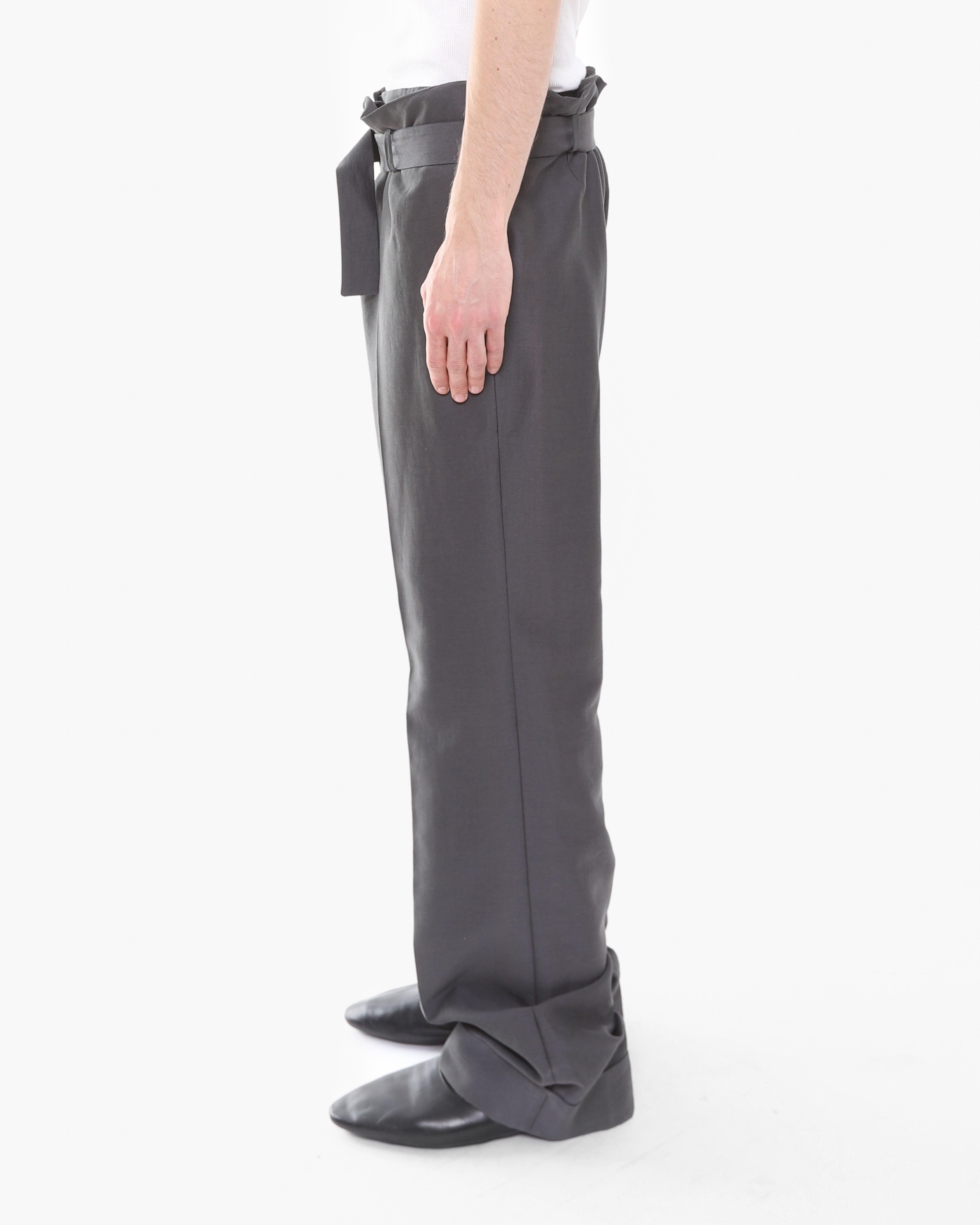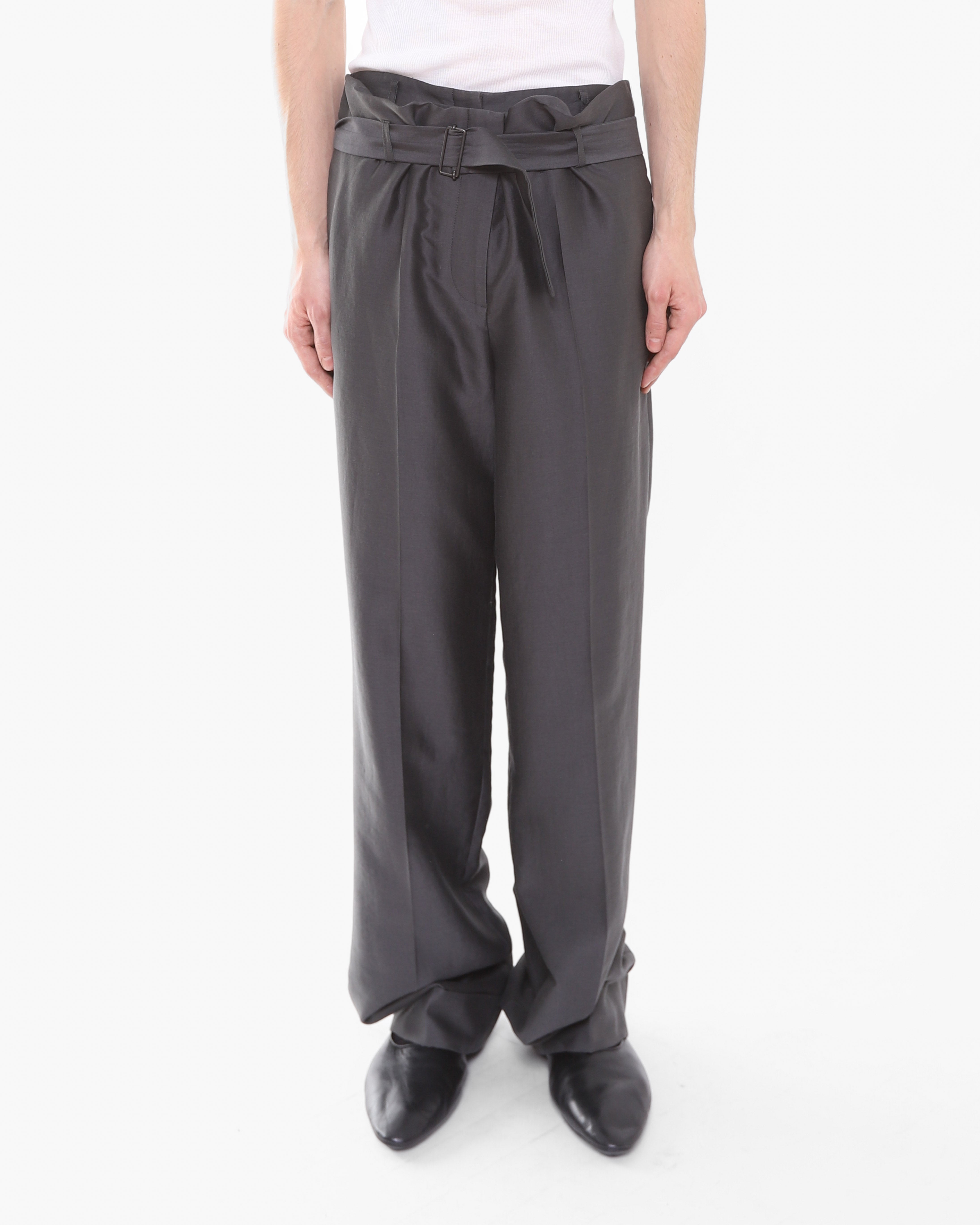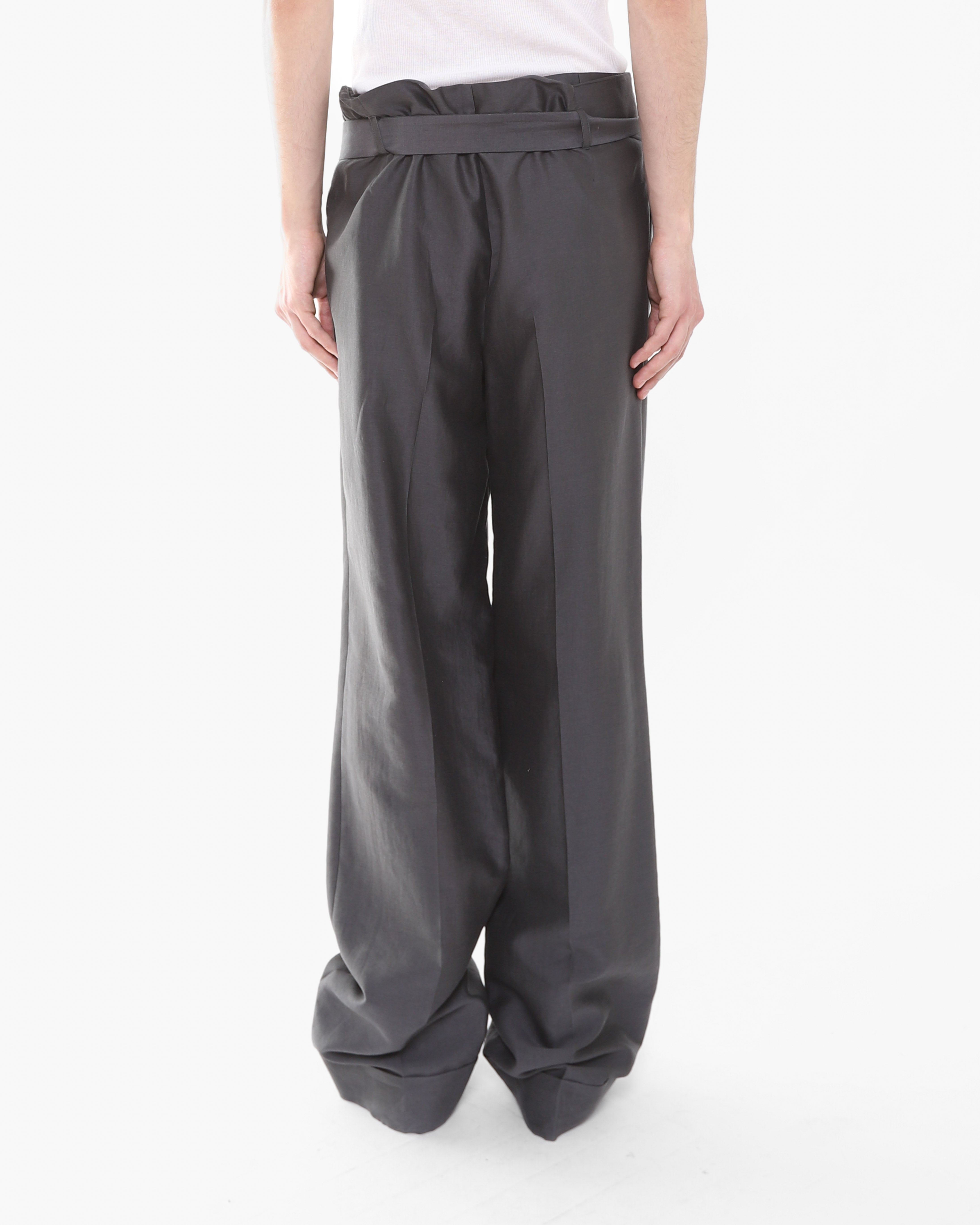 The trousers feature a signature double construction with a built-in short layer on the inside, showcasing the conceptual tailoring Haider became celebrated for. An adjustable waist belt allows for a customizable fit, while the relaxed leg is finished clean cuff at the hem. Understated yet considered in every detail.