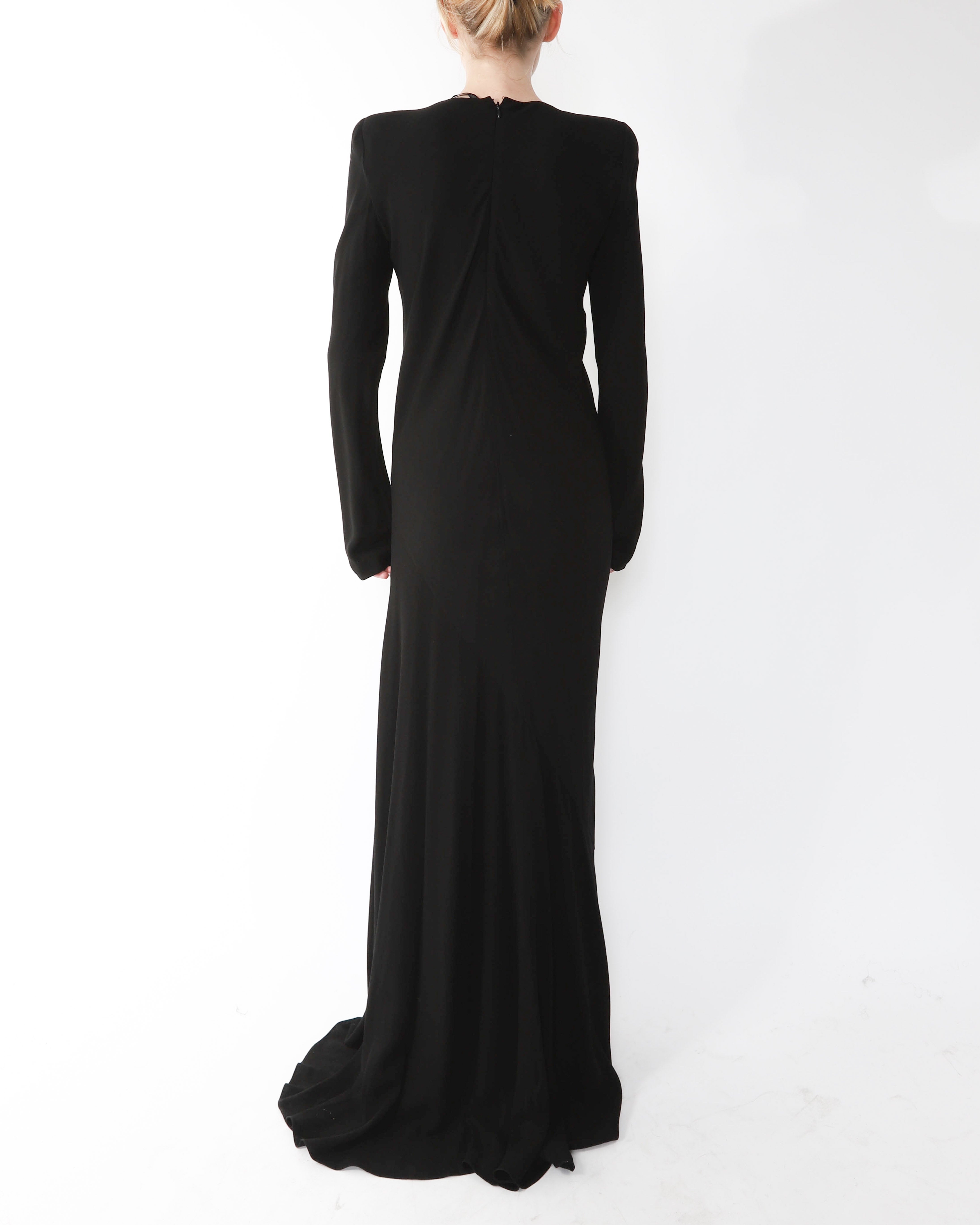 A deeply elegant piece from the FW17 collection. Crafted in a richly textured black viscose with a long length and softly rounded shoulders, the dress carries the fluid, considered silhouette that has come to define Ackermann's approach to womenswear.