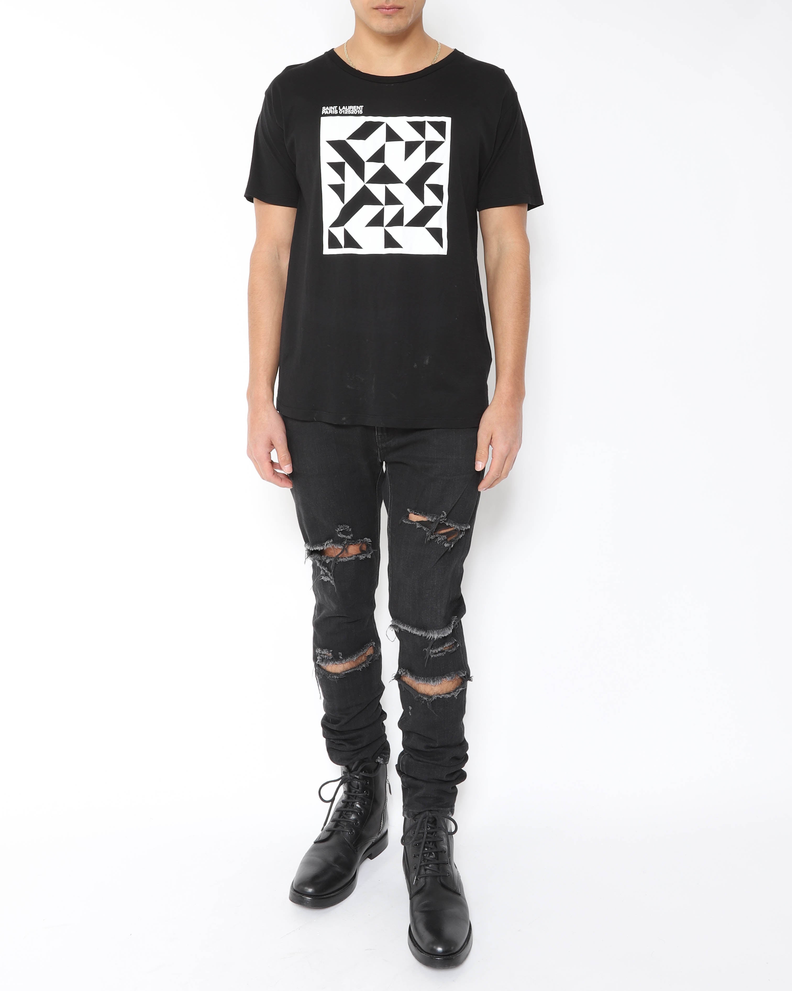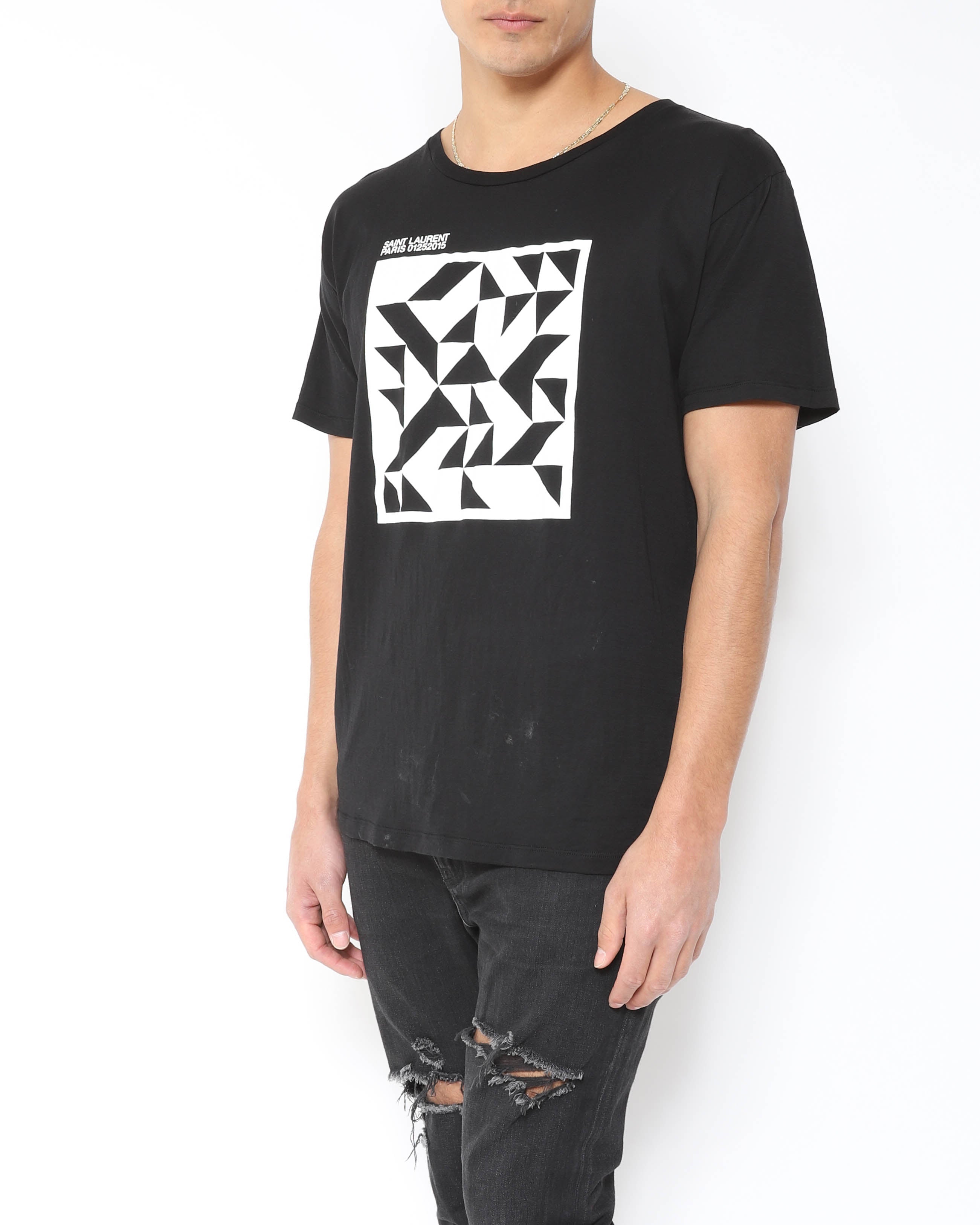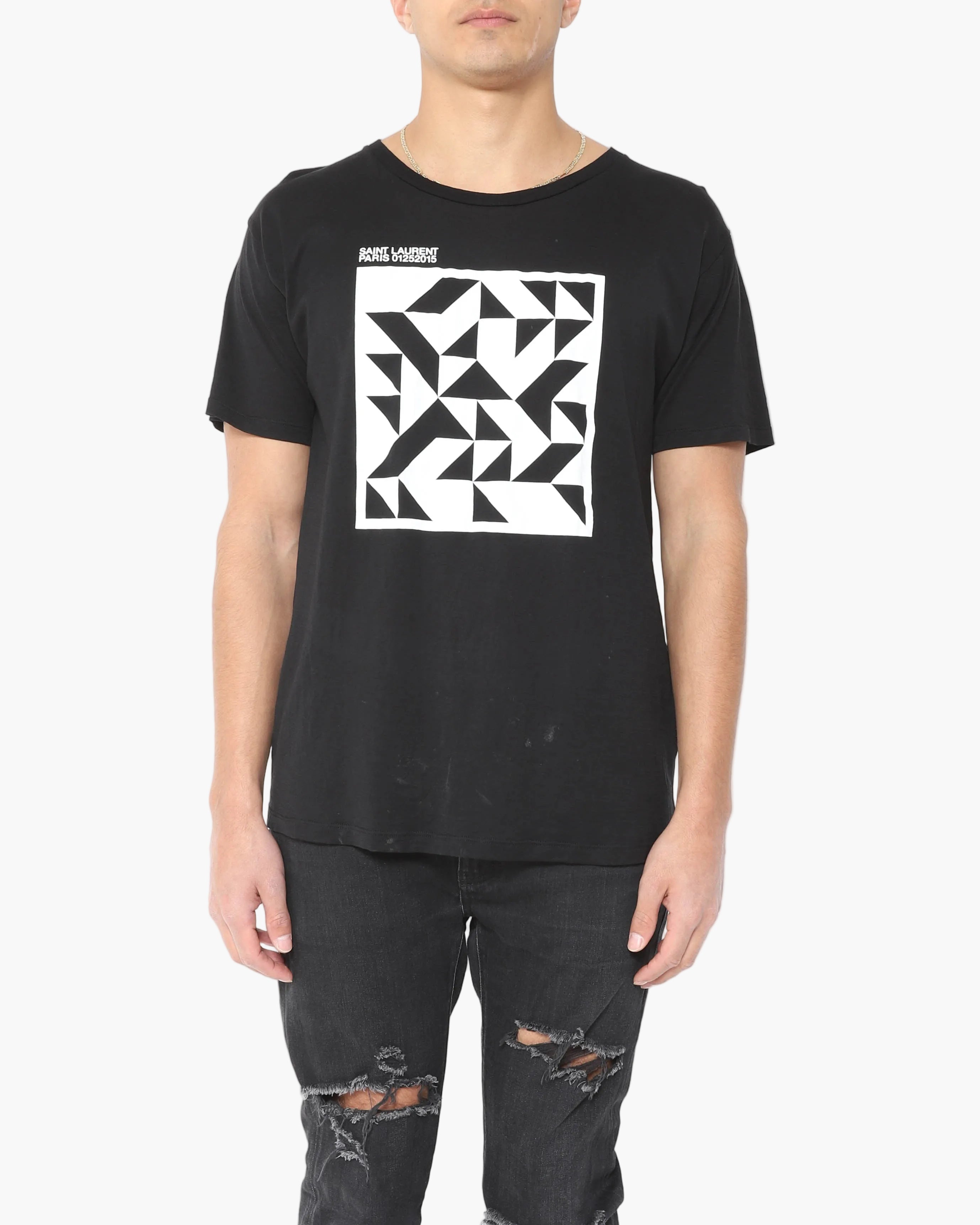 This Saint Laurent FW15 geometric print T shirt keeps things simple: a clean black base with a sharp, graphic pattern that adds interest without feeling loud. Designed under Hedi Slimane, it fits his Saint Laurent era of streamlined, rock leaning essentials with a polished edge. Easy to wear with denim, tailoring, or layered under a jacket when you want something more than a plain tee. Condition is pristine, like new.