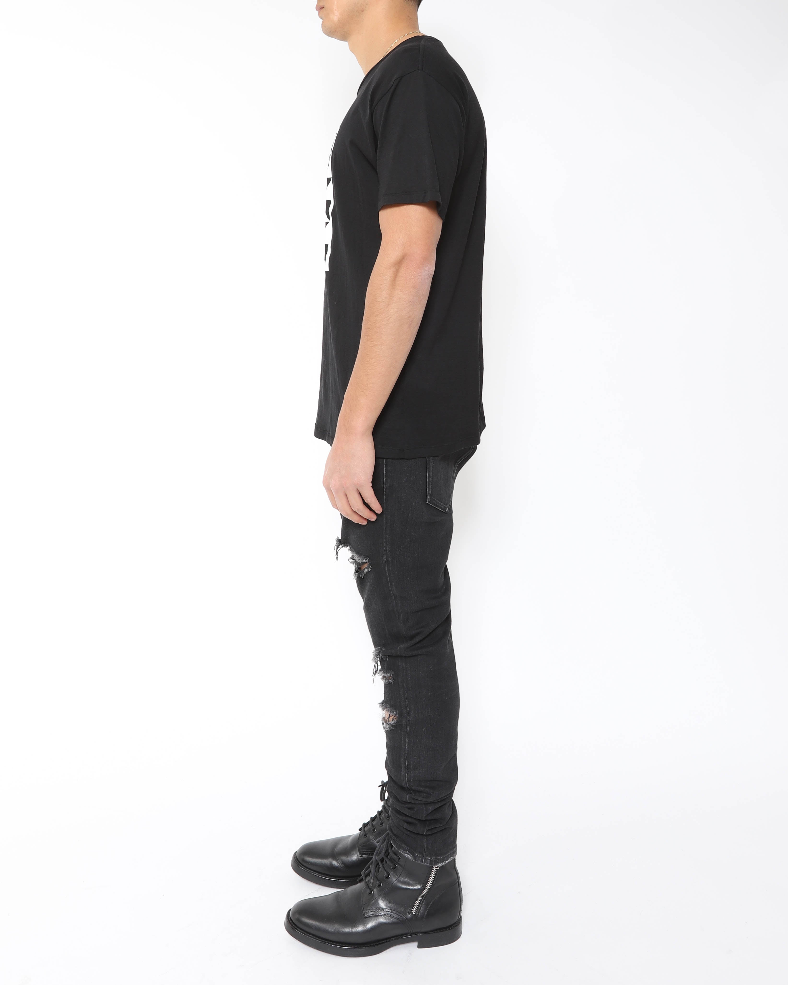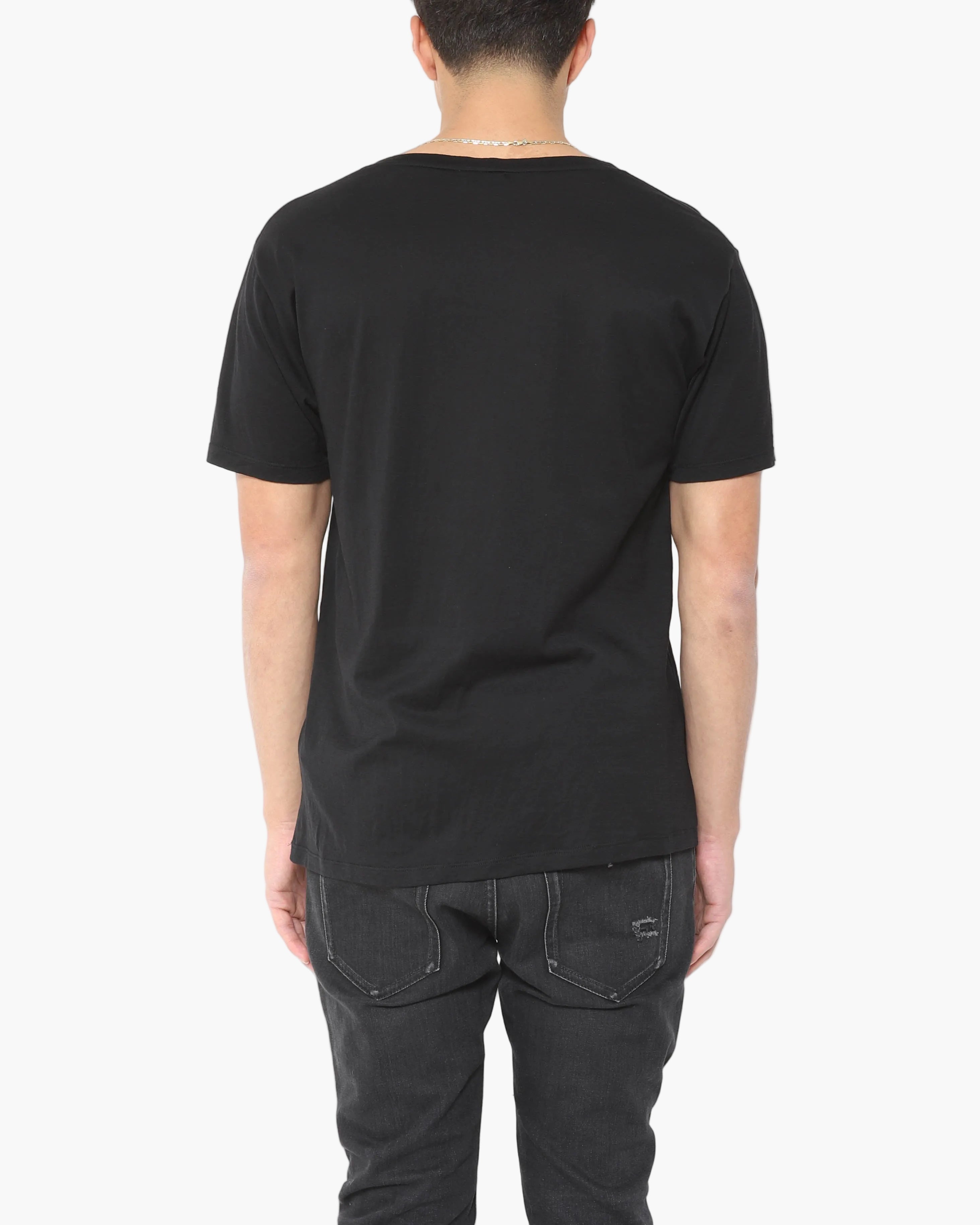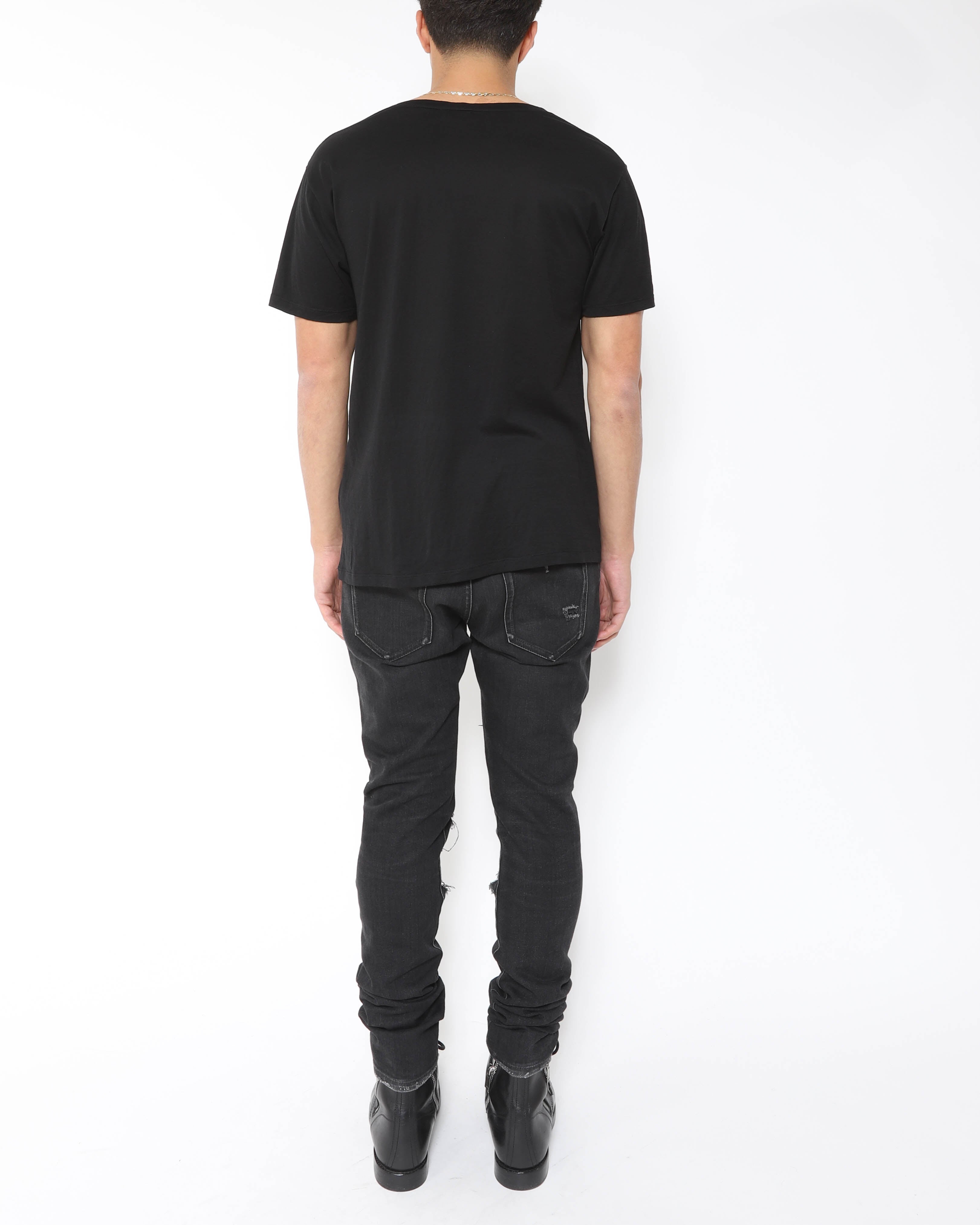 This Saint Laurent FW15 geometric print T shirt keeps things simple: a clean black base with a sharp, graphic pattern that adds interest without feeling loud. Designed under Hedi Slimane, it fits his Saint Laurent era of streamlined, rock leaning essentials with a polished edge. Easy to wear with denim, tailoring, or layered under a jacket when you want something more than a plain tee. Condition is pristine, like new.