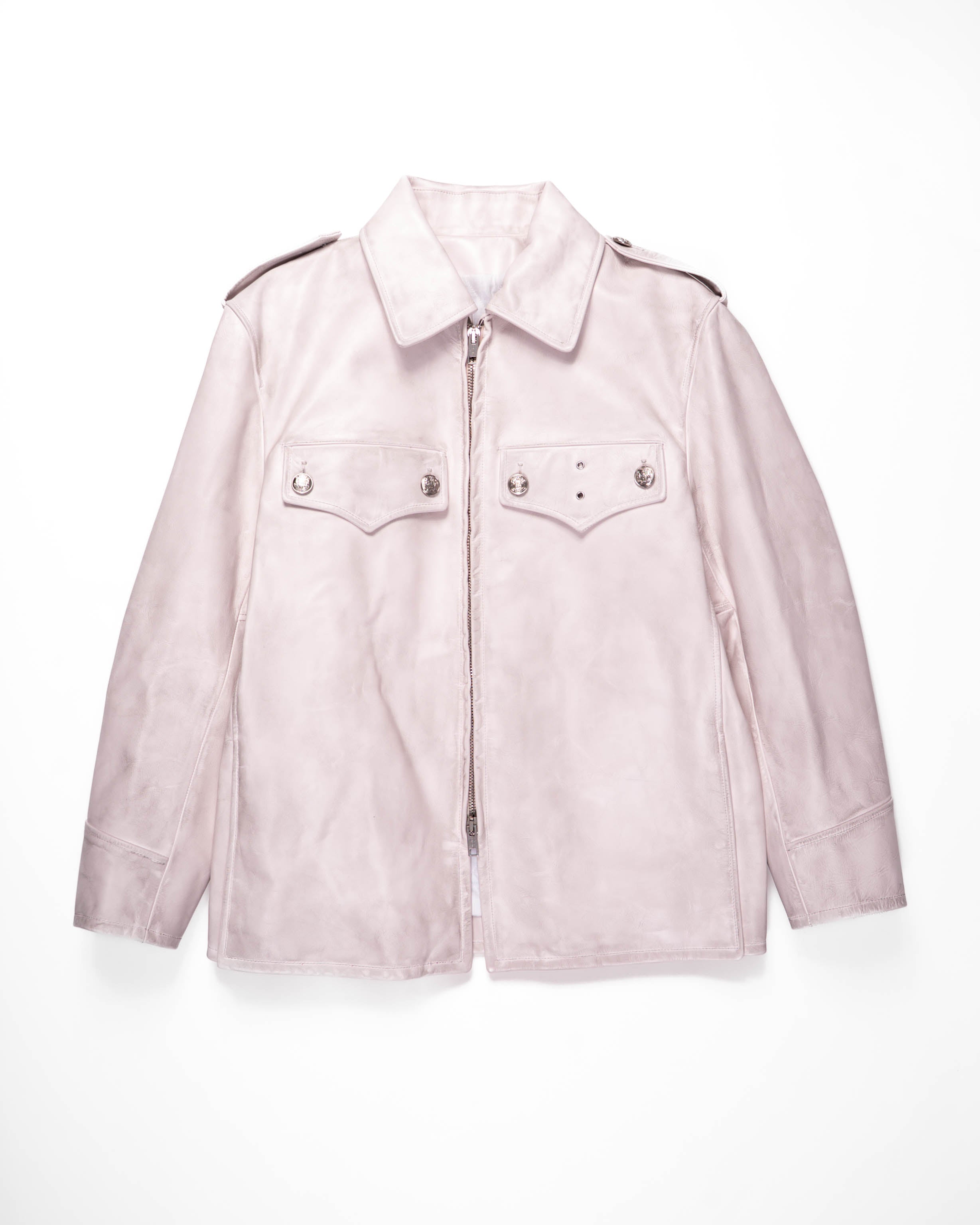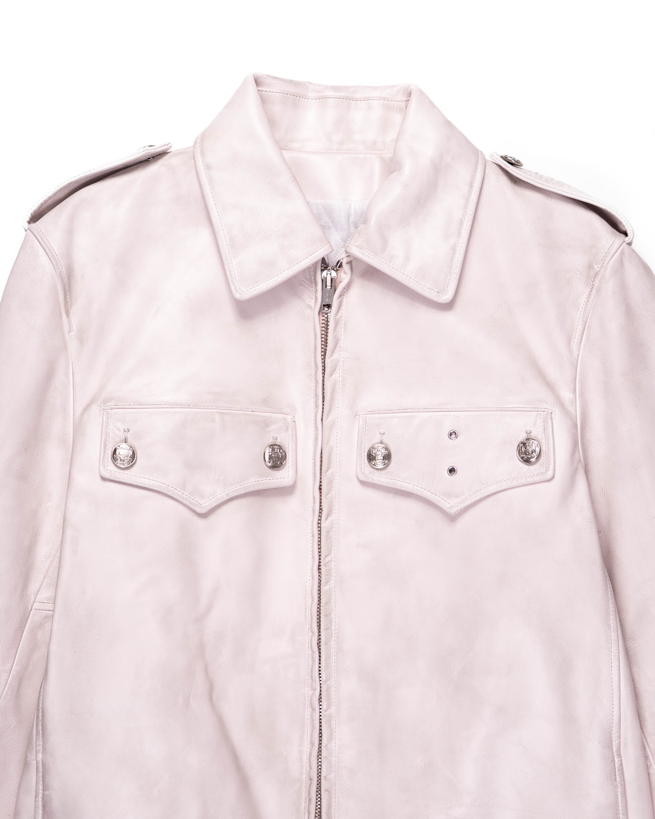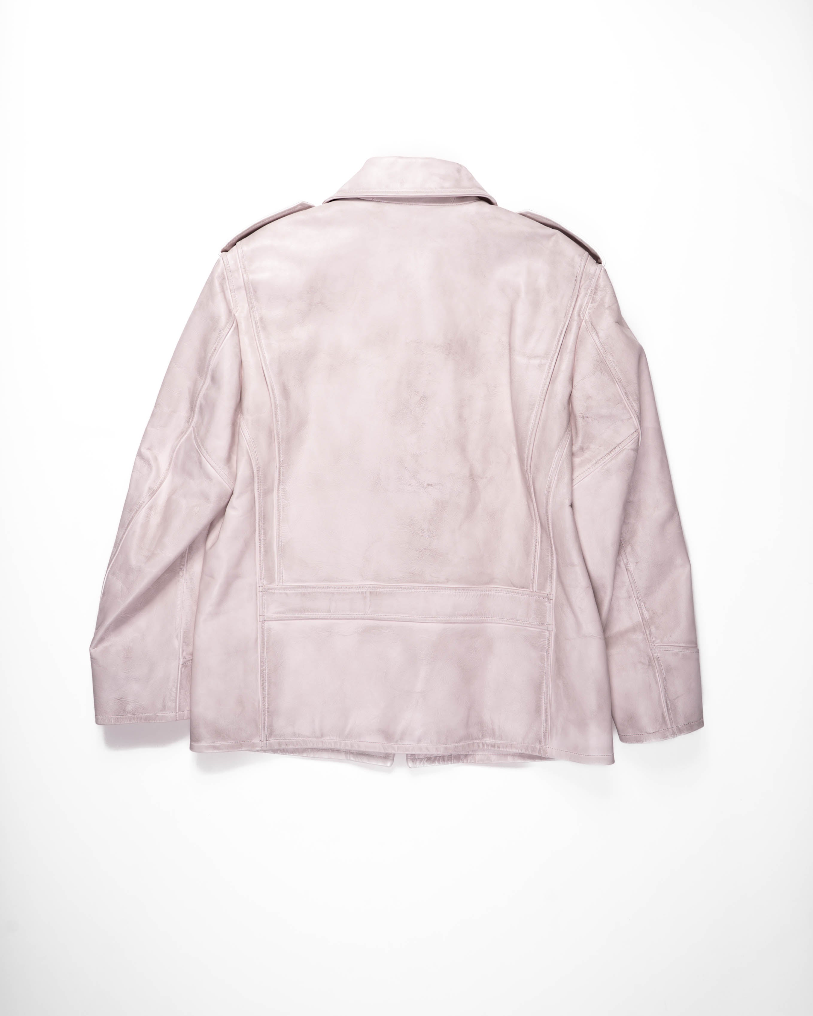 The pointed collar, flap chest pockets, and zip closure highlight the utilitarian origins of the piece, while the subtle weathering of the leather softens its authority, shifting the jacket into a more nuanced register. Its pale tone and finish give the garment both familiarity and subversion, making it stand apart from conventional interpretations of leather outerwear.