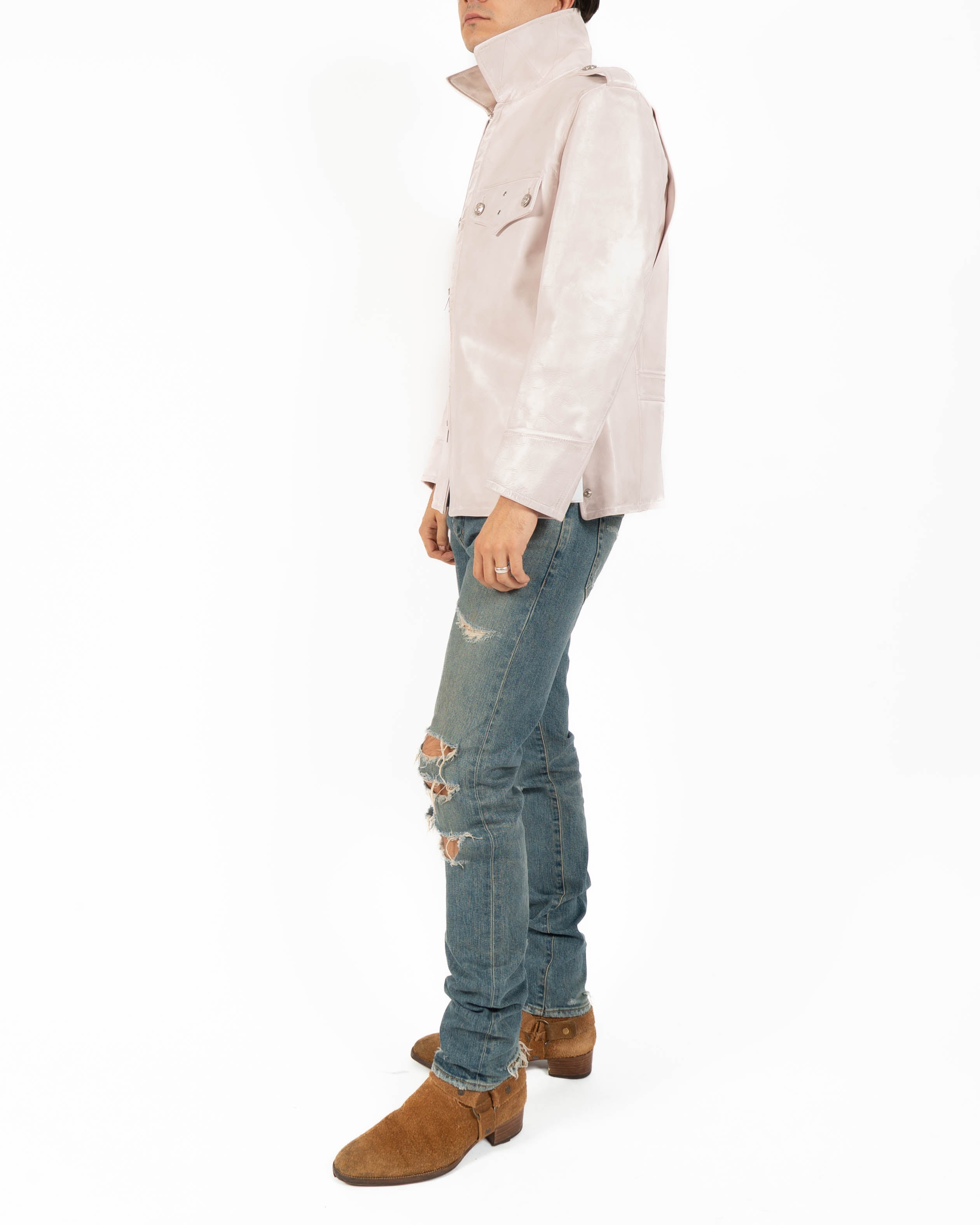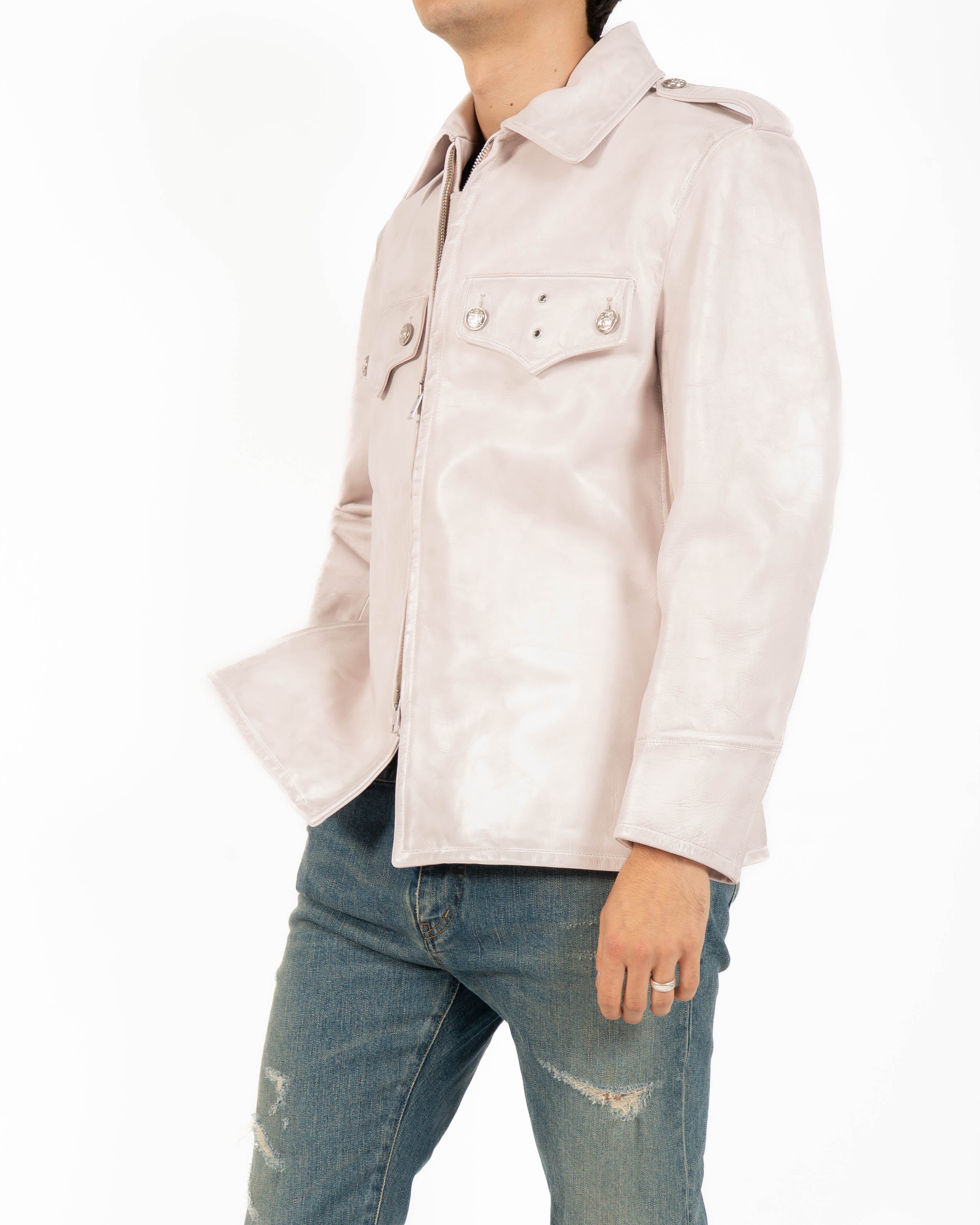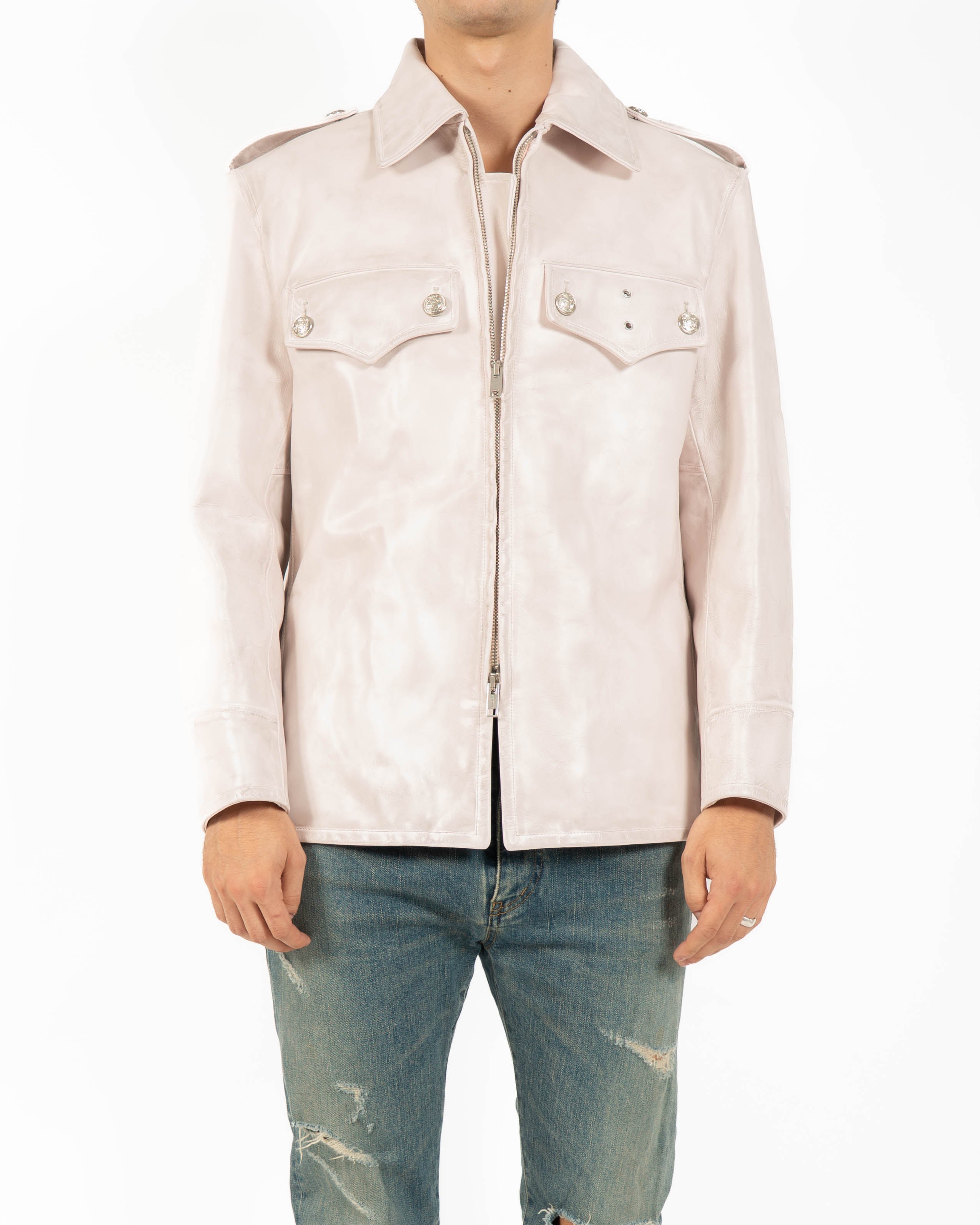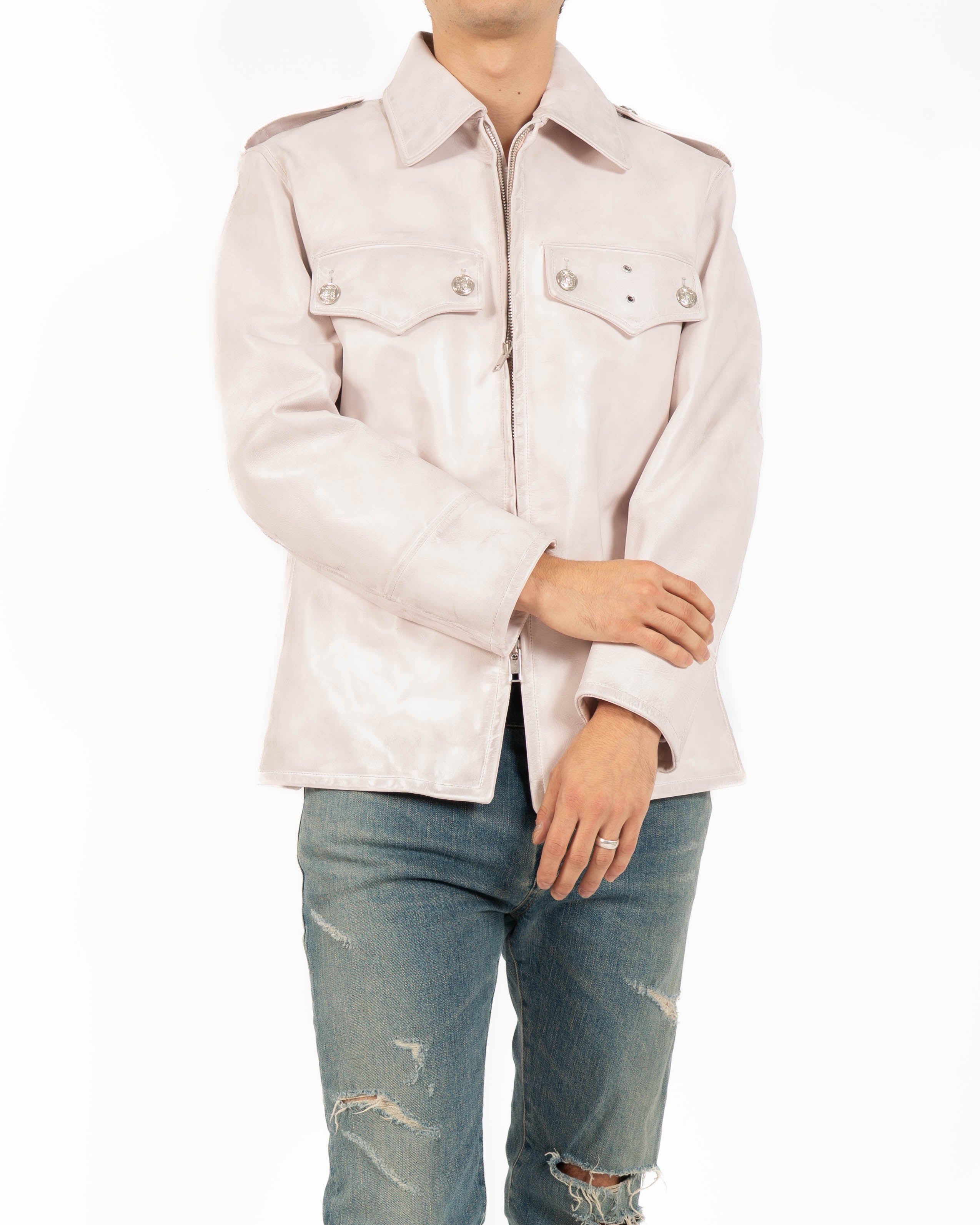 The pointed collar, flap chest pockets, and zip closure highlight the utilitarian origins of the piece, while the subtle weathering of the leather softens its authority, shifting the jacket into a more nuanced register. Its pale tone and finish give the garment both familiarity and subversion, making it stand apart from conventional interpretations of leather outerwear.