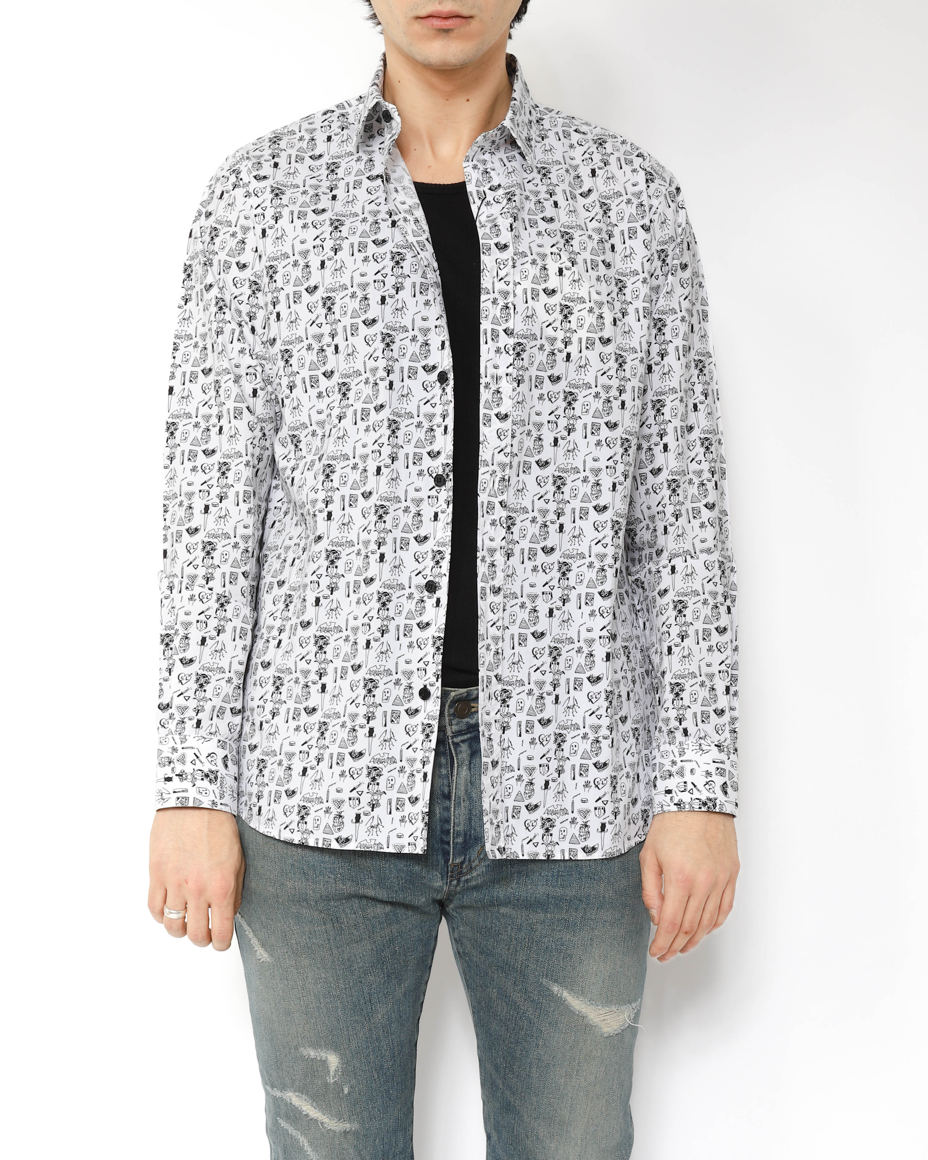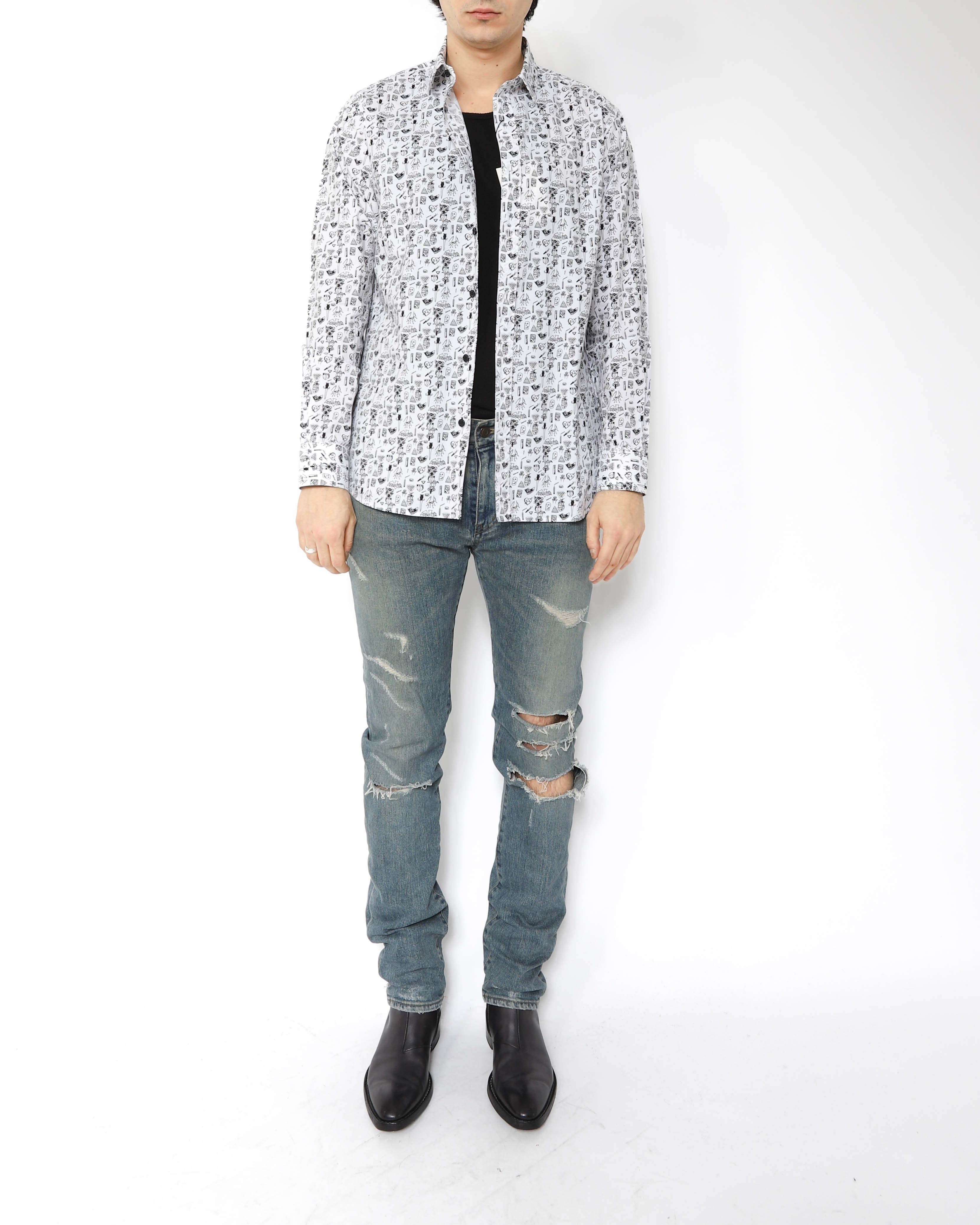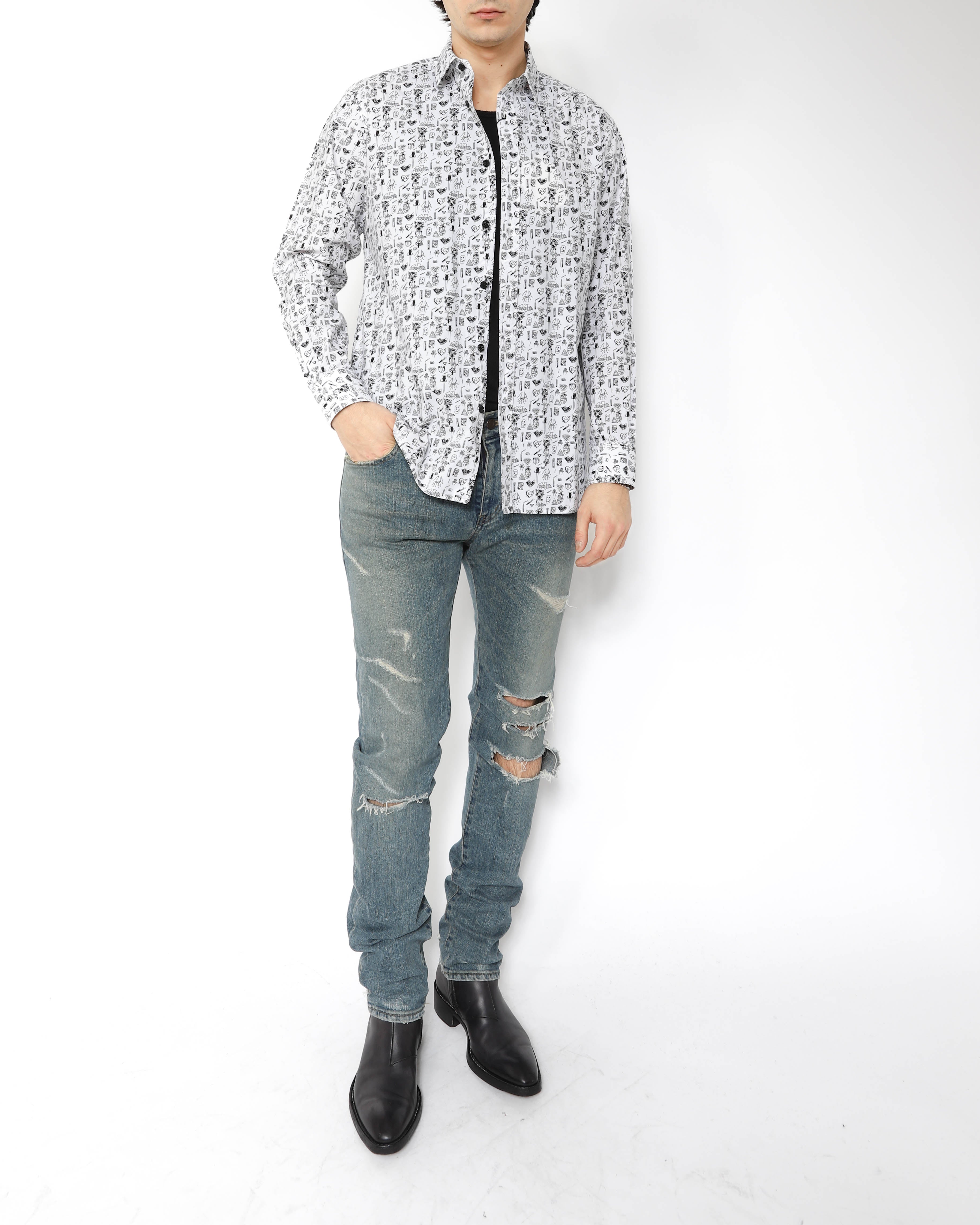 Hedi Slimane often played with playful graphics rooted in classic iconography throughout his Saint Laurent collections. This shirt from SS14 captures that spirit perfectly: a crisp cotton poplin base covered in an all-over symbol print that gives the piece a look that feels both lighthearted and sharply considered.