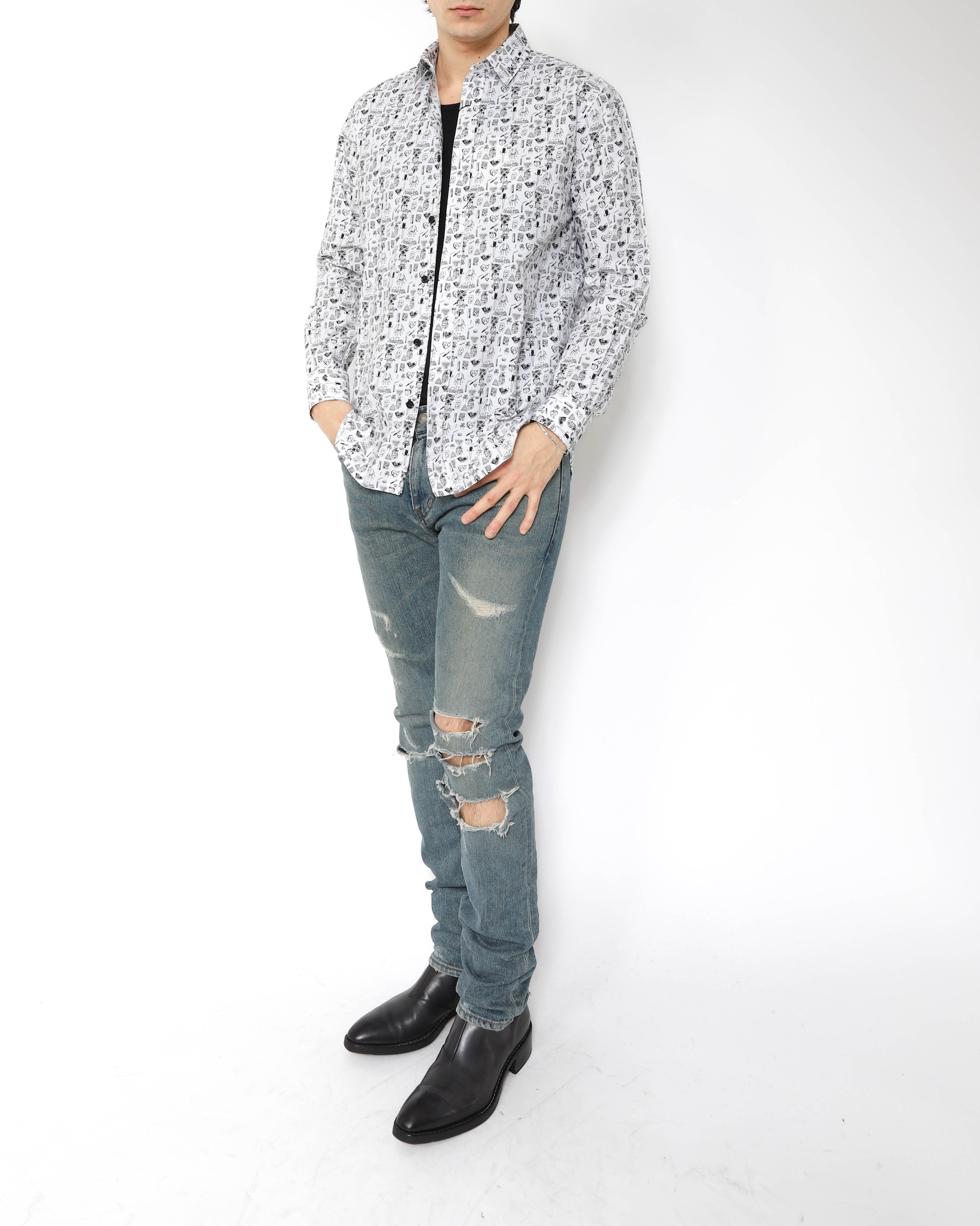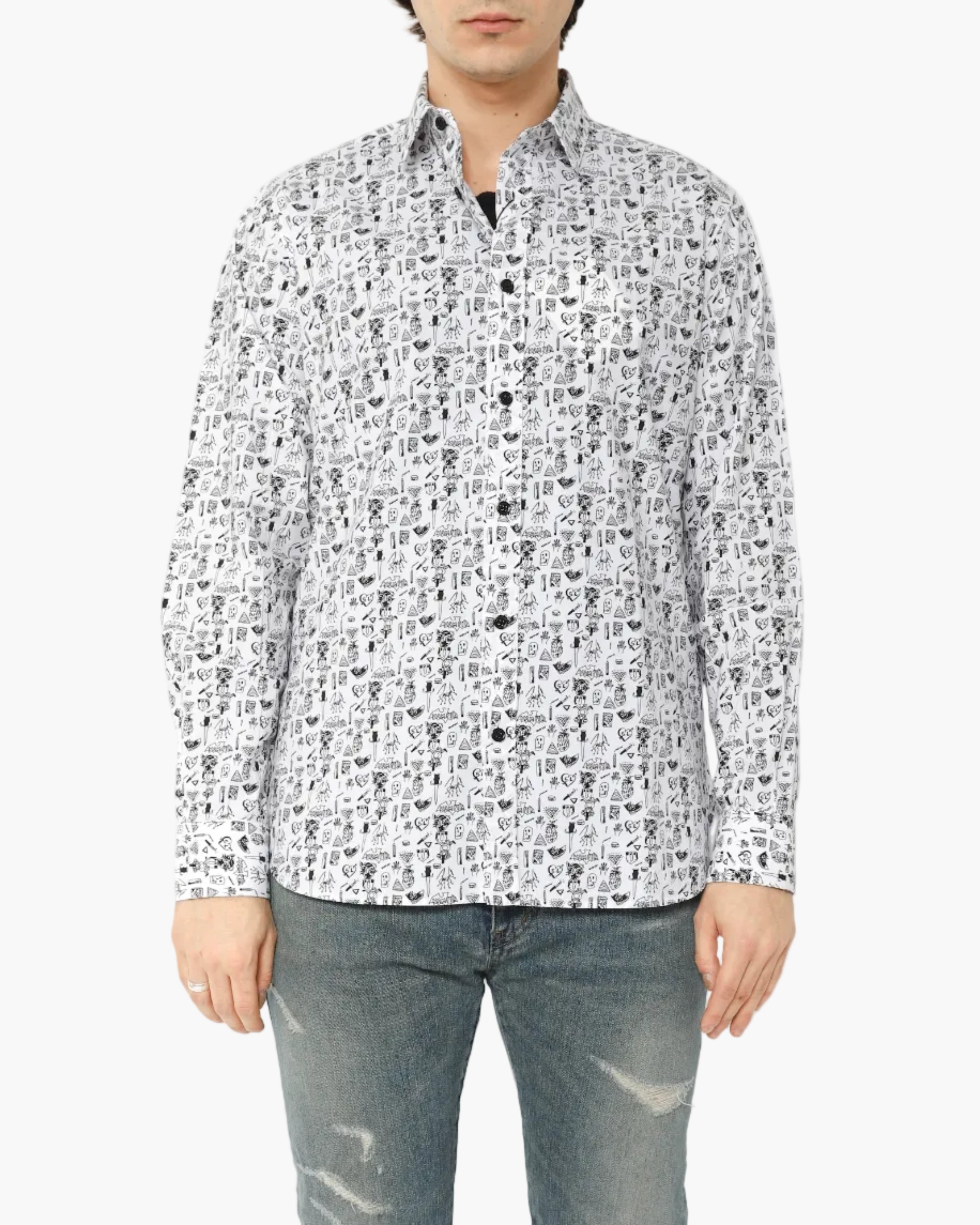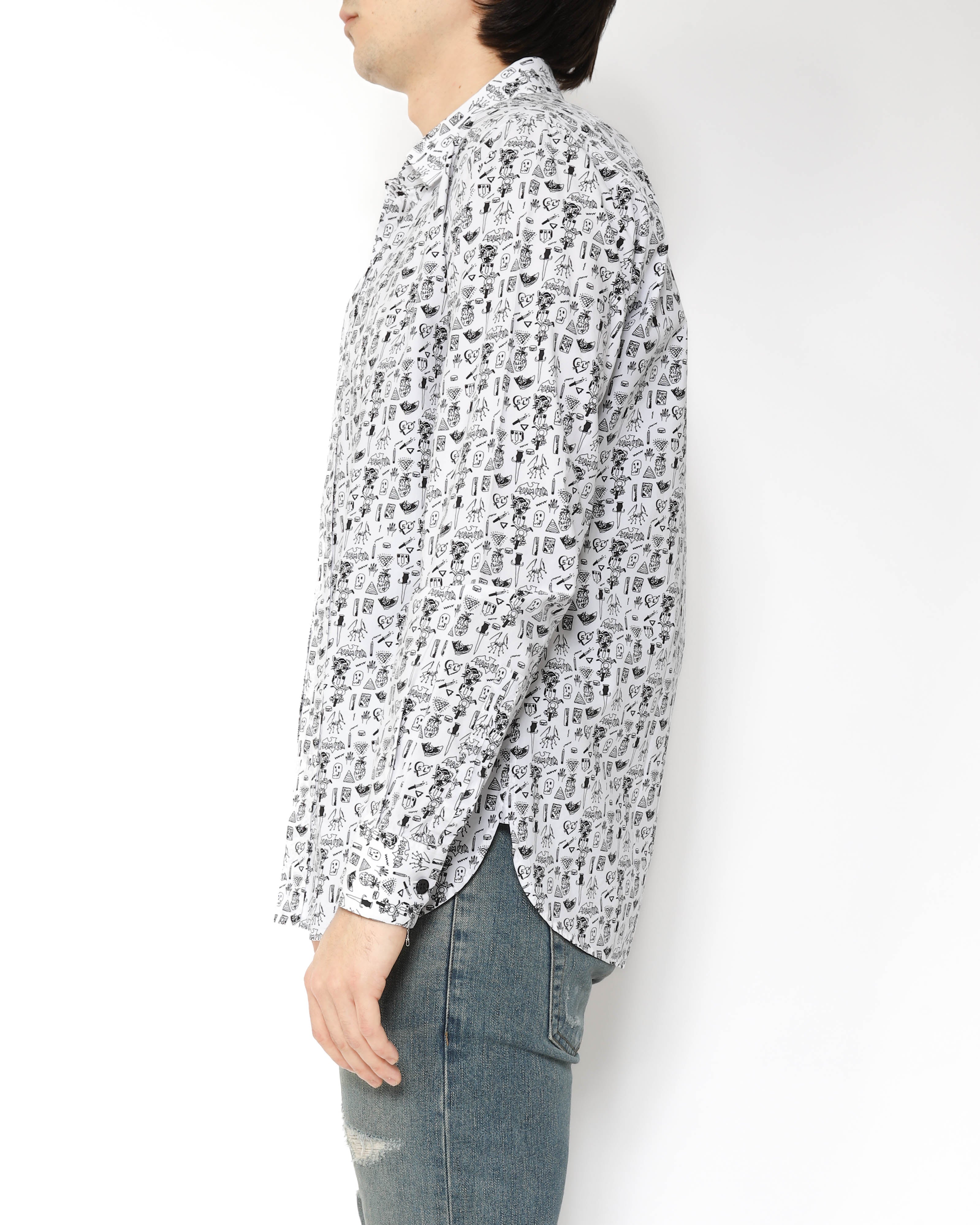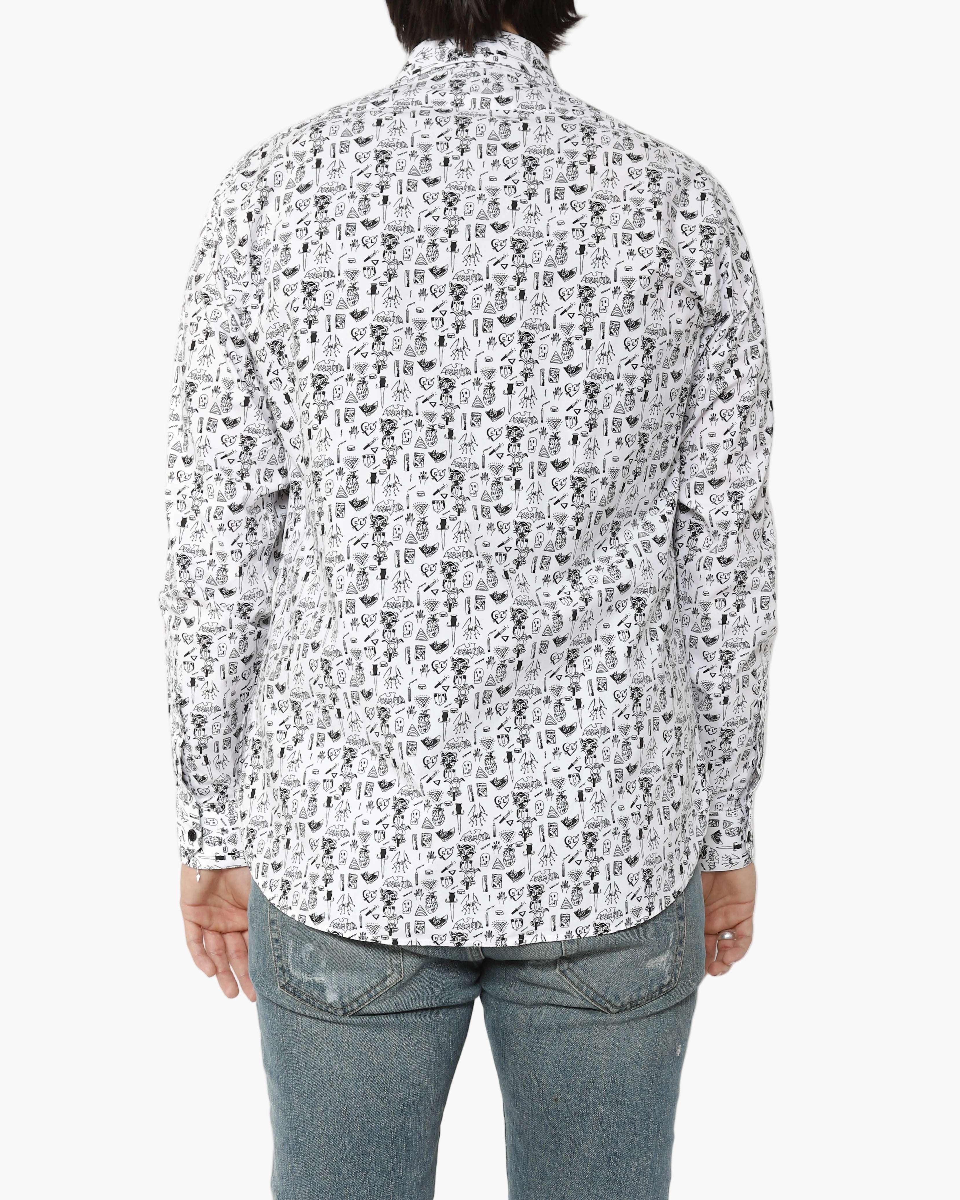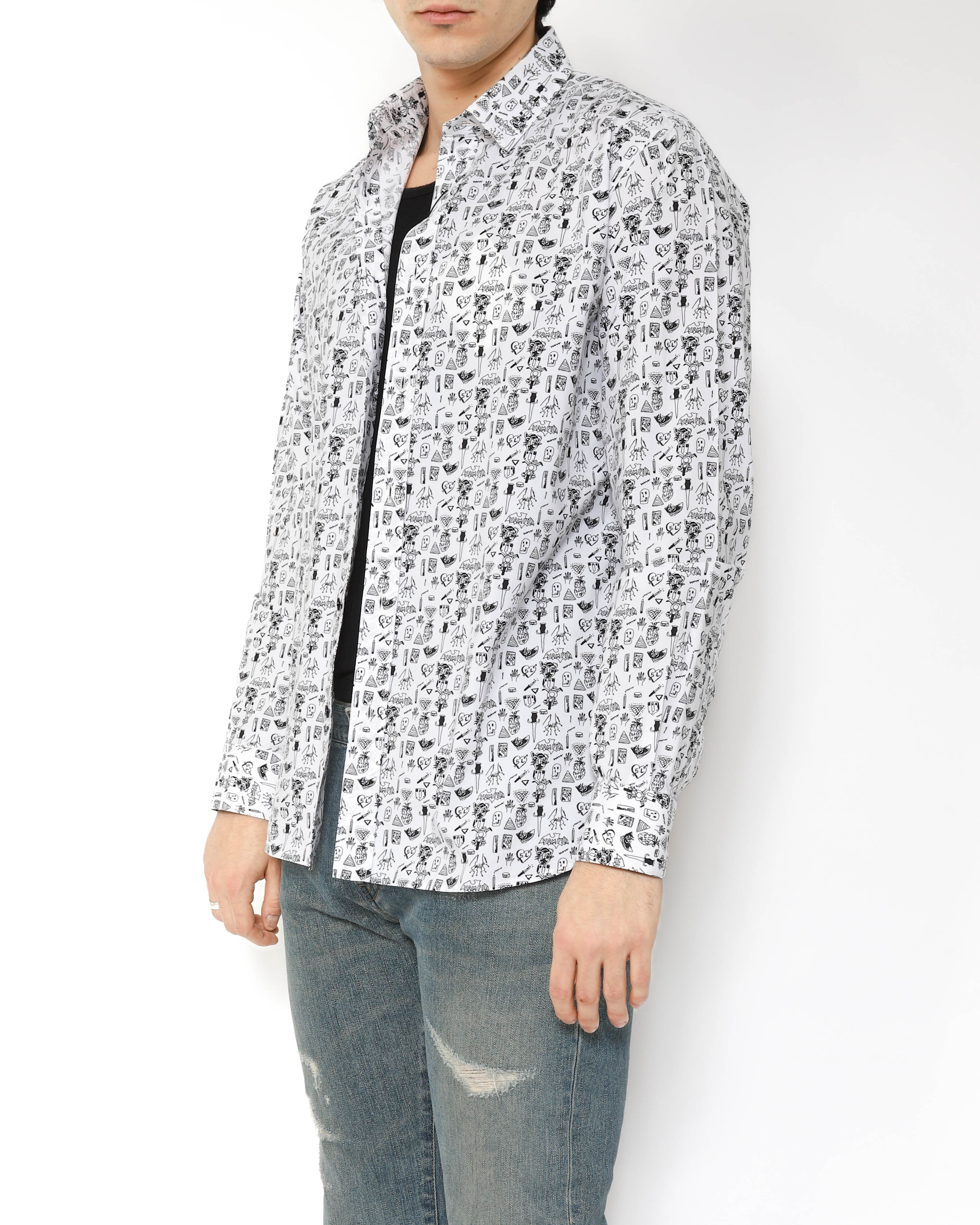 Up close, the details really reveal themselves - pineapples, skulls, knives, spiders, and more - scattered across the fabric like a visual collage. A strong statement shirt that still wears clean and easy, whether styled with denim for contrast or layered under tailoring for a sharper silhouette.